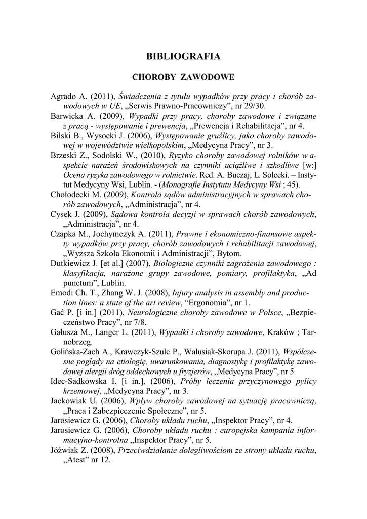 BIBLIOGRAFIA CHOROBY ZAWODOWE Agrado A. (2011), Świadczenia z tytułu wypadków przy pracy i chorób zawodowych w UE, „Serwis Prawno-Pracowniczy”, nr 29/30. Barwicka A. (2009), Wypadki przy pracy, choroby zawodowe i związane z pracą - występowanie i prewencja, „Prewencja i Rehabilitacja”, nr 4. Bilski B., Wysocki J. (2006), Występowanie gruźlicy, jako choroby zawodowej w województwie wielkopolskim, „Medycyna Pracy”, nr 3. Brzeski Z., Sodolski W., (2010), Ryzyko choroby zawodowej rolników w aspekcie narażeń środowiskowych na czynniki uciążliwe i szkodliwe [w:] Ocena ryzyka zawodowego w rolnictwie. Red. A. Buczaj, L. Solecki. – Instytut Medycyny Wsi, Lublin. - (Monografie Instytutu Medycyny Wsi ; 45). Chołodecki M. (2009), Kontrola sądów administracyjnych w sprawach chorób zawodowych, „Administracja”, nr 4. Cysek J. (2009), Sądowa kontrola decyzji w sprawach chorób zawodowych, „Administracja”, nr 4. Czapka M., Jochymczyk A. (2011), Prawne i ekonomiczno-finansowe aspekty wypadków przy pracy, chorób zawodowych i rehabilitacji zawodowej, „Wyższa Szkoła Ekonomii i Administracji”, Bytom. Dutkiewicz J. [et al.] (2007), Biologiczne czynniki zagrożenia zawodowego : klasyfikacja, narażone grupy zawodowe, pomiary, profilaktyka, „Ad punctum”, Lublin. Emodi Ch. T., Zhang W. J. (2008), Injury analysis in assembly and production lines: a state of the art review, “Ergonomia”, nr 1. Gać P. [i in.] (2011), Neurologiczne choroby zawodowe w Polsce, „Bezpieczeństwo Pracy”, nr 7/8. Gałusza M., Langer L. (2011), Wypadki i choroby zawodowe, Kraków ; Tarnobrzeg. Golińska-Zach A., Krawczyk-Szulc P., Walusiak-Skorupa J. (2011), Współczesne poglądy na etiologię, uwarunkowania, diagnostykę i profilaktykę zawodowej alergii dróg oddechowych u fryzjerów, „Medycyna Pracy”, nr 5. Idec-Sadkowska I. [i in.], (2006), Próby leczenia przyczynowego pylicy krzemowej, „Medycyna Pracy”, nr 3. Jackowiak U. (2006), Wpływ choroby zawodowej na sytuację pracowniczą, „Praca i Zabezpieczenie Społeczne”, nr 5. Jarosiewicz G. (2006), Choroby układu ruchu, „Inspektor Pracy”, nr 4. Jarosiewicz G. (2006), Choroby układu ruchu : europejska kampania informacyjno-kontrolna „Inspektor Pracy”, nr 5. Jóźwiak Z. (2008), Przeciwdziałanie dolegliwościom ze strony układu ruchu, „Atest” nr 12. 104 BIBLIOGRAFIA Juszczyk M., Wysokiński M. (red.), (2012), Selected medical problems of the 21st century man, “Kieleckie Towarzystwo Edukacji Ekonomicznej”, Kielce. Kieć-Świerczyńska M., Kręcisz B., Chomiczewska D. (2009), Zawodowe kontaktowe zapalenie skóry u fryzjerów, „Medycyna Pracy”, nr 5. Kieć-Świerczyńska M., Chomiczewska D., Kręcisz B. (2010), Praca w środowisku mokrym : istotna przyczyna dermatoz zawodowych, „Praca i Zdrowie”, nr 12. Kieć-Świerczyńska M., Chomiczewska D., Kręcisz B. (2010), Wet work praca w środowisku mokrym, „Medycyna Pracy”, nr 1. Kieć-Świerczyńska M. (red.), (2010), Zasady diagnostyki, orzecznictwa i profilaktyki chorób zawodowych skóry, „Instytut Medycyny Pracy im. prof. J. Nofera w Łodzi”, Łódź. Kiersztyn B. (2007), Choroby zawodowe lekarzy, „Praca i Zdrowie”, nr 10. Kowal E. (2008), Dolegliwości zdrowotne a warunki pracy, „Oficyna Wydawnicza Uniwersytetu Zielonogórskiego”, Zielona Góra. Kozela R. (2008), Za mało nowotworów, „Atest”, nr 4. Kręcisz B., Kieć-Świerczyńska M., Chomiczewska D. (2010), Profilaktyka chorób zawodowych skóry, „Praca i Zdrowie”, nr 11. Krzyczmanik D. [i in.] (2011), Borelioza i kleszczowe zapalenie mózgu jako współistniejące choroby zawodowe - opis przypadku klinicznego, „Medycyna Pracy”, nr 3. Krzyczmanik D. [i in.] (2012), Borelioza w praktyce lekarza medycyny pracy, „Medycyna Pracy”, nr 4. Kurpiewska J., Liwkowicz J. (2011), Występowanie zawodowych chorób skóry w Unii Europejskiej, „Bezpieczeństwo Pracy”, nr 6. Kurpiewska J., Liwkowicz J.(2011), Zawodowe choroby skóry rąk. - Cz. 1-2, „Przyjaciel przy Pracy”, nr 5. Lach D. E., Samol S., Ślebzak K. (2010), Ustawa o ubezpieczeniu społecznym z tytułu wypadków przy pracy i chorób zawodowych : komentarz, „Wolters Kluwer Polska”, Warszawa. Lipińska J., Walusiak-Skorupa A. (2010), Astma u osób zawodowo sprzątających : nowy problem medycyny pracy? „Praca i Zdrowie”, nr 10. Majczak W. [i in.] (2005), Wypadki i choroby zawodowe rolników oraz starania Kasy Rolniczego Ubezpieczenia Społecznego na rzecz bezpieczeństwa pracy rolników podczas eksploatacji techniki rolniczej, w tym - podczas gospodarczej obróbki drewna, „Zastosowanie Ergonomii”, nr 4. Majka M. (2010), Ułomny wykaz chorób zawodowych, „Atest”, nr 10. Majka M. (2010), Kleszcze coraz groźniejsze, „Atest”, nr 7. Małysz F. (2011), Postępowanie w sprawach chorób zawodowych, „Służba Pracownicza”, nr 9. BIBLIOGRAFIA 105 Marszałek S. [et al.], 2010, Diagnostyka fizjoterapeutyczna i osteopatyczna w zawodowych zaburzeniach głosu, „Medycyna Pracy”nr 2. Matuszewski K. (2009), Wypadki i choroby zawodowe w górnictwie, „Bezpieczeństwo Pracy”, nr 6. Matuszewski K., Kalus A. (2010), Zachorowalność na pylicę płuc w górnictwie węgla i skuteczność działań profilaktycznych, „Bezpieczeństwo Pracy”, nr 2. Niebudek-Bogusz E. (2009), Postępowanie w dysfoniach zawodowych w krajach Unii Europejskiej i na świecie, „Medycyna Pracy”, nr 2. Niedzielska M. (2011), Choroby zawodowe, „Przyjaciel przy Pracy”, nr 9. Nikołajew J., Leśniewska G. (2008), Społeczny i ekonomiczny wymiar zagrożeń zawodowych w morskim środowisku pracy, „Studia i Prace Wydziału Nauk Ekonomicznych i Zarządzania / Uniwersytet Szczeciński”, nr 7. Piątkowska A., Szymańska J., (2009), Choroby zawodowe i parazawodowe układu ruchu u stomatologów, „Zdrowie Publiczne”, nr 2. Pióro J. (2008), Choroby spawacza, „Praca i Zdrowie”, nr 6. Pióro J. (2009), Choroby zaw