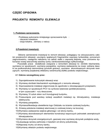 CZĘŚĆ OPISOWA PROJEKTU REMONTU ELEWACJI 1. Podstawa opracowania. Podstawą wykonania niniejszego opracowania było : - zlecenie inwestora - wizja lokalna , obmiary z natury - 2.Przedmiot inwestycji. Główne zamierzenie inwestycji to remont elewacji, polegający na odczyszczeniu całości powierzchni elewacji, usunięciu spękanych fragmentów wyprawy tynkarskiej, ponownym zagruntowaniu, następnie nałoŜeniu na całość siatki z zaprawą klejową, oraz ponowne wykonanie nowej wierzchniej warstwy tynku cienkowarstwowego sylikonowego. Pozostałe prace dodatkowe związane z remontem elewacji to: obróbki blacharskie, wymiana rur spustowych, wymiana parapetów, wymiana zadaszenia na nowe: szklane daszki na podkonstrukcji samonośnej (produkt gotowy), wymiana skorodowanych skrzynek rewizyjnych, wymianę popękanej okładziny ceramicznej (kafle) podestu wejściowego. 2.1 Zakres szczegółowy prac: 1) 2) 3) 4) Zaprojektowanie kolorystyki elewacji wraz Wymianę obróbek blacharskich wynikających z remontu elewacji, Doprowadzenie instalacji odgromowej do zgodności z obowiązującymi przepisami, Wymianę rur spustowych PCV na cynkowo-tytanowe (prefabrykowane), w tym czyszczaki i rury deszczowe, 5) Wymianę 10 sztuk okien na 6 kondygnacji budynku, 6) Przesunięcie pod warstwy izolacji wszelkich instalacji np. klimatyzatory, instalacje elektryczne, 7) Wymianę parapetów, 8) Wymiana/likwidacja oświetlenia logo Oddziału na ścianie czołowej budynku, 9) Zmianę połoŜenia instalacji alarmowej (z czołowej ściany na boczną), 10) Wymiana zadaszenia wejścia głównego i od strony banku, 11) Wymianę skorodowanych elementów konstrukcji wsporczych jednostek zewnętrznych klimatyzatorów, 12) Wymiana skrzynek energetycznych, gazowej oraz wymianę skrzynek podejścia wody, 13) Likwidację oprawy parkowej z masztem od strony południowej, 14) Naprawę murku od strony banku, 15)Wymianę okładzin podestu wejściowego. 3. Projektowane zagospodarowania terenu. Nie projektuje się zmian w zagospodarowaniu działki 128/5. 4. Pozostałe ustalenia. Teren działki podlega ochronie konserwatorskiej . 5.Opis stanu istniejącego elewacji: W chwili obecnej powierzchnia elewacji znajduje się w złym stanie technicznym, występują liczne spękania warstwy wierzchniego tynku akrylowego, fragmenty-połacie zwietrzałych i odparzonych wierzchnich warstw struktury, w rejonach naroŜy ościeŜy okiennych rozwarstwienia i rysy wynikające najprawdopodobniej ze złego i niewłaściwego wykonania zbrojenia siatką tych elementów elewacji, takŜe występują ogniska zagrzybień i pokrycia glonami ( szczególnie od strony północno-wschodniej), stwierdzono równieŜ drobne uszkodzenia mechaniczne . Na podstawie dokonanych odkrywek, stwierdzono , Ŝe warstwa izolacji termicznej jest wystarczająco dobrze na dzień dzisiejszy umocowana do muru-ściany właściwej budynku, i nie zachodzi potrzeba zrywania i wymiany wszystkich warstw ocieplenia, zaleca się natomiast kompleksową renowację warstw wierzchnich poczynając od ponownego zazbrojenia siatką elewacji i nałoŜenia nowego tynku cienkowarstwowego, w miejscach wątpliwych i najbardziej naraŜonych na ponowne spękania, takich jak naroŜa budynku, uwidocznione nieprawidłowe łączenia płyt styropianowych (brak mijanki i zakładek rzędów następujących po sobie) sugeruje się prewencyjne wstrzyknięcie dodatkowej masy klejowej pod docieplenie metodą iniekcji. Szczegółowy zakres i sposób przeprowadzenia prac zawiera opis poniŜej oraz Specyfikacja Wykonania i Odbioru Robót Budowlanych będąca integralną częścią opracowania. - - Na podstawie dokonanych oględzin stwierdzono: korozję parapetów , ich powyginanie i nie trzymanie równej linii pogięte fragmenty obróbek blacharskich i opierzeń gzymsów i szczytów ścianek attykowych korozję części wsporników jednostek klimatyzacyjnych korozję metalowych skrzynek zamykających dojścia do urząŚciany zewnętrzne naleŜy przygotować do remontu poprzez dezynfekcję elewacji północno-zachodniej-od ul. Podgórnej, środkiem do neutralizacji grzybów, oraz oczyszczenie powierzchni i usunięcie warstw zwietrzałych i odparzonych szczotkami drucianymi, szpachelkami itp. a następnie zmycie wodą pod ciśnieniem urządzenie typu Kärher lub o porównywalnym ciśnieniu strumienia wodydzeń technicznych nieszczelność wskazanych przez inwestora okien odparzoną okładzinę ceramiczną podestu i schodów tylnego wejścia zbyt małą średnicę przewodów odgromowych zainstalowanych obecnie na dachu 6.Opis stanu projektowanego elewacji: 6.1 Ogólne wykończenia zewnętrzne: elewacje: wyprawy systemowe silikonowe ,np. system typu Fast lub równowaŜny tkzw. „baranek” grubość ziarna 2 mm kolory: D 57 – ciemny szaro popielaty 21% powierzchni wg rysunków D 56 – jasny szaro popielaty 79 % powierzchni wg rysunków FG 16 (cokół) – ciemno szaro grafitowy Uwaga!! : PRZED OSTATECZNYM WYKONANIEM ELEWACJI NALEśY WYKONAĆ PRÓBĘ KOLORÓW NA POW.1x1m I UZYSKAĆ ZATWIERDZENIE PRZEZ PROJEKTANTA ! obróbki blacharskie : blacha tytan-cynk rynny i rury spustowe : tytanowo – cynkowe okładziny kamienne parapety : szary granit płomieniowany , płyty gr. 2 cm : blacha stalowa malowana proszkowo na kolor biały stalowe z blachy 0,75 mm, malowane proszkowo, o prostokątnym profilu krawędzi ( typu DEX lub równowaŜne) na zamówienie niestandardowe, ciągłe łączone po przez łączniki systemowe (schemat podziału rysunek 14) zobowiązuje się wykonawcę do indywidualnego domierzenia w trakcie prac kaŜdej partii lub zrobienia szablonów na wycięcia pod filarki specyfikacja _wymiary „brutto” z naddatkiem: głębokość brutto ca. 50 cm: 28 szt._ 1 mb 3 szt._ 2 mb 66 szt._ 3 mb 6 szt._ 4 mb 2 szt._ 5 mb głębokość brutto 18-20 cm: 38 szt._ 1 mb 20 szt._ 1,5 mb 6.2 Szczegółowy opis pac zewnętrznych: INTEGRALNĄ CZĘŚCIĄ OPRACOWANIA JEST SPECYFIKACJA WYKONANIA I ODBIORU PRAC BUDOWLANYCH, ZOB