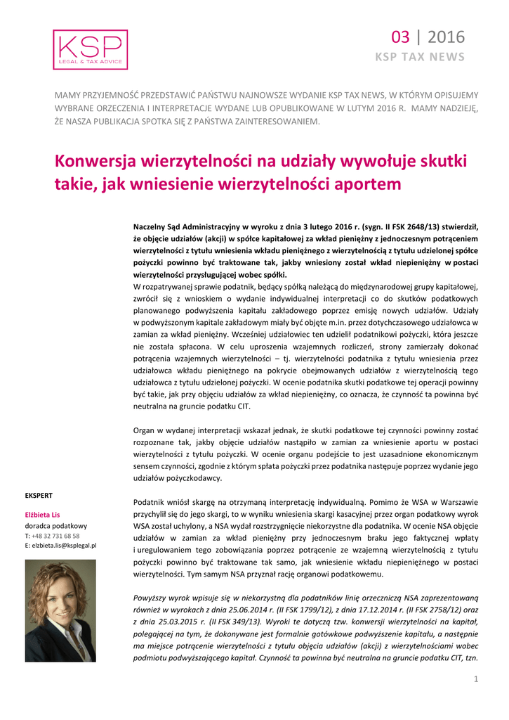 03 | 2016 KSP TAX NEWS MAMY PRZYJEMNOŚĆ PRZEDSTAWIĆ PAŃSTWU NAJNOWSZE WYDANIE KSP TAX NEWS, W KTÓRYM OPISUJEMY WYBRANE ORZECZENIA I INTERPRETACJE WYDANE LUB OPUBLIKOWANE W LUTYM 2016 R. MAMY NADZIEJĘ, ŻE NASZA PUBLIKACJA SPOTKA SIĘ Z PAŃSTWA ZAINTERESOWANIEM. Konwersja wierzytelności na udziały wywołuje skutki takie, jak wniesienie wierzytelności aportem Naczelny Sąd Administracyjny w wyroku z dnia 3 lutego 2016 r. (sygn. II FSK 2648/13) stwierdził, że objęcie udziałów (akcji) w spółce kapitałowej za wkład pieniężny z jednoczesnym potrąceniem wierzytelności z tytułu wniesienia wkładu pieniężnego z wierzytelnością z tytułu udzielonej spółce pożyczki powinno być traktowane tak, jakby wniesiony został wkład niepieniężny w postaci wierzytelności przysługującej wobec spółki. W rozpatrywanej sprawie podatnik, będący spółką należącą do międzynarodowej grupy kapitałowej, zwrócił się z wnioskiem o wydanie indywidualnej interpretacji co do skutków podatkowych planowanego podwyższenia kapitału zakładowego poprzez emisję nowych udziałów. Udziały w podwyższonym kapitale zakładowym miały być objęte m.in. przez dotychczasowego udziałowca w zamian za wkład pieniężny. Wcześniej udziałowiec ten udzielił podatnikowi pożyczki, która jeszcze nie została spłacona. W celu uproszenia wzajemnych rozliczeń, strony zamierzały dokonać potrącenia wzajemnych wierzytelności – tj. wierzytelności podatnika z tytułu wniesienia przez udziałowca wkładu pieniężnego na pokrycie obejmowanych udziałów z wierzytelnością tego udziałowca z tytułu udzielonej pożyczki. W ocenie podatnika skutki podatkowe tej operacji powinny być takie, jak przy objęciu udziałów za wkład niepieniężny, co oznacza, że czynność ta powinna być neutralna na gruncie podatku CIT. Organ w wydanej interpretacji wskazał jednak, że skutki podatkowe tej czynności powinny zostać rozpoznane tak, jakby objęcie udziałów nastąpiło w zamian za wniesienie aportu w postaci wierzytelności z tytułu pożyczki. W ocenie organu podejście to jest uzasadnione ekonomicznym sensem czynności, zgodnie z którym spłata pożyczki przez podatnika następuje poprzez wydanie jego udziałów pożyczkodawcy. EKSPERT Elżbieta Lis doradca podatkowy T: +48 32 731 68 58 E: [email protected] Podatnik wniósł skargę na otrzymaną interpretację indywidualną. Pomimo że WSA w Warszawie przychylił się do jego skargi, to w wyniku wniesienia skargi kasacyjnej przez organ podatkowy wyrok WSA został uchylony, a NSA wydał rozstrzygnięcie niekorzystne dla podatnika. W ocenie NSA objęcie udziałów w zamian za wkład pieniężny przy jednoczesnym braku jego faktycznej wpłaty i uregulowaniem tego zobowiązania poprzez potrącenie ze wzajemną wierzytelnością z tytułu pożyczki powinno być traktowane tak samo, jak wniesienie wkładu niepieniężnego w postaci wierzytelności. Tym samym NSA przyznał rację organowi podatkowemu. Powyższy wyrok wpisuje się w niekorzystną dla podatników linię orzeczniczą NSA zaprezentowaną również w wyrokach z dnia 25.06.2014 r. (II FSK 1799/12), z dnia 17.12.2014 r. (II FSK 2758/12) oraz z dnia 25.03.2015 r. (II FSK 349/13). Wyroki te dotyczą tzw. konwersji wierzytelności na kapitał, polegającej na tym, że dokonywane jest formalnie gotówkowe podwyższenie kapitału, a następnie ma miejsce potrącenie wierzytelności z tytułu objęcia udziałów (akcji) z wierzytelnościami wobec podmiotu podwyższającego kapitał. Czynność ta powinna być neutralna na gruncie podatku CIT, tzn. 1 03 | 2016 KSP TAX NEWS z tytułu objęcia udziałów (akcji) ani po stronie podmiotu obejmującego, ani po stronie podmiotu wydającego udziały (akcje) nie powinien powstać przychód. Jednak zgodnie z prezentowanym przez NSA stanowiskiem, w przypadku konwersji wierzytelności na kapitał, na gruncie ustawy o CIT następują zawsze skutki podatkowe takie, jakby ta wierzytelność została wniesiona aportem do spółki. Powoduje to, że podmiot wnoszący aport jest zobowiązany do rozpoznania przychodu z tytułu objęcia udziałów (akcji) zgodnie z art. 12 ust. 1 pkt 7 ustawy o CIT nawet wtedy, gdy formalnie nastąpiło gotówkowe podwyższenie kapitału, ale uregulowanie wierzytelności z tytułu objęcia udziałów (akcji) nastąpiło poprzez potrącenie. Zgodnie z linią orzeczniczą NSA, podwyższenie gotówkowe może mieć miejsce tylko i wyłącznie w wypadku, gdy rzeczywiście nastąpiło wniesienie wkładu pieniężnego do spółki – w formie gotówki lub pieniądza bankowego (przelewem). Oznacza to, że w przypadku bezgotówkowego uregulowania należności z tytułu objęcia udziałów w podwyższonym kapitale zakładowym poprzez potrącenie z wymagalną wierzytelnością wobec spółki, wymóg ten nie jest spełniony, ponieważ nie miał miejsca przepływ środków pieniężnych. W ocenie NSA ekonomiczny sens konwersji wierzytelności na kapitał zawsze sprowadza się do zamiany wierzytelności na inne prawo majątkowe – udziały w kapitale spółki. Tym samym czynność ta realizuje ten sam cel, jak w przypadku wniesienia wierzytelności aportem. W konsekwencji nie można obu tych czynności odmiennie oceniać co do skutków podatkowych tylko dlatego, że formalnie strony uzgodniły, że dojdzie do objęcia udziałów za wkład pieniężny, bez faktycznego przekazania tych środków. Prezentowane przez NSA podejście budzi wątpliwości, ponieważ odrywa ono skutki prawnopodatkowe od cywilnoprawnego charakteru danej czynności. Na gruncie Kodeksu spółek handlowym bowiem to zainteresowane podmioty decydują, czy podwyższenie kapitału zakładowego nastąpi w drodze wniesienia aportu, czy poprzez zapłatę gotówki. Jednocześnie Kodeks Cywilny ustanawia potrącenie jako skuteczny sposób regulowania wzajemnych zobowiązań, którego sensem jest uproszczenie rozliczeń pomiędzy wzajemnymi wierzycielami polegające na w