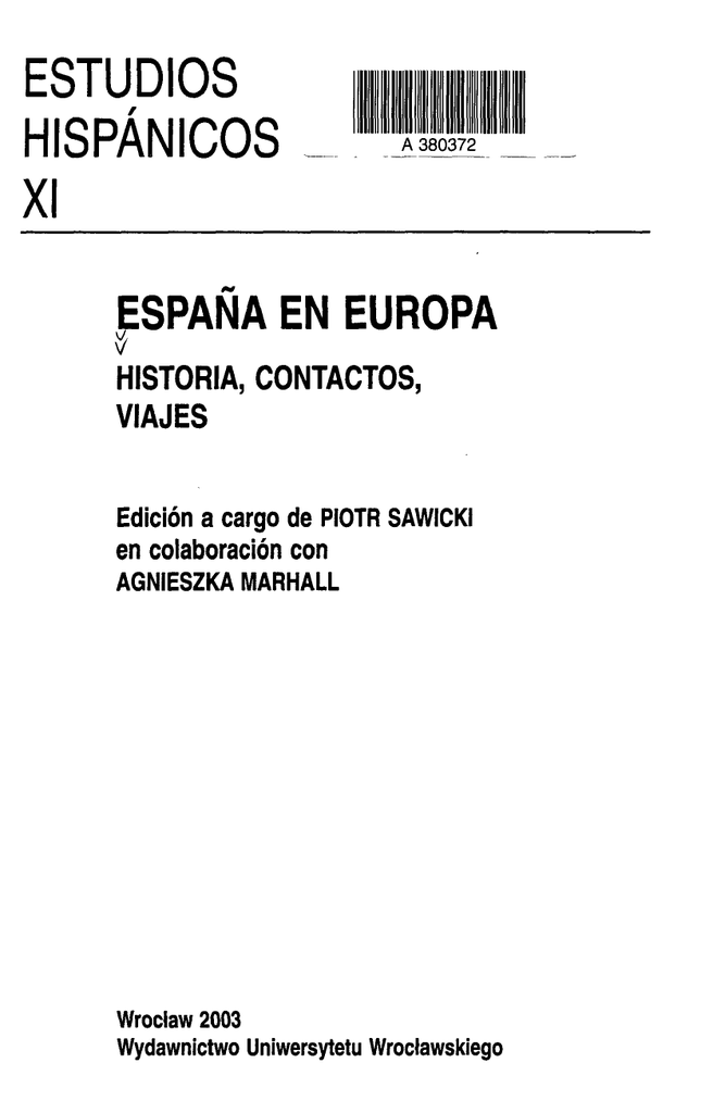 ESTUDIOS HISPÁNICOS XI A 380372 ESPAÑA EN EUROPA HISTORIA, CONTACTOS, VIAJES Edición a cargo de PIOTR SAWICKI en colaboración con AGNIESZKA MARHALL Wroclaw 2003 Wydawnictwo Uniwersytetu Wroclawskiego ÍNDICE PIOTR SAWICKI Presentación del volumen 9 ENTRE EL ESTEREOTIPO Y LA REALIDAD INMEDIATA: ESPAÑA DE LEJOS, ESPAÑA DE CERCA NATASZA POSADZY España y los españoles en los manuales polacos de Geografía e Historia del siglo XVIII 13 MAGDALENA áWIATEK ¿Con la cruz o contra la cruz? El papel de la religión y de los hombres de la Iglesia durante la Guerra de la Independencia 37 ANNA KONIECZNA La herencia cultural y literaria de Richard Ford 49 PIOTR SAWICKI Los comentaristas polacos de la España romántica. Apuntes sobre una hispanofilia eslava que se expresó en francés 63 EN ESPAÑA (Y PORTUGAL) CON AMOR. VIAJEROS Y RESIDENTES EWALUKASZYK Anastazy Raczyñski, historiógrafo da arte portuguesa 77 AGNIESZKA AUGUST-ZARE.BSKA La herencia oriental y occidental en España a los ojos del rabino judeopolaco Mordejai Ehrenpreis 91 GRZEGORZ B^K Gabriela Makowiecka (1906-2002): pionera de la Hispanística polaca y de la Eslavística española 103 ELZBIETABORTKIEWICZ Wittlin en España 109 NOELIA ROMÁN Camino de peregrinación: de Lublin a Madrid. Los horizontes de Józef Lobodowski 115 6 índice ÁGATA MIELCZAREK Información y propaganda en Polonia. Revista ilustrada (1955-1969), publicación periódica de la colonia polaca en España 125 DE ESPAÑA A EUROPA, AYER Y HOY AGNIESZKAKOLODYÑSKA Los judíos sefardíes en Polonia 137 ANNASAWICKA Por?bowicz i Verdaguer: inici de la projecció de les lletres catalanes a Polonia 149 MARÍA FIUPOWICZ-RUDEK Más que amor. Sofía Casanova Lutosiawska, princesa de las nieves polacas 165 RICARD SAN VICENTE Sobre Mi viaje al bloqueo y La aguja dorada de Montserrat Roig 177 EUGENIUSZ GÓRSKI El pensamiento de Fernando Savater en Polonia 187 COMPLETANDO EL PANORAMA... JIRÍ CHALUPA Un hijo de Maquiavelo. La estrategia militar y política de Francisco Franco durante la Guerra Civil española 195 IVO BARTECEK Viajeros de los Países Checos en Iberoamérica. Introducción al tema 205 WLADYSLAW SERWATOWSKI ¿Es Antoni Gaudí i Cornet vexilógrafo? 209 RESEÑAS Y NOTAS DE LECTURA Historia CH. STALLAERT, Etnogénesis y etnicidad. Una aproximación histérico-antropológica al casticismo. Por Ana M. Simó Sánchez 219 M. TUÑÓN DE LARA, J. VALDEÓN BARUQUE, A. DOMÍNGUEZ ORTIZ, Historia Hiszpanii; T. MILKOWSKI, P. MACHCEWICZ, Historia Hiszpanii. PorCezary Taracha 222 J. POLISENSKY, I. BARTEÓEK, Déjiny Iberského poloostrova (Dopfelomu 19. a 20. století). Por Jirí Chalupa 226 M. MALINOWSKI, Spoleczeñstwo Kordoby w czasach Kolumba, inkwizycji i rekonkwisty (przelom XV i XVI wieku). Por Ewa Kulak 229 R. SKOWRON, Olivares, Wazowie i Baltyk. Polska w polityce zagranicznej Hiszpanii w latach 1620-1632. Por Teresa Eminowicz-Jaákowska 231 L. MULARSKA-ANDZIAK, Dyktatura generala Primo de Rivera a hiszpañskie tradycje imperialne 1923-1930. Por Magdalena Ówiatek 234 índice 7 Encuentros y contactos F. PRESA GONZÁLEZ (Coord. y Ed.), España y el mundo eslavo. Relaciones culturales, literarias y lingüísticas. Por Francisco Molina Moreno 2 3 7 V. BAGNÓ (Ed.), Pogranichnye kultury miezhdu Vostokom iZapadom. Rossiya ilspaniya. Por Maksymilian Drozdowicz y Marlena Krupa 243 M. POLIO BOBIÓ, Hrvatska-épanjolska. Kulturno-povijesne veze I Croacia-España. Relaciones históricas y culturales. Por Malgorzata Filipek 247 C. TARACHA (Ed.), We wspólnej Europie. Polska - Hiszpania XVI-XX wiek. Por Natasza Posadzy 2 5 2 J. AXER y otros, En tomo a Dantisco. Por Teresa Jaromin 257 J. KIENIEWICZ, Hiszpania wzwierciadle polskim. Por Ivo BarteCek 259 J. KIENIEWICZ (Ed.), Studia polsko-hiszpañskie. Wiek XVIII. Por Magdalena Ówiatek 260 J. KIENIEWICZ (Ed.), Studia polsko-hiszpañskie. Wiek XIX. Por Agnieszka Marhall 263 E.E. GONZÁLEZ MARTÍNEZ, M. NALEWAJKO (Eds.), Hiszpania - Polska: spotkania. Por Marlena Krupa y Jerzy Zebrowski 2 6 6 Viajeros y viajes A. MATYJASZCZYK GRENDA, F. PRESA GONZÁLEZ (Eds.), Viajeros polacos en España (A caballo de los siglos XIX y XX). Por Agnieszka August-Zar^bska 269 J. CHARKIEWICZ, Dyjariuszpodrózy hiszpañskiejz Wilna do miasta Walencyi... Por Ewa Kulak 271 A. HIRSCHBERG, Hiszpania. Wspomnienia z podrózy. Por Ewa Kulak 273 J. VALERA, Pis'ma iz Rosii. Por Maksymilian Drozdowicz 2 7 4 J. ADAMSKI (Ed.), Ignacy Domeyko. Referaty i materiaty z Miedzynarodowej Konferencji w 200-lecie urodzin. Por Maksymilian Drozdowicz 2 7 8 J. ACHMATOWICZ, Por las huellas de Domeyko. «Araucanía y sus habitantes» de Ignacio Domeyko -150 años después. Por Maksymilian Drozdowicz 281 Literatura. Varía H. ZBUDILOVÁ (Ed.), La literatura española de los siglos XVI-XVIII en las bibliotecas de Chequia, Moravia y Eslovaquia, Opera Románica, 3. Por Roberto Mansberger Amorós 2 8 4 A. KLOSIÑSKA-NACHIN, Monólogo interioren la novela española. Técnica narrativa y visión del mundo. Por Francisco Lima Ramírez 288 A. BACZYK-TOMASZEWSKA, El paisaje en la obra de Juan Goytisolo: entre una estética del shock y estética del aura. Por Ewa Lukaszyk 291 Románica Olomucensia, VIII. Iberoamericana Olomucensia, I. Por Zygmunt Wojski 294 Románica Olomucensia, X. Iberoamericana Olomucensia, II. Por Támara Brancová 294 Studia ¡berystyczne, 2. Almanach galicyjski, 1. Por Ewa Lukaszyk 296 8 índice SIMPOSIOS, SEMINARIOS, ANIVERSARIOS Seminario "Hiszpania i Polska: dwa kraje emigracyjne na przelomie XIX i XX wieku / España y Polonia: dos países de emigración en el cambio de los siglos XIX al XX". Por Maígorzata Nalewajko 301 Simposio "Miranda de Ebro. La perspectiva polaca". Por Maígorzata Nalewajko 308 Conmemoración del 25 aniversario de los estudios de Románicas con especialidad en Hispánicas en la Universidad de Wrociaw. Por Marlena Krupa 310 Asociación Hispano-Polaca de la Universidad Católica de Lublin. 15 años para la promoción de la cultura y lengua 