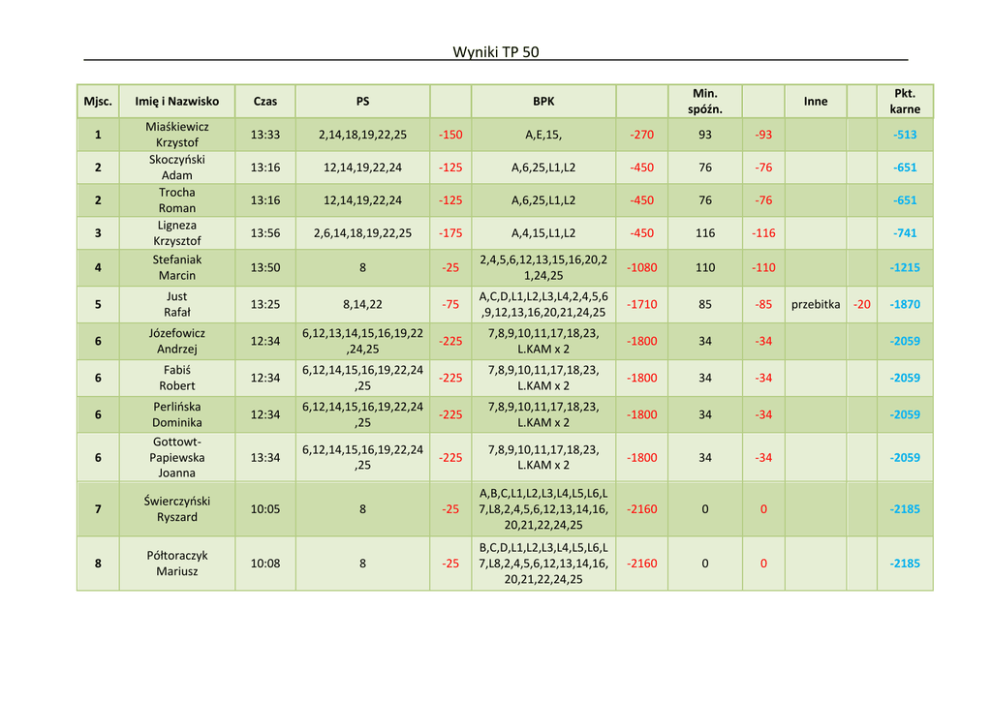 Wyniki TP 50 Mjsc. 1 2 2 3 4 Imię i Nazwisko Miaśkiewicz Krzystof Skoczyński Adam Trocha Roman Ligneza Krzysztof Stefaniak Marcin Min. spóźn. BPK Inne Pkt. karne Czas PS 13:33 2,14,18,19,22,25 -150 A,E,15, -270 93 -93 -513 13:16 12,14,19,22,24 -125 A,6,25,L1,L2 -450 76 -76 -651 13:16 12,14,19,22,24 -125 A,6,25,L1,L2 -450 76 -76 -651 13:56 2,6,14,18,19,22,25 -175 A,4,15,L1,L2 -450 116 -116 -741 13:50 8 -25 2,4,5,6,12,13,15,16,20,2 1,24,25 -1080 110 -110 -1215 5 Just Rafał 13:25 8,14,22 -75 A,C,D,L1,L2,L3,L4,2,4,5,6 ,9,12,13,16,20,21,24,25 -1710 85 -85 6 Józefowicz Andrzej 12:34 6,12,13,14,15,16,19,22 ,24,25 -225 7,8,9,10,11,17,18,23, L.KAM x 2 -1800 34 -34 -2059 6 Fabiś Robert 12:34 6,12,14,15,16,19,22,24 ,25 -225 7,8,9,10,11,17,18,23, L.KAM x 2 -1800 34 -34 -2059 12:34 6,12,14,15,16,19,22,24 ,25 -225 7,8,9,10,11,17,18,23, L.KAM x 2 -1800 34 -34 -2059 13:34 6,12,14,15,16,19,22,24 ,25 -225 7,8,9,10,11,17,18,23, L.KAM x 2 -1800 34 -34 -2059 6 6 Perlińska Dominika GottowtPapiewska Joanna przebitka -20 -1870 7 Świerczyński Ryszard 10:05 8 -25 A,B,C,L1,L2,L3,L4,L5,L6,L 7,L8,2,4,5,6,12,13,14,16, 20,21,22,24,25 -2160 0 0 -2185 8 Półtoraczyk Mariusz 10:08 8 -25 B,C,D,L1,L2,L3,L4,L5,L6,L 7,L8,2,4,5,6,12,13,14,16, 20,21,22,24,25 -2160 0 0 -2185 Wyniki TP 50 9 Dering Marciń 08:31 10* Kaczmarek Stanisław 14:06 6,7,8,19,25 -125 A,B,C,D,E,L1,L2,L3,L4,L5, L6,L7,L8,1,3,5,6,9,12,13, 14,15,16,18,19,20,21,22, 24,25 -2700 0 0 L1,L2,L3,L4,9 -450 126 -126 *Zawodnik decyzją organizatorów został przesunięty na ostatnią pozycję za przekroczenie limitu czasu. -2700 przebitka -10 -711
