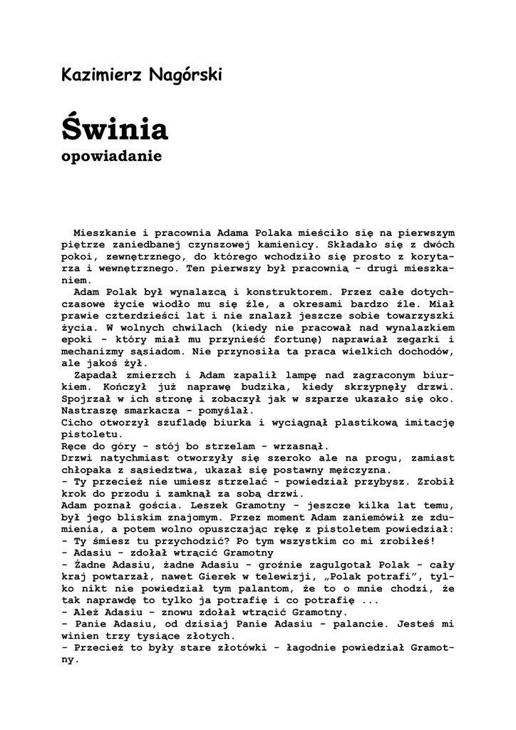Kazimierz Nagórski Świnia opowiadanie Mieszkanie i pracownia Adama Polaka mieściło się na pierwszym piętrze zaniedbanej czynszowej kamienicy. Składało się z dwóch pokoi, zewnętrznego, do którego wchodziło się prosto z korytarza i wewnętrznego. Ten pierwszy był pracownią - drugi mieszkaniem. Adam Polak był wynalazcą i konstruktorem. Przez całe dotychczasowe życie wiodło mu się źle, a okresami bardzo źle. Miał prawie czterdzieści lat i nie znalazł jeszcze sobie towarzyszki życia. W wolnych chwilach (kiedy nie pracował nad wynalazkiem epoki - który miał mu przynieść fortunę) naprawiał zegarki i mechanizmy sąsiadom. Nie przynosiła ta praca wielkich dochodów, ale jakoś żył. Zapadał zmierzch i Adam zapalił lampę nad zagraconym biurkiem. Kończył już naprawę budzika, kiedy skrzypnęły drzwi. Spojrzał w ich stronę i zobaczył jak w szparze ukazało się oko. Nastraszę smarkacza - pomyślał. Cicho otworzył szufladę biurka i wyciągnął plastikową imitację pistoletu. Ręce do góry - stój bo strzelam - wrzasnął. Drzwi natychmiast otworzyły się szeroko ale na progu, zamiast chłopaka z sąsiedztwa, ukazał się postawny mężczyzna. - Ty przecież nie umiesz strzelać - powiedział przybysz. Zrobił krok do przodu i zamknął za sobą drzwi. Adam poznał gościa. Leszek Gramotny - jeszcze kilka lat temu, był jego bliskim znajomym. Przez moment Adam zaniemówił ze zdumienia, a potem wolno opuszczając rękę z pistoletem powiedział: - Ty śmiesz tu przychodzić? Po tym wszystkim co mi zrobiłeś! - Adasiu - zdołał wtrącić Gramotny - Żadne Adasiu, żadne Adasiu - groźnie zagulgotał Polak - cały kraj powtarzał, nawet Gierek w telewizji, „Polak potrafi”, tylko nikt nie powiedział tym palantom, że to o mnie chodzi, że tak naprawdę to tylko ja potrafię i co potrafię ... - Ależ Adasiu - znowu zdołał wtrącić Gramotny. - Panie Adasiu, od dzisiaj Panie Adasiu - palancie. Jesteś mi winien trzy tysiące złotych. - Przecież to były stare złotówki - łagodnie powiedział Gramotny. 2 - To była wówczas całkiem niezła miesięczna pensja - nagle bardzo spokojnie odpowiedział gospodarz. - To znaczy, ile byś chciał obecnie ... - Tyle samo - powiedział Adam. - Ale wtedy to było niecałe trzydzieści dolarów, a teraz to prawie tysiąc, a w ogóle jeśli mowa o starych długach - czy mogę usiąść? - Jeśli mowa o starych długach - powiedział Adam - to rzeczywiście, siadaj. Usiedli. Gospodarz na swoim miejscu przy biurku, Gramotny na wolnym krześle obok. - Dam Ci dziesięć baniek, tysiąc nowych złotych - rozpoczął targ Gramotny. - A odsetki? Za co najmniej dziesięć lat? - Mogę Ci te pieniądze dać natychmiast, bo akurat tyle mam przy sobie i będziemy kwita - Gramotny czuł, że zyskuje przewagę. Adam milczał chwilę, a potem z rezygnacją pokiwał głową. - Niech będzie - powiedział - jestem bez grosza. Gramotny wyjął portfel i odliczył pieniądze. Nim je jednak wręczył - powiedział: - Wysłuchaj mnie proszę. Adam wyciągnął rękę, delikatnie wziął pieniądze, schował je do tylnej kieszeni spodni, popatrzył na Gramotnego, pokiwał głową i wreszcie powiedział: - Gadaj. Gramotny wygodniej usadowił się na krześle i pochylił nieco do Adama: - Zostałem zrobiony w kiszkę, w konika garbuska czy jak kto woli, na cacy. Wyrolowano mnie na dwa miliony. - Dwa miliony - roześmiał się Adam - dwie stówki nowych złotych? Gramotny poważnie pokręcił głową. - Jeżeli zrobili cię na dwa miliony nowych złotych, to jesteś bankrutem. Gramotny jeszcze raz pokręcił głową i powiedział: - Zrobiono mnie na dwa miliony dolarów. - Straszna kupa szmalu. Więc i ty jesteś bez grosza. - Niewiele zostało. Jeżeli w ciągu kilku tygodni nie odzyskam pieniędzy - firma „GRAMOT” padnie jak strucla. I pomyśleć, że zrobili mi to moi wspólnicy. - Dobrze wiedziałeś, że to banda złodziei - powiedział Adam na szczęście żyjemy w państwie prawa. Podaj ich do sądu. - Ta transakcja nie była całkiem legalna. Cała moja nadzieja w tobie. - Nie mam firmy rewindykacyjnej. - Ale masz kupę pomysłów. - Przeceniasz mnie. - Ale gdyby wymyślić jakąś sprytną inwestycję, dającą szybkie zyski ... - To ? - Adam zawiesił głos. - To oni byliby skłonni zainwestować i wtedy... 3 - Wpłaciliby pieniądze na twoje konto. - Właśnie. - A ja? - zapytał Adam. - Dostaniesz dziesiątą część. - Szkoda, że nie mam pomysłów na zawołanie. - Ależ masz - Adasiu - masz, rusz tylko głową. No nie bądźże świnią. Zapadła cisza i nagle oczy Adama zaczęły się rozszerzać, a gdy osiągnęły rozmiary sporych monet, usta jakby automatycznie powiedziały: - NIE BĄDŹ ŚWINIĄ. A potem Adam podszedł do kredensu, odwrócił się do Gramotnego i powiedział: - Dobrze wiesz że nie piję, koniak, który dostałem od ciebie dwanaście lat temu na imieniny - jest ledwo napoczęty. Dziś jest okazja, żeby wypić po kieliszku. I otworzył kredens. * Było kilka minut po ósmej, kiedy pod siedzibę „GRAMOTU” podjechała furgonetka firmy przewozowej. Wyskoczyło z niej czterech młodych mężczyzn, w schludnych kombinezonach, a za nimi wygramolił się Adam Polak. Wpadł prosto na Gramotnego. - Spóźniłeś się - powiedział Gramotny. - I owszem - odpowiedział Adam - ale nie bardzo. W sam raz, by trochę ich podgrzać. Odwrócił się w stronę ekipy. - Panowie, bierzcie skrzynki i proszę za mną. Młodzi ludzie wyładowali z samochodu dwie spore i dość ciężkie skrzynki. Cała szóstka ruszyła w stronę wejścia. W holu, kiedy zmierzali już w stronę sekretariatu, Gramotny zapytał : - Co jest w tej drugiej skrzyni? - Części zapasowe i akumulator, który muszę wymienić w prototypie. Sekretarka parzyła kawę, gdy wchodzili. Chciała poniechać tej pracy, ale Gramotny dał jej znak. Zrozumiała w lot. Adam wskazał tragarzom miejsce pod oknem. Młodzieńcy ustawili skrzynki