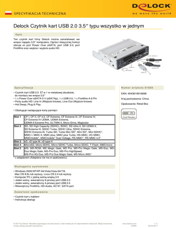 Delock Czytnik kart USB 2.0 3.5″ typu wszystko w jednym Opis Ten czytnik kart firmy Delock można zainstalować we wnęce napędu 3.5″ komputera. Oprócz klasycznej funkcji oferuje on port Power Over eSATA, port USB 2.0, port FireWire oraz wejście i wyjście audio HD. Specyfikacja • Czytnik kart USB 2.0 57 w 1 w metalowej obudowie, do montażu we wnęce 3.5″ • 1 x Power Over eSATA 5 V (eSATAp), 1 x USB 2.0, 1 x FireWire A 6-Pin • Porty audio HD: Line-In (Wejście liniowe), Line-Out (Wyjście liniowe) • Hot Swap, Plug & Play Numer artykułu 91669 EAN: 4043619916696 Kraj pochodzenia: China Opakowanie: Retail Box • Obsługuje następujące karty pamięci: Slot 1 CF I, CF II, CF 4.0, CF Extreme, CF Extreme III, CF Extreme IV, CF Extreme IV UDMA, UDMA Extreme, UDMA 6 Extreme Pro, ULTIMA II, Micro Drive, Magicstor Slot 2 SD, SD High Capacity (SDHC), SDXC, SD Ultra II, SD UDMA II, SD Extreme III, SDHC Turbo, SDHC Ultra, SDHC Extreme, SDHC Extreme III, Turbo-SD, Turbo Mini SD*, Mini SD*, Mini SDHC*, MMC-I, MMC-II, MMC plus, MMC plus Turbo, HS-MMC, HC-MMC, MMCmobile*, MMCmobile* Dual-Voltage, RS-MMC*, RS-MMC 4.0* Slot 3 xD, xD type M, xD type H Slot 4 MicroSD, Micro SDHC, Micro SDHC Turbo, Mirco SDXC, T-Flash, MMCmicro Slot 5 MS, MS-ROM, MS Magic Gate, MS Pro, MS-Pro Magic Gate, MS-Duo, MSDuo Magic Gate, MS-Pro Duo, MS-Pro HighSpeed, MS-Pro HG-Duo, MS-Pro Duo Magic Gate, MS Micro (M2)* * z adapterem (Adaptera nie ma w opakowaniu) Wymagania systemowe • Windows 2000/XP/XP-64/Vista/Vista-64/7/8, Mac OS 8.6x lub wyższy, Linux OS 2.4 lub wyższy • Komputer PC z jedną wolną wnęką 3.5 • Jeden wolny, wewnętrzny 9-pinowy port USB 2.0 • Jeden wolny, wewnętrzny 4-pinowy port USB 2.0 • Wewnętrzny FireWire, HD-Audio, AC’97, SATA port Zawartość opakowania • Czytnik kart z kablem • Instrukcja obsługi © 2017 by Delock. Wszelkie pojawiające się tutaj nazwy i znaki należą do ich odpowiednich właścicieli. Błędy drukarskie, zmiany & pomyłki zastrzeżone. www.delock.com 91669 1/2 02.03.2017 Zdjęcia © 2017 by Delock. Wszelkie pojawiające się tutaj nazwy i znaki należą do ich odpowiednich właścicieli. Błędy drukarskie, zmiany & pomyłki zastrzeżone. Powered by TCPDF (www.tcpdf.org) www.delock.com 91669 2/2 02.03.2017