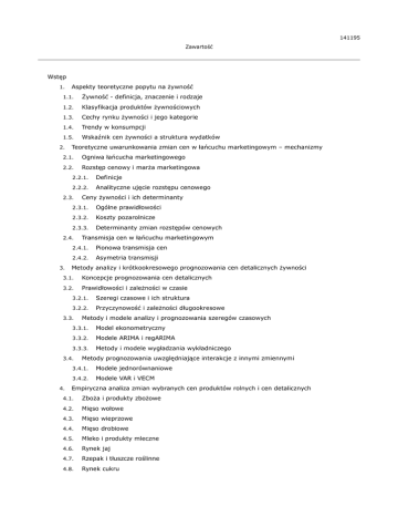 141195 Zawartość Wstęp 1. Aspekty teoretyczne popytu na żywność 1.1. Żywność - definicja, znaczenie i rodzaje 1.2. Klasyfikacja produktów żywnościowych 1.3. Cechy rynku żywności i jego kategorie 1.4. Trendy w konsumpcji 1.5. Wskaźnik cen żywności a struktura wydatków 2. Teoretyczne uwarunkowania zmian cen w łańcuchu marketingowym – mechanizmy 2.1. Ogniwa łańcucha marketingowego 2.2. Rozstęp cenowy i marża marketingowa 2.2.1. Definicje 2.2.2. Analityczne ujęcie rozstępu cenowego 2.3. 2.3.1. Ogólne prawidłowości 2.3.2. Koszty pozarolnicze 2.3.3. Determinanty zmian rozstępów cenowych 2.4. 3. Ceny żywności i ich determinanty Transmisja cen w łańcuchu marketingowym 2.4.1. Pionowa transmisja cen 2.4.2. Asymetria transmisji Metody analizy i krótkookresowego prognozowania cen detalicznych żywności 3.1. Koncepcje prognozowania cen detalicznych 3.2. Prawidłowości i zależności w czasie 3.2.1. Szeregi czasowe i ich struktura 3.2.2. Przyczynowość i zależności długookresowe 3.3. 3.3.1. Model ekonometryczny 3.3.2. Modele ARIMA i regARIMA 3.3.3. Metody i modele wygładzania wykładniczego 3.4. 4. Metody i modele analizy i prognozowania szeregów czasowych Metody prognozowania uwzględniające interakcje z innymi zmiennymi 3.4.1. Modele jednorównaniowe 3.4.2. Modele VAR i VECM Empiryczna analiza zmian wybranych cen produktów rolnych i cen detalicznych 4.1. Zboża i produkty zbożowe 4.2. Mięso wołowe 4.3. Mięso wieprzowe 4.4. Mięso drobiowe 4.5. Mleko i produkty mleczne 4.6. Rynek jaj 4.7. Rzepak i tłuszcze roślinne 4.8. Rynek cukru 5. Prognozowanie cen detalicznych na podstawie modeli regARIMA oraz ETS 5.1. Wprowadzenie 5.2. Estymacja modeli wygładzania wykładniczego ETS 5.3. Specyfikacja i estymacja modeli regARIMA 5.4. Dokładność prognoz 6. Prognozowanie cen detalicznych na podstawie zależności przyczynowo-skutkowych 6.1. Szeregi czasowe oraz ich właściwości 6.2. Specyfikacja dynamicznych modeli zgodnych dla poziomów 6.3. Specyfikacja modeli korekty błędem 6.4. Specyfikacja modeli VAR/VECM 6.5. Porównanie dokładności prognoz ex post 7. Prognozowanie wskaźników detalicznych cen żywności z wykorzystaniem modeli szeregów czasowych 7.1. Wprowadzenie 7.2. Dane 7.3. Specyfikacja i estymacja modeli ETS 7.4. Specyfikacja i estymacja modeli regARIMA 7.5. Prognozy i ich dokładność 8. Prognozowanie wskaźników detalicznych cen żywności na podstawie zależności przyczynowych 8.1. Wprowadzenie do modelowania 8.2. Dane statystyczne 8.3. Specyfikacja, estymacja i weryfikacja modeli jednorównaniowych 8.4. Specyfikacja, estymacja i weryfikacja modeli VAR/VECM 8.5. Prognozy i ich weryfikacja Podsumowanie Literatura