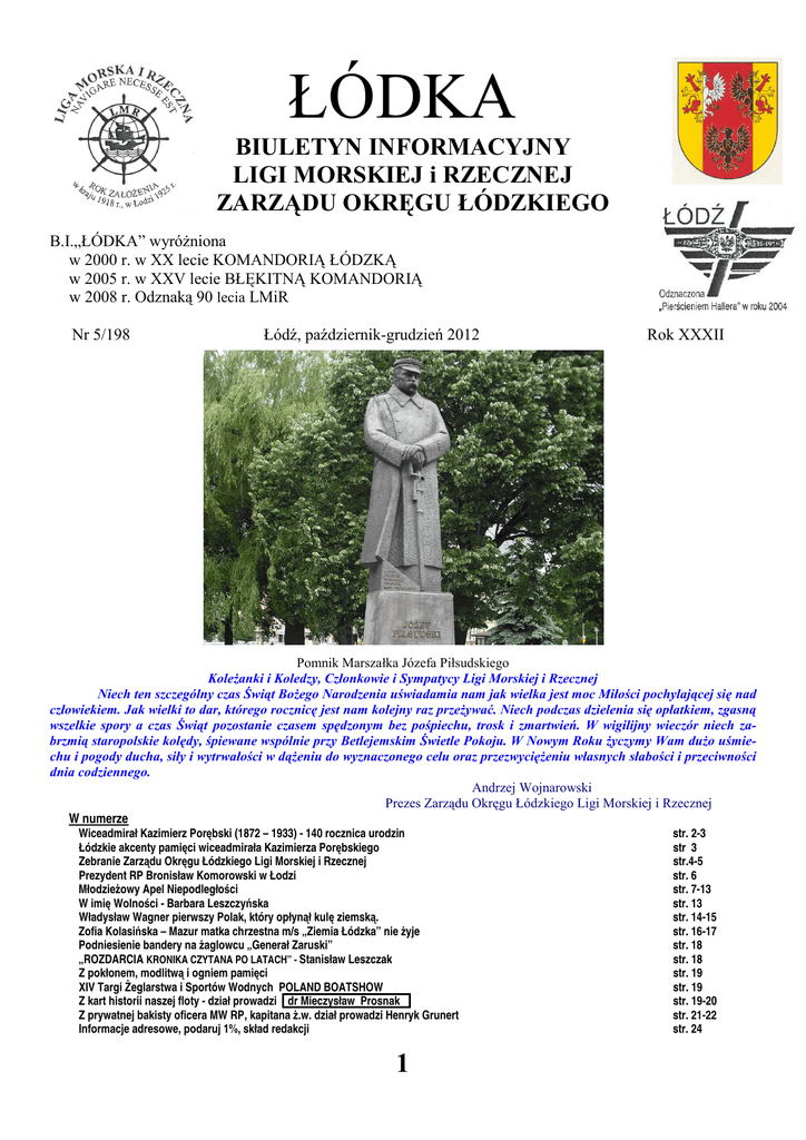ŁÓDKA BIULETYN INFORMACYJNY LIGI MORSKIEJ i RZECZNEJ ZARZĄDU OKRĘGU ŁÓDZKIEGO B.I.„ŁÓDKA” wyróŜniona w 2000 r. w XX lecie KOMANDORIĄ ŁÓDZKĄ w 2005 r. w XXV lecie BŁĘKITNĄ KOMANDORIĄ w 2008 r. Odznaką 90 lecia LMiR Nr 5/198 Łódź, październik-grudzień 2012 Rok XXXII Pomnik Marszałka Józefa Piłsudskiego KoleŜanki i Koledzy, Członkowie i Sympatycy Ligi Morskiej i Rzecznej Niech ten szczególny czas Świąt BoŜego Narodzenia uświadamia nam jak wielka jest moc Miłości pochylającej się nad człowiekiem. Jak wielki to dar, którego rocznicę jest nam kolejny raz przeŜywać. Niech podczas dzielenia się opłatkiem, zgasną wszelkie spory a czas Świąt pozostanie czasem spędzonym bez pośpiechu, trosk i zmartwień. W wigilijny wieczór niech zabrzmią staropolskie kolędy, śpiewane wspólnie przy Betlejemskim Świetle Pokoju. W Nowym Roku Ŝyczymy Wam duŜo uśmiechu i pogody ducha, siły i wytrwałości w dąŜeniu do wyznaczonego celu oraz przezwycięŜeniu własnych słabości i przeciwności dnia codziennego. Andrzej Wojnarowski Prezes Zarządu Okręgu Łódzkiego Ligi Morskiej i Rzecznej W numerze Wiceadmirał Kazimierz Porębski (1872 – 1933) - 140 rocznica urodzin Łódzkie akcenty pamięci wiceadmirała Kazimierza Porębskiego Zebranie Zarządu Okręgu Łódzkiego Ligi Morskiej i Rzecznej Prezydent RP Bronisław Komorowski w Łodzi MłodzieŜowy Apel Niepodległości W imię Wolności - Barbara Leszczyńska Władysław Wagner pierwszy Polak, który opłynął kulę ziemską. Zofia Kolasińska – Mazur matka chrzestna m/s „Ziemia Łódzka” nie Ŝyje Podniesienie bandery na Ŝaglowcu „Generał Zaruski” „ROZDARCIA KRONIKA CZYTANA PO LATACH” - Stanisław Leszczak Z pokłonem, modlitwą i ogniem pamięci XIV Targi śeglarstwa i Sportów Wodnych POLAND BOATSHOW Z kart historii naszej floty - dział prowadzi dr Mieczysław Prosnak Z prywatnej bakisty oficera MW RP, kapitana Ŝ.w. dział prowadzi Henryk Grunert Informacje adresowe, podaruj 1%, skład redakcji 1 str. 2-3 str 3 str.4-5 str. 6 str. 7-13 str. 13 str. 14-15 str. 16-17 str. 18 str. 18 str. 19 str. 19 str. 19-20 str. 21-22 str. 24 Wiceadmirał Kazimierz Porębski (1872 – 1933) 140 rocznica urodzin Wiceadmirał Kazimierz Porębski urodził się 15 listopada 1872 r w Wilnie. Po maturze wstąpił do Morskiego Korpusu Kadetów w Petersburgu, który ukończył w 1892 r. Promowany do stopnia miczmana rozpoczął słuŜbę na okrętach wojennych. Przez szereg lat zajmował róŜne stanowiska w carskiej flocie. Był m.in. dowódca torpedowca „TriewoŜnyj”, krąŜownika „Admirał Makarow” i stawiacza min „Jenisej”. W rok później objął dowództwo najnowocześniejszego pancernika „Imperatica Marija”, a następnie, juŜ w stopniu kontradmirała dowództwo brygady krąŜowników na Morzu Czarnym. Admirał Porębski mimo pełnienia wysokich stanowisk w armii rosyjskiej zawsze podkreślał swe polskie pochodzenie, utrzymywał ścisłej kontakty z polskim środowiskiem w Sewastopolu i Petersburgu. Jesienią 1918 r. po odzyskaniu przez Polskę niepodległości podał się do dymisji i przybył do Warszawy. W listopadzie 1918 r. kontradmirał Porębski wstąpił do Wojska Polskiego. Dzięki kwalifikacjom i umiejętnościom organizacyjnym został szefem Departamentu do Spraw Morskich (2 maja 1919r.), instytucji podporządkowanej Ministerstwu Spraw Wojskowych. Nowa organizacja naczelnych władz morskich była odzwierciedleniem poglądów reprezentowanych przez K. Porebskiego i jego współpracowników. W 1921 r kontradmirała K. Porębskiego zweryfikowano do stopnia wiceadmirała. Przedmiotem szczególnej troski wiceadmirała był dobór kadr. W tym celu, w oparciu o Port Wojenny w Modlinie, utworzono batalion morski i Szkołę Morską w Tczewie kształcącą oficerów marynarki handlowej. Dzięki jego zabiegom zorganizowano równieŜ w Toruniu Szkołę Marynarki Wojennej. Postanowienia traktatu wersalskiego w sprawie polskiej granicy morskiej wprowadzono w Ŝycie w 1920 r. Przejmowanie Pomorza zakończyło się 10 lutego w Pucku uroczystością „zaślubin Polski z morzem”. Na akcie erekcyjnym złoŜył swój podpis m.in. kontradmirał K. Porębski. Z inicjatywy Kazimierza Porębskiego inŜ. Tadeusz Wenda przedstawił koncepcję budowy portu w Gdyni, którego oficjalne otwarcie nastąpiło następnego roku (1922 r.). 1 stycznia 1922 r. naczelną instytucją marynarki zostało Kierownictwo Marynarki Wojennej. Na jego czele stanął wiceadmirał Kazimierz Porębski. W 1925 r. wybuchła tzw. „afera minowa”. Śledztwo wykazało, iŜ jeden z jego podwładnych dopuścił się szeregu naduŜyć przy zakupie min z Estonii. Winą obarczono K. Porębskiego i zwolniono go ze stanowiska szefa KMW. Prawdą jest jednak, Ŝe admirał był doskonałym Ŝołnierzem i fachowcem. Imponował pracowitością, oddaniem sprawie wdraŜania koncepcji Polski jako kraju morskiego. Zmarł w Warszawie 20 stycznia 1933 r. Spoczywa na cmentarzu na Powązkach. Był uhonorowany wysokimi odznaczeniami polskimi i zagranicznymi m.in. Orderem Odrodzenia Polski, KrzyŜem Walecznych i Francuską Legią Honorową. Wiceadmirał Kazimierz Porębski jako współtwórca Marynarki Wojennej i gospodarki morskiej, na trwałe wszedł do naszej historii. W Gdyni Pogórzu znajduje się ulica jego imienia, a 30 czerwca 1994r. został patronem 8 FOW w Świnoujściu.15 maja 1998 r. jego imię otrzymała Szkoła Podstawowa nr 43 w Gdyni. Pamiątkowa tablica poświęcona K. Porębskiemu została odsłonięta na Cmentarzu Marynarki Wojennej na Oksywiu podczas II Światowego Zlotu Marynarzy w Czerwcu 1998 r. Pomnik admirała znajduje się takŜe na dziedzińcu Wydziału Nawigacyjnego Akademii Morskiej przy al. Jana Pawła II w Gdyni 2 Delegacja Marynarki Wojennej przy grobie wiceadmirała Kazimierza Porębskiego na cmentarzu na Powązkach w Warszawie Łódzkie akcenty pamięci wiceadmirała Kazimierza Porębskiego Z okazji obc