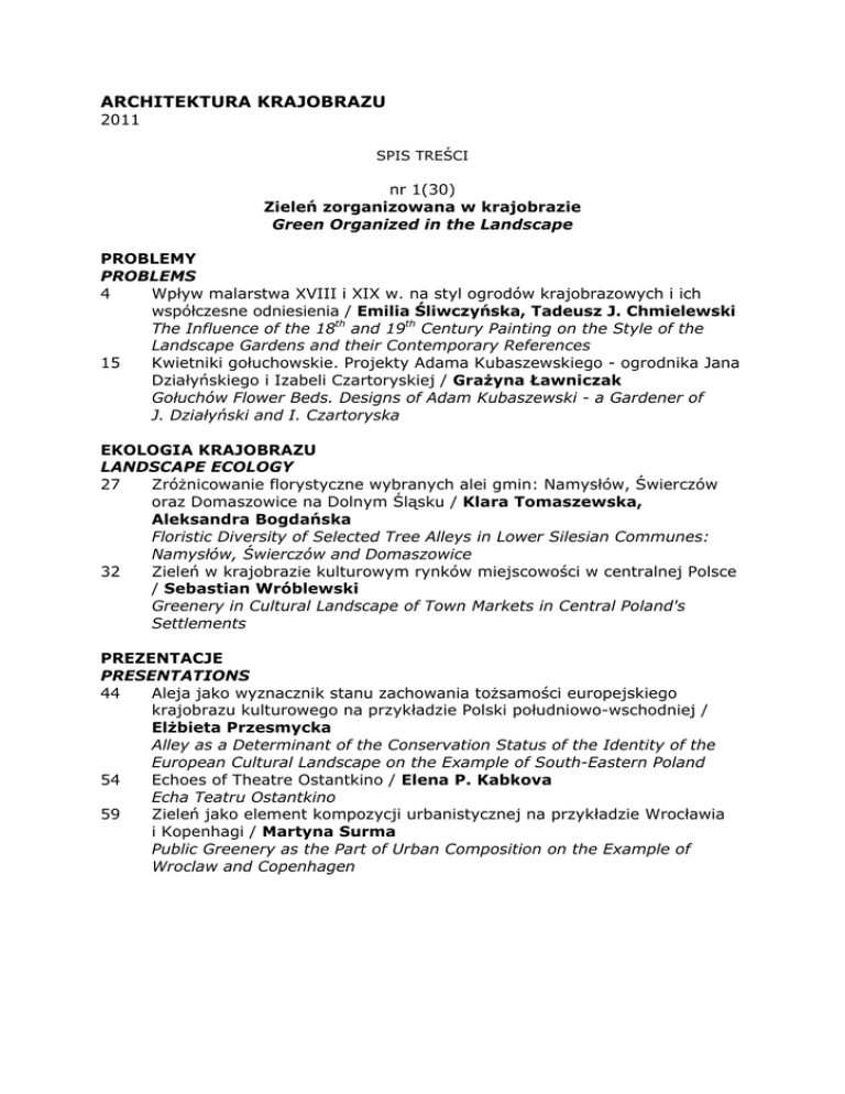 ARCHITEKTURA KRAJOBRAZU 2011 SPIS TREŚCI nr 1(30) Zieleń zorganizowana w krajobrazie Green Organized in the Landscape PROBLEMY PROBLEMS 4 Wpływ malarstwa XVIII i XIX w. na styl ogrodów krajobrazowych i ich współczesne odniesienia / Emilia Śliwczyńska, Tadeusz J. Chmielewski The Influence of the 18th and 19th Century Painting on the Style of the Landscape Gardens and their Contemporary References 15 Kwietniki gołuchowskie. Projekty Adama Kubaszewskiego - ogrodnika Jana Działyńskiego i Izabeli Czartoryskiej / Grażyna Ławniczak Gołuchów Flower Beds. Designs of Adam Kubaszewski - a Gardener of J. Działyński and I. Czartoryska EKOLOGIA KRAJOBRAZU LANDSCAPE ECOLOGY 27 Zróżnicowanie florystyczne wybranych alei gmin: Namysłów, Świerczów oraz Domaszowice na Dolnym Śląsku / Klara Tomaszewska, Aleksandra Bogdańska Floristic Diversity of Selected Tree Alleys in Lower Silesian Communes: Namysłów, Świerczów and Domaszowice 32 Zieleń w krajobrazie kulturowym rynków miejscowości w centralnej Polsce / Sebastian Wróblewski Greenery in Cultural Landscape of Town Markets in Central Poland's Settlements PREZENTACJE PRESENTATIONS 44 Aleja jako wyznacznik stanu zachowania tożsamości europejskiego krajobrazu kulturowego na przykładzie Polski południowo-wschodniej / Elżbieta Przesmycka Alley as a Determinant of the Conservation Status of the Identity of the European Cultural Landscape on the Example of South-Eastern Poland 54 Echoes of Theatre Ostantkino / Elena P. Kabkova Echa Teatru Ostantkino 59 Zieleń jako element kompozycji urbanistycznej na przykładzie Wrocławia i Kopenhagi / Martyna Surma Public Greenery as the Part of Urban Composition on the Example of Wroclaw and Copenhagen TWORZYWO MATERIALS 69 Analiza oczekiwań osób z dysfunkcją wzroku wobec cech i funkcji ogrodów / Anita Woźny, Anna Lauda The Analysis of Expectations of Features and Functions of Gardens Represented by People with Visual Disfunction 74 Trawa pampasowa ozdobą parków i ogrodów / Franciszek Gospodarczyk, Marek Liszewski Pampas Grass as Decoration of Parks and Gardens STANDARDY STANDARDS 78 Comparison of Environmental Standards Systems and Their Working Mechanism between Poland and China / Wu Yan-hong, Marcin Sobota, Xia Jian-xin Porównanie systemów standardów ochrony środowiska i mechanizmów ich działania w Rzeczpospolitej Polskiej oraz Chińskiej Republice Ludowej FORUM FORUM 87 Korelacje ludzi i natury we współczesnych obrazach znad basenu Morza Czarnego Śródziemnego i Bałtyckiego / Anna Borcz Correlations of People and Nature in the Contemporary Paintings from the Basin of the Black Sea, Mediterranean Sea and Baltic 102 Streszczenia angielskie Summaries nr 2(31) Krajobraz od-nowa Landscape a-new PROBLEMY PROBLEMS 4 Ochrona i tworzenie piękna – jak tego nauczać? / Aleksander Böhm Preservation and Creation of Beauty – How to Teach it? 7 Rola małych miast i wsi o tradycjach miejskich w krajobrazie kulturowym / Zuzanna Borcz, Irena Niedźwiecka-Filipiak The Role of Small Towns and Villages with Urban Traditions in the Cultural Landscape 16 Nowe podejście do ochrony krajobrazu kulturowego - budowanie tożsamości lokalnej w oparciu o czytelną narrację krajobrazową / Elżbieta Raszeja, Anna Gałecka New Approach in Cultural Landscape Protection - Strengthening the Local Identity by a Legible Landscape Narration EKOLOGIA KRAJOBRAZU LANDSCAPE ECOLOGY 24 Krajobraz od-dawna, od-zaraz, od-nowa. Czyli od krajobrazu zrównoważonego do inercyjnego i znijaczonego / Zbigniew Myczkowski, Wojciech Rymsza-Mazur Landscape for a Long Time - Right Now and a New One - from Sustainable Landscape to the Inertial Even Futureless One PREZENTACJE PRESENTATIONS 34 Folwark Wilanowski – zapomniane miejsce historyczne / Małgorzata Kaczyńska, Anna Różańska Wilanów Manorial Economy - a Forgotten Historic Site 41 „Nowy krajobraz" jako efekt zagospodarowania turystycznego na przykładzie obiektu Bukovel na Ukrainie / Emilia Marks "New Landscape" as a Result of the Tourist Development Based on the Bukovel Facility in Ukraine TWORZYWO MATERIALS 47 Studia struktury i kondycji zieleni miejskiej w Orle / Elena Zolotareva Study of the Structure and Condition of Orel Street Plantings 54 Współczesne krajobrazy pamięci / Agnieszka Gębczyńska-]anowicz Contemporary Memorial Landscapes FORUM FORUM 61 Przestrzeń interakcyjna w mieście / Aleksandra Lis, Ada Fudała Interactional Space in Town 72 Sytuacja krajobrazowa opactw cysterskich w Polsce w kontekście obowiązujących form ich ochrony / Małgorzata Milecka The Landscape Situation of Cistercian Monasteries in Poland in the Context of the Current Forms of their Protection 80 Edukacyjne aspekty ogrodów jako fenomen sztuki / Elena Polyudova Educational Aspects of Gardens as Phenomena of Art 86 Streszczenia angielskie Summaries nr 3(32) Konserwacja i rewaloryzacja krajobrazu Conservation and revalorization of landscape PROBLEMY PROBLEMS 4 Założenia do koncepcji rewaloryzacji i rewitalizacji ogrodów przy Opactwie O.O. Benedyktynów w Tyńcu / Beata J. Gawryszewska, Maja Skibińska Guidelines for Conception of Revaluation and Revitalisation of Benedictine Abbey Gardens in Tyniec 12 Poprawa jakości krajobrazu poprzez ekspozycję zespołów historycznych fortyfikacji na przykładzie Nysy / Jerzy Potyrała Improving the Quality of the Landscape by Exposing of Groups of Historic Fortifications on the Example of Nysa EKOLOGIA KRAJOBRAZU LANDSCAPE ECOLOGY 23 Przekształcenia układu komunikacyjnego i ich wpływ na kształtowanie krajobrazu gminy wiejskiej Ostróda / Mariusz Antolak Transformations of the Road, Railway and Waterway Network and their Influence on the Landscape Management in the Rural Commune of Ostróda 31 Fort Bema w Warszawie - jako przykład zagospodarowania zabytkowego obiektu militarnego / Anna Różańska, Małgorzata Kaczyńska Bem's Fort in Warsaw as an Example of Stocking a Historical Military Object PREZENTACJE PRESENTA