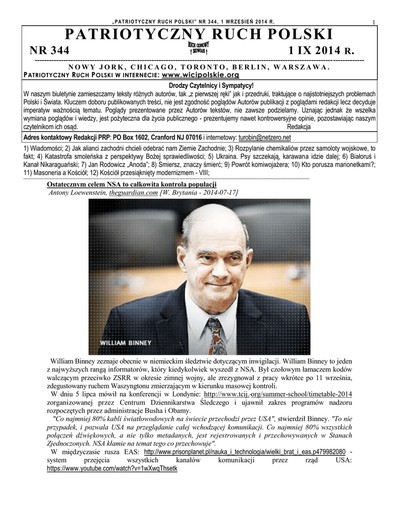 „PATRIOTYCZNY RUCH POLSKI” NR 344, 1 WRZESIEŃ 2014 R. PATRIOTYCZNY RUCH POLSKI NR 344 1 1 IX 2014 R . -----------------------------------------------------------------------------------------------------------------------------------------NOWY JORK, CHICAGO, TORONTO, BERLIN, WARSZAWA. P ATRIOTYCZNY R UCH P OLSKI W INTERNECIE : www.wicipolskie.org Drodzy Czytelnicy i Sympatycy! W naszym biuletynie zamieszczamy teksty różnych autorów, tak „z pierwszej ręki” jak i przedruki, traktujące o najistotniejszych problemach Polski i Świata. Kluczem doboru publikowanych treści, nie jest zgodność poglądów Autorów publikacji z poglądami redakcji lecz decyduje imperatyw ważnością tematu. Poglądy prezentowane przez Autorów tekstów, nie zawsze podzielamy. Uznając jednak że wszelka wymiana poglądów i wiedzy, jest pożyteczna dla życia publicznego - prezentujemy nawet kontrowersyjne opinie, pozostawiając naszym czytelnikom ich osąd. Redakcja Adres kontaktowy Redakcji PRP: PO Box 1602, Cranford NJ 07016 i internetowy: [email protected] 1) Wiadomości; 2) Jak alianci zachodni chcieli odebrać nam Ziemie Zachodnie; 3) Rozpylanie chemikaliów przez samoloty wojskowe, to fakt; 4) Katastrofa smoleńska z perspektywy Bożej sprawiedliwości; 5) Ukraina. Psy szczekają, karawana idzie dalej; 6) Białoruś i Kanał Nikaraguański; 7) Jan Rodowicz „Anoda”; 8) Smiersz, znaczy śmierć; 9) Powrót komiwojażera; 10) Kto porusza marionetkami?; 11) Masoneria a Kościół; 12) Kościół przesiąknięty modernizmem - VIII; ------------------------------------------------------------------------------------------------------------------------------------------------------------------------------------------------------------------------------------------------------------------------------------------------------------------------------------------------------------------------------------------------------------------ Ostatecznym celem NSA to całkowita kontrola populacji Antony Loewenstein, theguardian.com [W. Brytania - 2014-07-17] William Binney zeznaje obecnie w niemieckim śledztwie dotyczącym inwigilacji. William Binney to jeden z najwyższych rangą informatorów, który kiedykolwiek wyszedł z NSA. Był czołowym łamaczem kodów walczącym przeciwko ZSRR w okresie zimnej wojny, ale zrezygnował z pracy wkrótce po 11 września, zdegustowany ruchem Waszyngtonu zmierzającym w kierunku masowej kontroli. W dniu 5 lipca mówił na konferencji w Londynie: http://www.tcij.-org/summer-school/timetable-2014 zorganizowanej przez Centrum Dziennikarstwa Śledczego i ujawnił zakres programów nadzoru rozpoczętych przez administracje Busha i Obamy. "Co najmniej 80% kabli światłowodowych na świecie przechodzi przez USA", stwierdził Binney. "To nie przypadek, i pozwala USA na przeglądanie całej wchodzącej komunikacji. Co najmniej 80% wszystkich połączeń dźwiękowych, a nie tylko metadanych, jest rejestrowanych i przechowywanych w Stanach Zjednoczonych. NSA kłamie na temat tego co przechowuje". W międzyczasie rusza EAS: http://www.prisonplanet.pl/nauka_i_technologia/wielki_brat_i_eas,p479982080 system przejęcia wszystkich kanałów komunikacji przez rząd USA: https://www.youtube.com/watch?v=1wXwqThsetk 2 „PATRIOTYCZNY RUCH POLSKI” NR 344, 1 WRZESIEŃ 2014 R. NSA wkrótce będzie w stanie zebrać 966 eksabajtów rocznie co jest całym rocznym ruchem internetowym. Były szef Google Eric Schmidt stwierdził kiedyś, iż cała ilość wiedzy od początku ludzkości do 2003 r. wynosi zaledwie pięć eksabajtów. [...] "Ostatecznym celem NSA jest pełna kontrola populacji", powiedział Binney, "ale jestem delikatnie optymistyczny w związku z kilkoma ostatnimi decyzjami Sądu Najwyższego, takimi jak - egzekwowanie prawa wymagającego nakazu sądowego przed przeszukiwaniem smartfonów". Za: http://www.prisonplanet.pl/nauka_i_technologia/ostatecznym_celem_nsa_jest,p1295921694 # # # Zamach w Afganistanie. Nie żyje amerykański generał, niemiecki jest ranny Jak poinformował portal NBC News, 5 sierpnia w Kabulu - stolicy Afganistanu doszło do ataku typu green-on-blue wewnątrz ośrodka szkolenia armii afgańskiej. W zamachu zginął dwugwiazdkowy generał armii amerykańskiej Harold Green. Atak rozpoczął się gdy wojskowi oficjele przybyli do ośrodka szkolenia armii afgańskiej w Camp Qargha. Wówczas samotny napastnik, który miał na sobie mundur Narodowej Armii Afganistanu, otworzył ogień z broni maszynowej, chwilę później został zastrzelony. Przed śmiercią zdołał jednak zastrzelić amerykańskiego generała, ranić niemieckiego generała oraz 13 innych żołnierzy. Źródło: NBC News - [7 sierpnia 2014] Za: http://www.nowastrategia.org.pl/zamach-afganistanie-zyje-amerykanski-general-niemiecki-ranny/ # # # Zamach na konstytucję Minister Kluzik-Rostkowska stwierdziła, że nauczyciel, który podpisze deklaracje wiary, tym samym łamie konstytucje i musi się liczyć z reakcją dyrektora szkoły, organu prowadzącego i wojewody. Bo wedle pani minister taki nauczyciel łamie Konstytucję i przepisy Karty Nauczyciela. Bardziej szczegółowo - o reakcji na podpisywanie deklaracji wiary przez nauczycieli - mówi osławiona prof. Środa, która już bez niedomówień, wzywa do usuwania nauczycieli z pracy. Tego typu stwierdzenia to zamach na polską konstytucję dokonywany przez urzędującego ministra. Polska konstytucja, jak zwraca na to uwagę dr Marek Dobrowolski - gwarantuje wolność uzewnętrzniania swoich przekonań religijnych, a rodzice mają prawo do nauczania i wychowania zgodnego ze swoimi przekonaniami religijnymi [art. 53 ust. 3 i 4]. Konstytucja też nie mówi nic o neutralności światopoglądowej. Jest natomiast o bezstronności władz publicznych wobec przekonań religijnych, filozoficznych i światopoglądowych. Bezstronność, to nie neutralność światopoglądowa, oznacza ona bowiem zakaz dyskryminowania nauczycieli i jakiejkolwiek innej gr