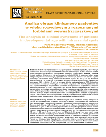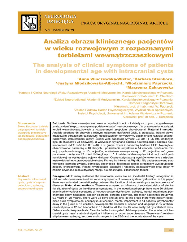 Child Neurology Neurologia Dziecięca PRACA ORYGINALNA/ORIGINAL ARTICLE Vol. 15/2006 Nr 29 Analiza obrazu klinicznego pacjentów w wieku rozwojowym z rozpoznanymi torbielami wewnątrzczaszkowymi The analysis of clinical symptoms of patients in developmental age with intracranial cysts Anna Winczewska-Wiktor, 1Barbara Steinborn, 1 Justyna Młodzikowska-Albrecht, 2Włodzimierz Paprzycki, 3 Marzenna Zakrzewska 1 1 Katedra i Klinika Neurologii Wieku Rozwojowego Akademii Medycznej im. Karola Marcinkowskiego w Poznaniu Kierownik: dr hab. med. B. Steinborn 2 Zakład Neuroradiologii Akademii Medycznej im. Karola Marcinkowskiego w Poznaniu, Ośrodek Diagnostyki Obrazowej Kierownik: prof. dr hab. med. W. Paprzycki 3 Zakład Podstaw Badań Psychologicznych, Wydział Nauk Społecznych, Instytut Psychologii, Uniwersytet im. Adama Mickiewicza w Poznaniu Kierownik: prof. dr hab. J. Brzeziński Streszczenie Słowa kluczowe: torbiele pajęczynówki, torbiele przegrody przezroczystej, padaczka, przestrzeń podpajęczynówkowa.. Założenie: Torbiele wewnątrzczaszkowe w populacji dzieci i młodzieży są często „przypadkowym znaleziskiem” rozpoznawanym na podstawie badań neuroobrazowych. W pracy oceniano związek torbieli wewnątrzczaszkowych z rozpoznanymi zespołami chorobowymi. Materiał i metoda: Analizie poddano 66 chorych z różnymi objawami dysfunkcji OUN, tj. padaczką, bólami głowy, mózgowym porażeniem dziecięcym, upośledzeniem umysłowym, opóźnieniem rozwoju psychoruchowego, zaburzeniami mowy. Średni wiek badanych wynosił 9,3 lata (1–25 lat). Badanych było 38 chłopców i 28 dziewcząt. U wszystkich wykonano badanie neurologiczne i badanie neuroobrazowe (MRI n=58 lub KT n=8), a w grupie dzieci z padaczką badanie EEG. Najczęściej obserwowano: padaczkę u 40 chorych, upośledzenie umysłowe u 14 chorych, opóźnienie rozwoju psychoruchowego u 15 pacjentów, opóźnienie rozwoju mowy u 12 pacjentów, mózgowe porażenie dziecięce u 12 dzieci i bóle głowy u 10. Analizie poddano wpływ lokalizacji nad- i podnamiotowej na występujące objawy kliniczne. Ocenę statystyczną wyników wykonano z użyciem testów dokładnego prawdopodobieństwa Fishera i chi-kwadrat. Wyniki: Nie zaobserwowano statystycznie istotnego związku pomiędzy obecnością i lokalizacją torbieli a rodzajem występującego zespołu chorobowego. Rodzaj występującej padaczki i napadów padaczkowych oraz zmian w zapisie czynności bioelektrycznej mózgu nie ma związku z lokalizacją torbieli. Abstract Key words: intracranial cysts, cysts of septum pellucidum, epilepsy, subarachnoid space Background: In many instances the intracranial cysts are an „incidental finding” recognition in children who were examined for various symptoms of nervous system dysfunction. In this paper there was estimated the relationship between the location of intracranial cysts and occurrence of diseases. Material and methods: There was analyzed an influence of supratentorial or infratentorial situation of cysts on the diseases symptoms. In the investigated group there were 66 children examined for various symptoms of nervous system dysfunction: epilepsy, mental impairment, psychomotor delay, headache, speech disorders, cerebral palsy etc. The mean age in this group was 9.3 years (1–25 years). There were 38 boys and 28 girls. In this group there were mostly recognized such symptoms as: epilepsy in 40 children, mental impairment in 14 patients, psychomotor delay in the group of 15 children, developmental disorder of speech and language in 12 of them, cerebral palsy in 12 and headache in 10 children. All the results were analyzed by statistical tests: Fishers’ and chi-square tests. Results: In the investigated children population the location of intracranial cysts hasn’t statistical significant influence on occurrence diseases. There wasn’t relationship between epilepsy, seizures and changes in the EEG and the localization of the cysts. Vol. 15/2006, Nr 29 35 Anna Winczewska-Wiktor, Barbara Steinborn, Justyna Młodzikowska-Albrecht et al. Wstęp Torbiele pajęczynówki są określane mianem patologicznych zbiorników płynowych, otoczonych błoną o budowie zbliżonej lub identycznej z pajęczynówką i wypełnionych płynem identycznym lub zbliżonym do płynu mózgowo-rdzeniowego. Ze względu na etiologię torbiele pajęczynówki dzieli się na pierwotne, powstające w życiu płodowym, oraz wtórne, powstające w życiu pozapłodowym, najczęściej w wyniku procesu zapalnego lub urazu [1]. W większości określane są jako zmiany sporadycznie występujące, nie mające podłoża genetycznego. Znane są jednak opisy rodzinnego występowania torbieli [2]. W jednej z rodzin opisano delecję na długim ramieniu chromosomu 16 prawdopodobnie odpowiedzialną za obecność torbieli [29]. Częstość występowania wrodzonych torbieli pajęczynówki ocenia się na 1–2% nieurazowych zmian wewnątrzczaszkowych [3, 4, 23, 26, 27]. W 90% występują pojedynczo, choć opisywano przypadki dzieci z torbielami mnogimi [5]. Torbiele pajęczynówki mają charakter dynamiczny, ich wielkość może ulegać zmianie, mogą samoistnie zanikać lub powiększać się [4, 6]. Istnieje kilka hipotez próbujących wyjaśnić podłoże obserwowanych zmian. Najpopularniejszą z nich jest hipoteza zastawki zlokalizowanej pomiędzy torbielą a przestrzenią podpajęczynówkową. Inna z hipotez oparta jest na istnieniu gradientu ciśnień pomiędzy płynem wewnątrz torbieli, a płynem mózgowo-rdzeniowym (PMR), kolejna z hipotez zakłada obecność komórek, zlokalizowanych w ścianie torbieli, mających właściwości wydzielnicze [7]. Żadna z nich w sposób jednoznaczny nie wyjaśnia dynamicznego charakteru torbieli. Przegroda przezroczysta jest pośrodkowo położoną szczelinowatą strukturą, zbudowaną z dwóch blaszek rozpiętych pomiędzy przednią częścią ciała modzelowatego a słupami sklepienia. Blaszki te stanowią ograniczenie boc
