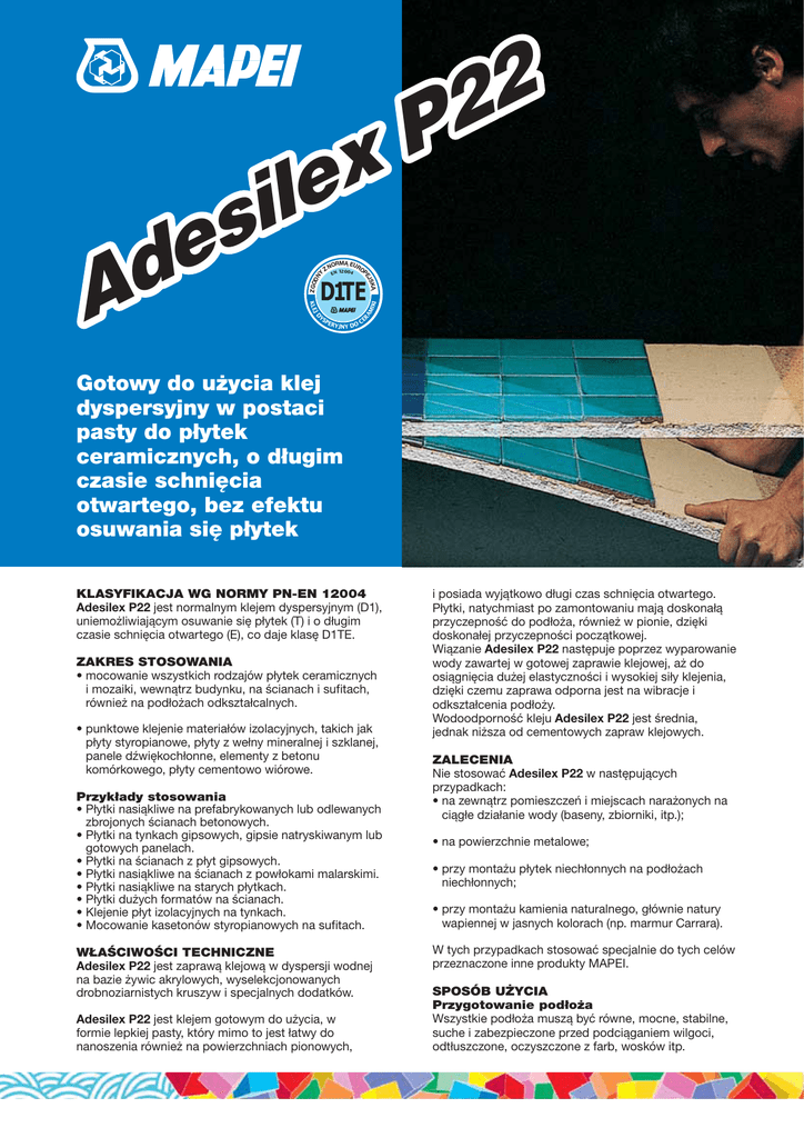 ORMĄ EUR Z N N 12004 O YS PE RA JD K LE MI KI E Ą JSK PE ZGOD NY 2 2 P x e l i s e d A RYJNY DO C E Gotowy do użycia klej dyspersyjny w postaci pasty do płytek ceramicznych, o długim czasie schnięcia otwartego, bez efektu osuwania się płytek KLASYFIKACJA WG NORMY PN-EN 12004 Adesilex P22 jest normalnym klejem dyspersyjnym (D1), uniemożliwiającym osuwanie się płytek (T) i o długim czasie schnięcia otwartego (E), co daje klasę D1TE. ZAKRES STOSOWANIA • mocowanie wszystkich rodzajów płytek ceramicznych i mozaiki, wewnątrz budynku, na ścianach i sufitach, również na podłożach odkształcalnych. • punktowe klejenie materiałów izolacyjnych, takich jak płyty styropianowe, płyty z wełny mineralnej i szklanej, panele dźwiękochłonne, elementy z betonu komórkowego, płyty cementowo wiórowe. Przykłady stosowania • Płytki nasiąkliwe na prefabrykowanych lub odlewanych zbrojonych ścianach betonowych. • Płytki na tynkach gipsowych, gipsie natryskiwanym lub gotowych panelach. • Płytki na ścianach z płyt gipsowych. • Płytki nasiąkliwe na ścianach z powłokami malarskimi. • Płytki nasiąkliwe na starych płytkach. • Płytki dużych formatów na ścianach. • Klejenie płyt izolacyjnych na tynkach. • Mocowanie kasetonów styropianowych na sufitach. WŁAŚCIWOŚCI TECHNICZNE Adesilex P22 jest zaprawą klejową w dyspersji wodnej na bazie żywic akrylowych, wyselekcjonowanych drobnoziarnistych kruszyw i specjalnych dodatków. Adesilex P22 jest klejem gotowym do użycia, w formie lepkiej pasty, który mimo to jest łatwy do nanoszenia również na powierzchniach pionowych, i posiada wyjątkowo długi czas schnięcia otwartego. Płytki, natychmiast po zamontowaniu mają doskonałą przyczepność do podłoża, również w pionie, dzięki doskonałej przyczepności początkowej. Wiązanie Adesilex P22 następuje poprzez wyparowanie wody zawartej w gotowej zaprawie klejowej, aż do osiągnięcia dużej elastyczności i wysokiej siły klejenia, dzięki czemu zaprawa odporna jest na wibracje i odkształcenia podłoży. Wodoodporność kleju Adesilex P22 jest średnia, jednak niższa od cementowych zapraw klejowych. ZALECENIA Nie stosować Adesilex P22 w następujących przypadkach: • na zewnątrz pomieszczeń i miejscach narażonych na ciągłe działanie wody (baseny, zbiorniki, itp.); • na powierzchnie metalowe; • przy montażu płytek niechłonnych na podłożach niechłonnych; • przy montażu kamienia naturalnego, głównie natury wapiennej w jasnych kolorach (np. marmur Carrara). W tych przypadkach stosować specjalnie do tych celów przeznaczone inne produkty MAPEI. SPOSÓB UŻYCIA Przygotowanie podłoża Wszystkie podłoża muszą być równe, mocne, stabilne, suche i zabezpieczone przed podciąganiem wilgoci, odtłuszczone, oczyszczone z farb, wosków itp. [sche1] 121_adesilex p22_pl (03.10.2007 - 3ª Bozza/Ciano/PDF) 22 P ex l i es d A Świeże podłoża cementowe powinny być odpowiednio wysezonowane (tzn. powinny schnąć przez przynajmniej tydzień na każdy 1 cm grubości). W przeciwnym razie czas wiązania kleju Adesilex P22 wydłuży się. Adesilex P22 może być stosowany na podłoża gipsowe i im podobne bez konieczności stosowania środka gruntującego, pod warunkiem, że podłoże jest suche i mocne. Adesilex P22 może być stosowany do montażu chłonnych płytek ceramicznych na ścianach pomalowanych farbami emulsyjnymi, akrylowymi lub olejnymi, pod warunkiem, że są odpowiednio mocno związane z podłożem. Nie zaleca się jednak stosowania Adesilex P22 na podłoża bielone wapnem. Montaż płyt styropianowych na suficie Nanoszenie zaprawy Adesilex P22 nanosi się na podłoże za pomocą szpachli zębatej. Należy wybrać taką szpachlę aby pozwalała ona na pokrycie wewnętrznej strony płytek w co najmniej 65%. • mozaika do formatu 5x5 cm - szpachla nr 4 MAPEI o kwadratowym zębie (zużycie ok. 1,5 kg/m2); • płytki ceramiczne standardowe - szpachla nr 5 MAPEI o rombowym zębie (zużycie ok. 2,5 kg/m2); • na nierówne podłoża i płytki o wyprofilowanej wewnętrznej stronie szpachla nr 6 MAPEI o rombowym zębie (zużycie ok. 4,0 kg/m2). Montaż płytek na ścianie gipsowej Czas schnięcia otwartego kleju Adesilex P22 w warunkach normalnych temperatur i wilgotności wynosi 40-45 minut, w tym czasie należy wykorzystać nałożoną partię kleju (4-6 m2 przy jednej porcji kleju). Jeżeli na powierzchni wytworzyła się tzw. warstwa naskórka klejowego, rozprowadzony na powierzchni klej należy przeciągnąć jeszcze raz pacą. Nie należy prowadzić prac w temperaturach niższych niż +5°C. Układanie płytek Przy montażu płytek na zaprawę klejową Adesilex P22 nie jest wymagane moczenie płytek, jedynie w wypadku dużego zakurzenia wewnętrznej strony płytki, należy przepłukać je wodą. Płytki należy układać na ścianę z naniesioną zaprawą klejową, pamiętając o lekkim dociśnięciu i dobrym kontakcie płytki z zaprawą klejową; po zamocowaniu płytki nie osuwają się również na powierzchniach pionowych. Ewentualna korekta już nałożonych płytek może być wykonana w ciągu 60 minut. Płytki położone na zaprawę klejową Adesilex P22 nie powinny być narażone na działanie wody przez pierwsze 10 dni. Montaż płytek na ścianie z tradycyjnym tynkiem Klejenie materiałów izolacyjnych W przypadku montażu płyt izolacyjnych, ozdób sufitowych, bloczków gazobetonowych, itp., można nanosić Adesilex P22 zarówno punktowo jak i na całej powierzchni. Adesilex P22 należy nanosić przy pomocy szpachli zębatej lub kielni, w ilości zapewniającej przyklejenie materiału do powierzchni, mając na uwadze czas schnięcia otwartego. Wybrane materiały mocować lekko dociskając do podłoża, aby zagwarantować odpowiedni kontakt z klejem Adesilex P22. SPOINOWANIE Spoiny pomiędzy płytkami mogą być wypełniane po 24 godzinach gotowymi zaprawami fugowymi cementowymi lub epoksydowymi MAPEI, do