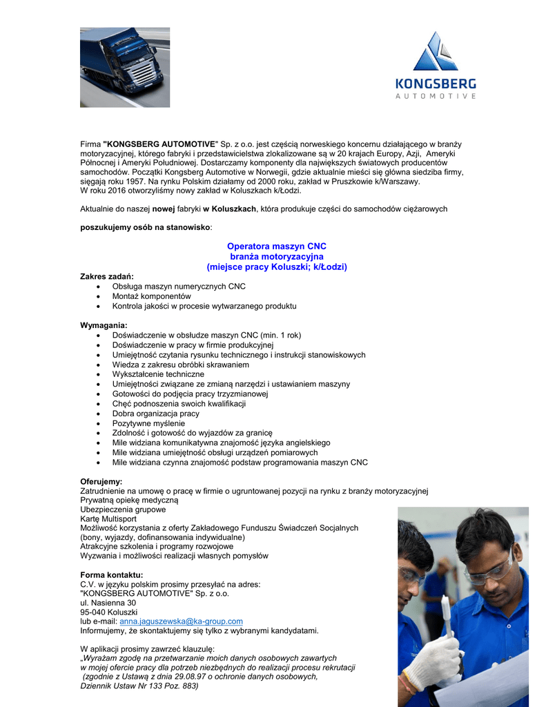 Firma "KONGSBERG AUTOMOTIVE" Sp. z o.o. jest częścią norweskiego koncernu działającego w branży motoryzacyjnej, którego fabryki i przedstawicielstwa zlokalizowane są w 20 krajach Europy, Azji, Ameryki Północnej i Ameryki Południowej. Dostarczamy komponenty dla największych światowych producentów samochodów. Początki Kongsberg Automotive w Norwegii, gdzie aktualnie mieści się główna siedziba firmy, sięgają roku 1957. Na rynku Polskim działamy od 2000 roku, zakład w Pruszkowie k/Warszawy. W roku 2016 otworzyliśmy nowy zakład w Koluszkach k/Łodzi. Aktualnie do naszej nowej fabryki w Koluszkach, która produkuje części do samochodów ciężarowych poszukujemy osób na stanowisko: Operatora maszyn CNC branża motoryzacyjna (miejsce pracy Koluszki; k/Łodzi) Zakres zadań: Obsługa maszyn numerycznych CNC Montaż komponentów Kontrola jakości w procesie wytwarzanego produktu Wymagania: Doświadczenie w obsłudze maszyn CNC (min. 1 rok) Doświadczenie w pracy w firmie produkcyjnej Umiejętność czytania rysunku technicznego i instrukcji stanowiskowych Wiedza z zakresu obróbki skrawaniem Wykształcenie techniczne Umiejętności związane ze zmianą narzędzi i ustawianiem maszyny Gotowości do podjęcia pracy trzyzmianowej Chęć podnoszenia swoich kwalifikacji Dobra organizacja pracy Pozytywne myślenie Zdolność i gotowość do wyjazdów za granicę Mile widziana komunikatywna znajomość języka angielskiego Mile widziana umiejętność obsługi urządzeń pomiarowych Mile widziana czynna znajomość podstaw programowania maszyn CNC Oferujemy: Zatrudnienie na umowę o pracę w firmie o ugruntowanej pozycji na rynku z branży motoryzacyjnej Prywatną opiekę medyczną Ubezpieczenia grupowe Kartę Multisport Możliwość korzystania z oferty Zakładowego Funduszu Świadczeń Socjalnych (bony, wyjazdy, dofinansowania indywidualne) Atrakcyjne szkolenia i programy rozwojowe Wyzwania i możliwości realizacji własnych pomysłów Forma kontaktu: C.V. w języku polskim prosimy przesyłać na adres: "KONGSBERG AUTOMOTIVE" Sp. z o.o. ul. Nasienna 30 95-040 Koluszki lub e-mail: [email protected] Informujemy, że skontaktujemy się tylko z wybranymi kandydatami. W aplikacji prosimy zawrzeć klauzulę: „Wyrażam zgodę na przetwarzanie moich danych osobowych zawartych w mojej ofercie pracy dla potrzeb niezbędnych do realizacji procesu rekrutacji (zgodnie z Ustawą z dnia 29.08.97 o ochronie danych osobowych, Dziennik Ustaw Nr 133 Poz. 883)