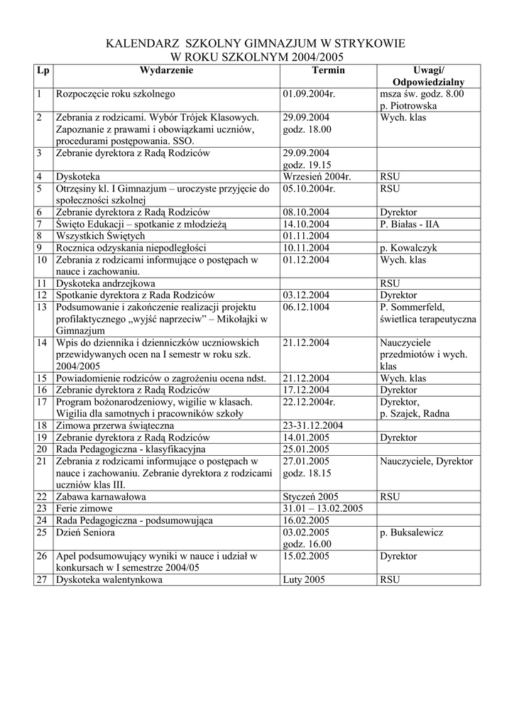 KALENDARZ SZKOLNY GIMNAZJUM W STRYKOWIE