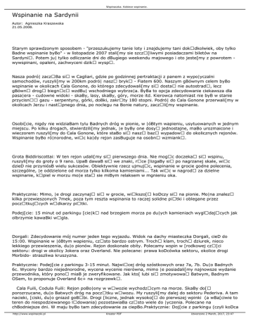 Wspinaczka. Kobiece wspinanie. Wspinanie na Sardynii Autor: Agnieszka Kraszewska 21.05.2008. Starym sprawdzonym sposobem - "przeszukujemy tanie loty i znajdujemy tani dokdkolwiek, oby tylko Badne wspinanie byBo" - w listopadzie 2007 stali[my sie szcz[liwymi posiadaczami biletów na Sardyni. Potem ju| tylko odliczanie dni do dBugiego weekendu majowego i oto jeste[my z powrotem wywspinani, opaleni, zachwyceni dzik wysp. Nasza podró| zaczBa si w Cagliari, gdzie po godzinnej pertraktacji z panem z wypo|yczalni samochodów, ruszyli[my w 200km podró| nasz bryk - Fiatem 600. Naszym gBównym celem byBo wspinanie w okolicach Cala Gonone, do którego zdecydowali[my si dosta nie autostrad, lecz gBówn drog biegnc wzdBu| wschodniego wybrze|a. ByBa to opcja zdecydowanie ciekawsza dla pasa|era - cudowne widoki - skaBy, lasy, skaBy, góry, morze itd. Kierowca natomiast nie byB w stanie przycisn gazu - serpentyny, górki, doBki, zakrty 180 stopni. Podró| do Cala Gonone przerwali[my w okolicach Jerzu i nastpnego dnia, po noclegu na Bonie natury, zaczli[my wspinanie. Osobi[cie, nigdy nie widziaBam tylu Badnych dróg w pionie, w |óBtym wapieniu, usytuowanych w jednym miejscu. Po kilku drogach, stwierdzili[my jednak, |e byBy one dosy jednostajne, maBo urozmaicone i wieczorem ruszyli[my do Cala Gonone, które staBo si nasz baz wypadow do okolicznych rejonów. Wspinanie byBo ró|norodne, wic ka|dy rejon zasBuguje na osobn wzmiank. Grota Biddiriscottai: W ten rejon udali[my si pierwszego dnia. Nie mogc doczeka si wspinu, ruszyli[my do groty o 9 rano. UpaB dawaB si we znaki, rce [lizgaBy si po nagrzanej skale, wic dzieD nie przyniósB wielu sukcesów. Obiektywnie rzecz ujmujc, wspinanie w grocie godne polecenia, szczególne, |e oddzielone od morza tylko kilkoma kamieniami... Tak wic w nagrod za dzielne wspinanie, kpiel w morzu mo|e sta sie miBym relaksem w mgnieniu oka. Praktycznie: Mimo, |e drogi zaczynaj si w grocie, wikszo[ koDczy si na pionie. Mo|na znalez kilka przewieszonych 7mek, poza tym reszta wspinania to raczej solidne pitki i oblegane przez pocztkujcych wdkarzy pitki. Podej[cie: 15 minut od parkingu [cie|k nad brzegiem morza po du|ych kamieniach wygldajcych jak olbrzymie kawaBki wgla. Dorgali: Zdecydowanie mój numer jeden tego wyjazdu. Widok na dachy miasteczka Dorgali, cieD do 15:00. Wspinanie w |óBtym wapieniu, czsto bardzo ostrym. Troch klam, troch dziurek, nieco lekkiego przewieszenia, du|o pionów. Rejon doskonale obity. Polecamy wspin w [rodkowej cz[ci sektoru: drogi w okolicy Jokera oraz Overland. Nie polecane: prawa koDcówka sektoru, okolice drogi Morbido- straszliwa kruszyzna. Praktycznie: Podej[cie z parkingu 3-15 minut. Najwicej dróg szóstkowych oraz 7a, 7b. Du|o Badnych 6c. Wyceny bardzo niejednorodne, wycena wycenie nierówna, mimo |e posiadali[my najnowsze wydanie przewodnika, który pono miaB je zweryfikowane. Jak kto[ lubi si zmotywowa Batwym, Badnym OSem, to proponuje Overland 6c+ na rozgrzewk. Cala Fuili, Codula Fuili: Rejon poBo|ony w wwozie wychodzcym na morze. SkaBy do[ porozrzucane, du|o Batwych dróg na pocztku wwozu. My ruszyli[my dalej do sektoru Pederiva. A tam nacieki, [ciski, du|o gniazd goBbi. Drogi [liczne, jednak wysoko[ do pierwszej wpinki (a wBa[ciwie to teren do niespodziewanego ldowania) pozostawiaBa czsto wiele do |yczenia. Polecane na chBodniejsze dni. W maju byBo tam zdecydowanie za ciepBo.Praktycznie: Doj[cie z parkingu (czyli koDca http://www.wspinaczki.pl Kreator PDF Utworzono 2 March, 2017, 23:47 Wspinaczka. Kobiece wspinanie. drogi z Cala Gonone do Cala Fuili) okoBo 25 minut. Drogi 6c-8a+ z przewag 7c+. Cala Luna: Zwiedzili[my tylko jako pla|owicze, w dzieD restowy. Turkusowa woda, rybki podgryzajce palce u stóp, biaBy piasek, nawet na mnie zagorzaBej anypla|owiczce mieszkajcej na staBe 10min od morza miejsce zrobiBo du|e wra|enie. Gdy dotarli[my tam ok. 10:00 pla|a byBa prawie pusta (oprócz kpicych sie 2 golasów), potem zjawiBo si troch turystów. Wspinacze zaczli dziaBalno[ dopiero okoBo 16:00. Wcze[niej sBoDce pra|yBo niemiBosiernie. Drogi wygldaBy zachcajco, ale oceniali[my tylko po wygldzie. Praktycznie: Doj[cie bardzo Badnym szlakiem z wwozu Cala Fuili, ten sam parking-droga. Czas doj[cia wg przewodnika 2h, wedBug nas (bez szpeju) jakie[ 2,5 szybkim tempem z jednym zatrzymaniem na siku. Mo|liwo[ dopBynicia promem z portu w Cala Gonone 12E w obie strony, 10 w jedn. Po tygodniowym pobycie w Cala Gonone, nadszedB czas powrotu do domu. Tym razem wybrali[my drog szybkiego ruchu i szybko, cho w mniej piknych okoliczno[ciach przyrody dotarli[my do Cagliari. Informacje bardzo praktyczne:Spanie: W Cala Gonone znajduj si 2 kempingi w niebagatelnej cenie 10E oraz 13E (do czerwca, potem 16E) za osob. Raz dali[my si zwie[ cenie 10E |dni kpieli w ciepBej wodzie, po czym okazaBo si, |eby z prysznica jakakolwiek woda poleciaBa nale|y dodatkowo zapBaci...Miejsc do spania na dziko na pewno si znajdzie. W okolicach znajduje si du|o lasów, kwestia znalezienia pBaskiego terenu oraz zostawienia samochodu na noc bez opieki. Mo|na te| przespa sie w aucie na parkingu- drodze koBo Cala Fuili, co te| czynili[my. Póki co rejon jest czysty, wic je[li kto[ zdecyduje si na t opcj proponuje u|ywa saperki lub chocia| kamyczków, co by taki jak najdBu|ej pozostaB. Du|o kwater do wynajcia. Jedzenie: Ceny niestety wysokie. W Cala Gonone i oddalonym o 6km Dorgali kilka samoobsBugowych sklepów. PrzykBadowe ceny: pieczywo 3E/kg, ser 512E/kg, kilogram pomidorów 2,5E, jogurty 0,3-07E.Naszym gBównym po|ywieniem staBa si pizza i lody. Polecamy pizzer tu| obok ko[cioBa - du|a, smaczna i przystpna cenowo: 4-7E za caB pizz. Lody tu| obok w kawiarni Iris, 2E za 2 gaBki, w lodziarni powy|ej w drewnianej budce ceny takie same, ale lody mniejsze:) Transport: Nic nie jest niemo|liwe, wic wspin w rejonie Cala Gonone te| z pewno[ci daBo by si zorganizowa, ale ci|ko. Szkoda skupi si tylko na jednym rejonie, a odlegBo[ci s za du|e, |eby chodzi, autobusy je|d| rzadko. My korzystali[my z wy