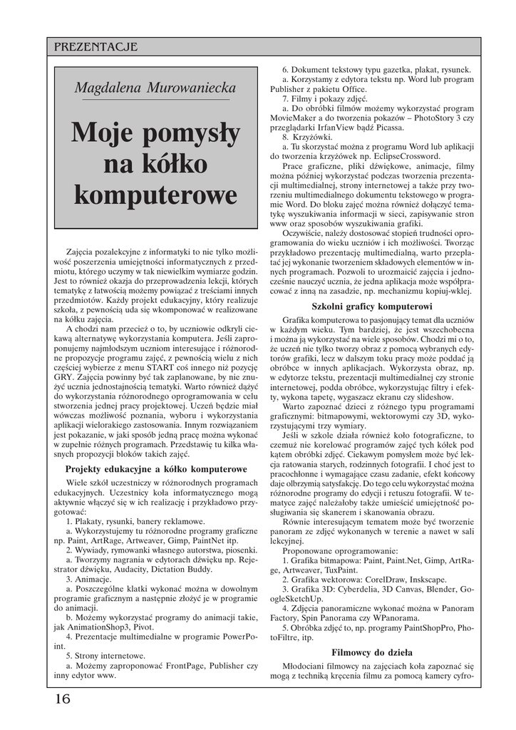 PREZENTACJE Magdalena Murowaniecka Moje pomysły na kółko komputerowe Zajęcia pozalekcyjne z informatyki to nie tylko możliwość poszerzenia umiejętności informatycznych z przedmiotu, którego uczymy w tak niewielkim wymiarze godzin. Jest to również okazja do przeprowadzenia lekcji, których tematykę z łatwością możemy powiązać z treściami innych przedmiotów. Każdy projekt edukacyjny, który realizuje szkoła, z pewnością uda się wkomponować w realizowane na kółku zajęcia. A chodzi nam przecież o to, by uczniowie odkryli ciekawą alternatywę wykorzystania komputera. Jeśli zaproponujemy najmłodszym uczniom interesujące i różnorodne propozycje programu zajęć, z pewnością wielu z nich częściej wybierze z menu START coś innego niż pozycję GRY. Zajęcia powinny być tak zaplanowane, by nie znużyć ucznia jednostajnością tematyki. Warto również dążyć do wykorzystania różnorodnego oprogramowania w celu stworzenia jednej pracy projektowej. Uczeń będzie miał wówczas możliwość poznania, wyboru i wykorzystania aplikacji wielorakiego zastosowania. Innym rozwiązaniem jest pokazanie, w jaki sposób jedną pracę można wykonać w zupełnie różnych programach. Przedstawię tu kilka własnych propozycji bloków takich zajęć. Projekty edukacyjne a kółko komputerowe Wiele szkół uczestniczy w różnorodnych programach edukacyjnych. Uczestnicy koła informatycznego mogą aktywnie włączyć się w ich realizację i przykładowo przygotować: 1. Plakaty, rysunki, banery reklamowe. a. Wykorzystujemy tu różnorodne programy graficzne np. Paint, ArtRage, Artweaver, Gimp, PaintNet itp. 2. Wywiady, rymowanki własnego autorstwa, piosenki. a. Tworzymy nagrania w edytorach dźwięku np. Rejestrator dźwięku, Audacity, Dictation Buddy. 3. Animacje. a. Poszczególne klatki wykonać można w dowolnym programie graficznym a następnie złożyć je w programie do animacji. b. Możemy wykorzystać programy do animacji takie, jak AnimationShop3, Pivot. 4. Prezentacje multimedialne w programie PowerPoint. 5. Strony internetowe. a. Możemy zaproponować FrontPage, Publisher czy inny edytor www. 16 6. Dokument tekstowy typu gazetka, plakat, rysunek. a. Korzystamy z edytora tekstu np. Word lub program Publisher z pakietu Office. 7. Filmy i pokazy zdjęć. a. Do obróbki filmów możemy wykorzystać program MovieMaker a do tworzenia pokazów – PhotoStory 3 czy przeglądarki IrfanView bądź Picassa. 8. Krzyżówki. a. Tu skorzystać można z programu Word lub aplikacji do tworzenia krzyżówek np. EclipseCrossword. Prace graficzne, pliki dźwiękowe, animacje, filmy można później wykorzystać podczas tworzenia prezentacji multimedialnej, strony internetowej a także przy tworzeniu multimedialnego dokumentu tekstowego w programie Word. Do bloku zajęć można również dołączyć tematykę wyszukiwania informacji w sieci, zapisywanie stron www oraz sposobów wyszukiwania grafiki. Oczywiście, należy dostosować stopień trudności oprogramowania do wieku uczniów i ich możliwości. Tworząc przykładowo prezentację multimedialną, warto przeplatać jej wykonanie tworzeniem składowych elementów w innych programach. Pozwoli to urozmaicić zajęcia i jednocześnie nauczyć ucznia, że jedna aplikacja może współpracować z inną na zasadzie, np. mechanizmu kopiuj-wklej. Szkolni graficy komputerowi Grafika komputerowa to pasjonujący temat dla uczniów w każdym wieku. Tym bardziej, że jest wszechobecna i można ją wykorzystać na wiele sposobów. Chodzi mi o to, że uczeń nie tylko tworzy obraz z pomocą wybranych edytorów grafiki, lecz w dalszym toku pracy może poddać ją obróbce w innych aplikacjach. Wykorzysta obraz, np. w edytorze tekstu, prezentacji multimedialnej czy stronie internetowej, podda obróbce, wykorzystując filtry i efekty, wykona tapetę, wygaszacz ekranu czy slideshow. Warto zapoznać dzieci z różnego typu programami graficznymi: bitmapowymi, wektorowymi czy 3D, wykorzystującymi trzy wymiary. Jeśli w szkole działa również koło fotograficzne, to czemuż nie korelować programów zajęć tych kółek pod kątem obróbki zdjęć. Ciekawym pomysłem może być lekcja ratowania starych, rodzinnych fotografii. I choć jest to pracochłonne i wymagające czasu zadanie, efekt końcowy daje olbrzymią satysfakcję. Do tego celu wykorzystać można różnorodne programy do edycji i retuszu fotografii. W tematyce zajęć należałoby także umieścić umiejętność posługiwania się skanerem i skanowania obrazu. Równie interesującym tematem może być tworzenie panoram ze zdjęć wykonanych w terenie a nawet w sali lekcyjnej. Proponowane oprogramowanie: 1. Grafika bitmapowa: Paint, Paint.Net, Gimp, ArtRage, Artweaver, TuxPaint. 2. Grafika wektorowa: CorelDraw, Inskscape. 3. Grafika 3D: Cyberdelia, 3D Canvas, Blender, GoogleSketchUp. 4. Zdjęcia panoramiczne wykonać można w Panoram Factory, Spin Panorama czy WPanorama. 5. Obróbka zdjęć to, np. programy PaintShopPro, PhotoFiltre, itp. Filmowcy do dzieła Młodociani filmowcy na zajęciach koła zapoznać się mogą z techniką kręcenia filmu za pomocą kamery cyfro- PRZEGLĄD Edukacyjny 2 (64) wej, internetowej lub aparatu cyfrowego posiadającego taką funkcję. Pozostaje przekazać im wiedzę na temat przesyłania materiału filmowego na dysk i rozpocząć tworzenie filmu w programie MovieMaker. Jeśli w szkole brak tego typu wyposażenia, to postarajmy zabawić się w tworzenie filmów animowanych. Oczywiście, warto te lekcje poprzedzić ciekawostkami ze świata filmu i jego historią. Moi uczniowie bardzo polubili program do animacji Pivot. Tworzą w nim filmy z galerii aktorów, zbudowanych z odcinków i okręgów, wymyślają też własnych. W programie graficznym malujemy scenerię do klatek. A ponieważ program nie pozwala na zapis w innym niż własny format, poradziliśmy sobie w inny sposób. Sfilmowaliśmy odtwarzaną w programie animację za pomocą prog
