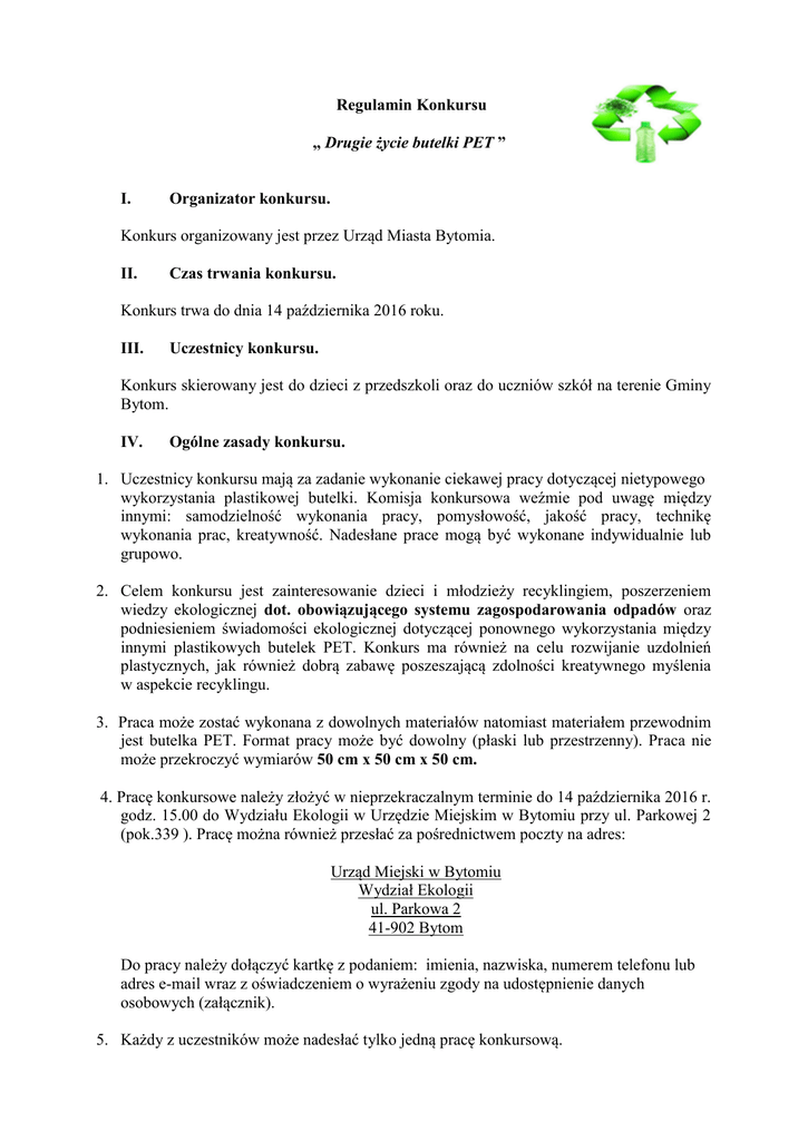 Regulamin Konkursu „ Drugie życie butelki PET ” I. Organizator konkursu. Konkurs organizowany jest przez Urząd Miasta Bytomia. II. Czas trwania konkursu. Konkurs trwa do dnia 14 października 2016 roku. III. Uczestnicy konkursu. Konkurs skierowany jest do dzieci z przedszkoli oraz do uczniów szkół na terenie Gminy Bytom. IV. Ogólne zasady konkursu. 1. Uczestnicy konkursu mają za zadanie wykonanie ciekawej pracy dotyczącej nietypowego wykorzystania plastikowej butelki. Komisja konkursowa weźmie pod uwagę między innymi: samodzielność wykonania pracy, pomysłowość, jakość pracy, technikę wykonania prac, kreatywność. Nadesłane prace mogą być wykonane indywidualnie lub grupowo. 2. Celem konkursu jest zainteresowanie dzieci i młodzieży recyklingiem, poszerzeniem wiedzy ekologicznej dot. obowiązującego systemu zagospodarowania odpadów oraz podniesieniem świadomości ekologicznej dotyczącej ponownego wykorzystania między innymi plastikowych butelek PET. Konkurs ma również na celu rozwijanie uzdolnień plastycznych, jak również dobrą zabawę poszeszającą zdolności kreatywnego myślenia w aspekcie recyklingu. 3. Praca może zostać wykonana z dowolnych materiałów natomiast materiałem przewodnim jest butelka PET. Format pracy może być dowolny (płaski lub przestrzenny). Praca nie może przekroczyć wymiarów 50 cm x 50 cm x 50 cm. 4. Pracę konkursowe należy złożyć w nieprzekraczalnym terminie do 14 października 2016 r. godz. 15.00 do Wydziału Ekologii w Urzędzie Miejskim w Bytomiu przy ul. Parkowej 2 (pok.339 ). Pracę można również przesłać za pośrednictwem poczty na adres: Urząd Miejski w Bytomiu Wydział Ekologii ul. Parkowa 2 41-902 Bytom Do pracy należy dołączyć kartkę z podaniem: imienia, nazwiska, numerem telefonu lub adres e-mail wraz z oświadczeniem o wyrażeniu zgody na udostępnienie danych osobowych (załącznik). 5. Każdy z uczestników może nadesłać tylko jedną pracę konkursową. 6. Organizator konkursu zastrzega sobie prawo do wykorzystania prac konkursowych w celu popularyzacji świadomości ekologicznej wsród mieszkańców Gminy Bytom. 7. Uczestnicy konkursu ponoszą odpowiedzialność za naruszenie praw autorskich osób trzecich, w szczególności praw autorskich. V. Nagrody w konkursie. 1. W konkursie przewidziane są indywidualne nagrody za zajęcie I, II i III miejsca. Nagrodami w konkursie będą bony podarunkowe. I miejsce – bon o wartości 200 złotych, II miejsce – bon o wartości 100 złotych, III miejsce – bon o wartości 50 złotych. 2. Komisja konkursowa wyłoni laureatów konkursu do dnia 21 października 2016 roku. Wynik zostanie podany publicznie na stronie internetowej Urzędu Miejskiego w Bytomia: http://www.bytom.pl 3. W przypadku prac grupowych nagroda podlega podziałowi pomiędzy autorów. 4. Informacja o wygranej zostanie wysłana drogą elektroniczną na adres e-mail lub przekazana telefonicznie. VI. Wręczenie nagrody. Nagroda zostanie wręczona w siedzibie Urzędu Miasta Bytomia przy ul. Parkowej 2 VII. Postanowienia końcowe. 1. Urząd Miasta Bytomia zastrzega sobie prawo zmiany postanowień niniejszego Regulaminu w dowolnym terminie bez podania przyczyny przy zastosowaniu odpowiednich form informacji i zawiadomień uczestników konkursu. Za odpowiednią formę poinformowania uczestników o zmianie w Regulaminie konkursu uważa się podanie informacji przez stronę internetową www.bytom.pl. 2. Dostarczenie przez uczestnika konkursu pracy konkursowej jest równoznaczne z akceptacją niniejszego Regulaminu. Dajcie butelkom drugie życie i wyczarujcie z nich wszystko to, co podpowiada wyobraźnia! Załącznik OŚWIADCZENIE o wyrażeniu zgody na udostępnienie danych osobowych w związku z konkursem W związku z przystąpieniem do konkursu „Drugie życie butelki PET ” realizowanym przez Wydział Ekologii Urzędu Miejskiego w Bytomiu Ja ……………………………………………………………….. ………………..... ( imię/imiona nazwisko) zamieszkały/a ……………………………………………………………………….. (dokładny adres) numer telefonu kontaktowego...................................................................................... wyrażam zgodę na przetwarzanie moich danych osobowych oraz umieszczenie ich na stronie Urzędu Miejskiego w Bytomiu (http://www.bytom.pl) zgodnie z treścią ustawy z 29 sierpnia 1997 r. o ochronie danych osobowych (Dz. U. z 2014 r. poz. 1182 z późn. zm.). Data……………………………… ……………………………………. (podpis)