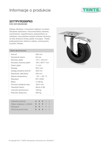Informacje o produkcie 3377PVR200P63 EAN 4031582360486 Zestaw obrotowy z hamulcem totalnym za kołem , Obudowa wykonana z tłoczonej blachy stalowej, ocynkowana i wypolerowana, pasywowana na niebiesko, dwurzędowe łożysko kulkowe obrotnicy, oś koła skręcana śrubą, płytka mocująca. Piasta polipropylenowa, bieżnia z pełnej, czarnej gumy. Łożysko rolkowe. Dane techniczne Koło-Ø 200 mm Wymiary płytki 137 x 105 mm Szerokość bieżni Rozstaw otworów płytki Otwór płytki Wysięg Zasięg działania koła-Ø Wysokość zabudowy Zakres temperatury Standard Masa Promień działania koła Twardość bieżni nośność dynamiczna Nośność statyczna Łatwość toczenia Hałas związany z ruchem Ścieranie Ochrona przed rdzą 50 mm 105 x 80/77 mm 11 mm 52.5 mm 329 mm 240 mm - 20 / + 60 °C EN 12532 3.128 kg 164.5 mm Shore A 85 160 kg 320 kg + + + + + + + + + + + + + + + + + + + + © Copyright 2017, TENTE International, www.tente.com, 02/03/2017 Informacje o produkcie 3377PVR200P63 EAN 4031582360486 © Copyright 2017, TENTE International, www.tente.com, 02/03/2017