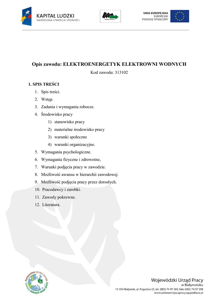 Opis zawodu: ELEKTROENERGETYK ELEKTROWNI WODNYCH Kod zawodu: 313102 1. SPIS TREŚCI 1. Spis treści. 2. Wstęp. 3. Zadania i wymagania robocze. 4. Środowisko pracy 1) stanowisko pracy 2) materialne środowisko pracy 3) warunki społeczne 4) warunki organizacyjne. 5. Wymagania psychologiczne. 6. Wymagania fizyczne i zdrowotne, 7. Warunki podjęcia pracy w zawodzie. 8. Możliwość awansu w hierarchii zawodowej. 9. Możliwość podjęcia pracy przez dorosłych. 10. Pracodawcy i zarobki. 11. Zawody pokrewne. 12. Literatura. 2. WSTĘP Elektroenergetyk elektrowni wodnych zapewnia poprawną pracę elektrowni dbając o optymalne parametry pracy odpowiednich urządzeń. Wykonuje czynności techniczne przy obsłudze, konserwacji i naprawach urządzeń elektroenergetycznych. Sprawuje nadzór nad pracą tych urządzeń oraz utrzymuje w pełnej gotowości ruchowej pomiarowe urządzenia elektryczne i hydrotechniczne, posługując się urządzeniami i aparaturą pomiarową. [1] 3. ZADANIA I WYMAGANIA ROBOCZE Elektroenergetyk na bieżąco monitoruje stan urządzeń, w szczególności hydrogeneratorów. Do zadań osoby pracującej w tym zawodzie należy: uruchamianie i wyłączanie hydrogeneratorów, sprawowanie nadzoru nad ich pracą oraz urządzeniami pomocniczymi, wykonywanie prac konserwacyjnych i remontowych urządzeń elektrycznych w ruchu i podczas postoju. kontrola nad pracą rozdzielni wysokiego i niskiego napięcia, kontrola nad pracą transformatorów oświetlenia i sygnalizacji, sprawowanie nadzoru nad pracą urządzeń hydrotechnicznych, takich jak: śluzy, jazy, przepławki oraz zbiornik wodny (w szczególności w okresie niskich i wysokich stanów wody), [3] obsługa urządzeń pomocniczych elektrowni, takich jak baterie akumulatorowe, układy sprężonego powietrza, zasilanie rezerwowe itp., dokonywanie pomiarów oporności izolacji, poboru prądu i mocy przez urządzenia energetyczne. w przypadku awarii elektroenergetyk jest osobą decydującą o postępowaniu: wyłączeniu uszkodzonego urządzenia (zastępując go rezerwowym), albo też zmniejszeniu jego obciążenia energetycznego, poprzez zmiany ustawienia przełączeń lub naprawę – czyli przywrócenie ich do pełnej sprawności. [2] Do zadań osoby pracującej w tym zawodzie może należeć także: określanie przyczyn wadliwego działania urządzeń elektrycznych, lokalizowanie usterek, usuwanie ich we własnym zakresie lub przy pomocy niezbędnych specjalistów, nadzorowanie sprawności układów rezerwowych kontrolowanie przestrzegania procedur awaryjnych w razie wystąpienia awarii, przeprowadzanie okresowych konserwacji, dokonywanie odczytów wskazań aparatury kontrolno-pomiarowej i łączeniowej, instalacji zasilającej i wprowadzania mocy, [1] przekazywanie urządzeń i instalacji elektroenergetycznych na poszczególnych zmianach, prowadzenie książki raportów oraz dziennika pracy powierzonych urządzeń wg wymogów dozoru, stosowanie bezpiecznych metod pracy, przestrzeganie przepisów bhp i ppoż. [3] Dodatkowe zadania jakich może się podjąć osoba pracująca w tym zawodzie to pełnienie funkcji dyspozytora małych elektrowni wodnych, jazów i ujęć. [3] 4. ŚRODOWISKO PRACY 1) Stanowisko pracy Osoba wykształcona w zawodzie elektroenergetyka elektrowni wodnych może zajmować różne stanowiska. Może pracować jako elektroenergetyk, ale także jako konserwator urządzeń elektroenergetycznych, instalator tych urządzeń, monter, serwisant, dyspozytor małych elektrowni wodnych, specjalista ds. sprzedaży urządzeń i systemów elektroenergetycznych [6] 2) Materialne środowisko pracy Miejscem pracy elektroenergetyka jest oczywiście przestrzeń elektrowni, w której został zatrudniony. Praca elektroenergetyka elektrowni wodnych może odbywać się w obiektach dużych, o mocy znaczącej w bilansie energetycznym kraju lub małych elektrowniach wodnych o znaczeniu lokalnym. Elektrownie wodne są ściśle związane z budowlami hydrologicznymi: tamą, zbiornikiem wodnym, układem zasilającym w wodę i układem spustowym. [6] 3) Warunki społeczne Pracownicy dużych elektrowni wodnych pracują w dużych zespołach. Kontakty między poszczególnymi pracownikami są bezpośrednie oraz za pomocą nowoczesnych technologii. W małych elektrowniach wodnych – są to mniejsze zespoły osób lub praca indywidualna. Praca na nastawniach jest zwykle pracą samodzielną i bezpośrednie kontakty z innymi pracownikami są ograniczone. [6] 4) Warunki organizacyjne Osoby zatrudnione na wydziałach utrzymania ruchu elektrowni i w nastawniach pracują w systemie pracy ciągłej. Praca wówczas jest kilkuzmianowa i we wszystkie dni tygodnia (w tym także w dni świąteczne). W dużych elektrowniach wodnych - nadzór bezpośredni zwykle jest ograniczony, istnieje jednak ciągły nadzór wynikający ze współpracy z poszczególnymi zespołami. Elektroenergetycy pracujący w dużych elektrowniach wodnych – w działach remontowych, konserwatorskich – zwykle pracują na jedną zmianę. Mogą jednak być zobowiązani do dyspozycyjności poza godzinami pracy - w przypadku poważnych awarii systemów elektroenergetycznych. [6] 5. WYMAGANIA PSYCHOLOGICZNE Elektroenergetycy zatrudnieni na stanowiskach związanych z utrzymaniem ruchu muszą wykazywać wysoką odporność na stres wynikający z odpowiedzialności za ciągłą i bezawaryjną pracę poszczególnych urządzeń. W sytuacjach awaryjnych wymagana umiejętność szybkiego podejmowania decyzji i natychmiastowego reagowania (przy zachowaniu koncentracji i logicznego myślenia). Konieczna cierpliwość, umiejętność obserwacji i abstrakcyjnego myślenia. Nie bez znaczenia w tym zawodzie jest spostrzegawczość i zdolności manualne. Ze względu na szybki rozwój w dziedzinie energetyki, elektroniki i technologii – praca w tym zawodzie wymaga gotowości do ciągłego uzupełniania wiedzy i umiejętności. Śledzenia branżowych czasopism i portali internetowych oraz uczestniczen