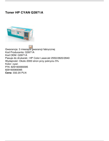 Toner HP CYAN Q3971A Gwarancja: 3 miesiące gwarancji fabrycznej Kod Producenta: Q3971A Kod OEM: Q3971A Pasuje do drukarek:: HP Color LaserJet 2550/2820/2840 Wydajność: Około 2000 stron przy pokryciu 5% Kolor: cyan P/N: 829160069395 829160069395 Cena: 332.20 PLN Powered by TCPDF (www.tcpdf.org)