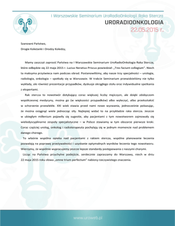 Szanowni Państwo, Drogie Koleżanki i Drodzy Koledzy, Mamy zaszczyt zaprosić Państwa na I Warszawskie Seminarium UroRadioOnkologia Raka Stercza, które odbędzie się 22 maja 2015 r. Lucius Neratius Priscus powiedział: „Tres faciunt collegium”. Niech ta maksyma przyświeca nam podczas obrad. Postanowiliśmy, aby nasze trzy specjalności – urologia, radiologia, onkologia – spotkały się w Warszawie. W trakcie Seminarium przewidzieliśmy nie tylko wykłady, ale również prezentacje przypadków, dyskusje okrągłego stołu oraz indywidualne spotkania z ekspertami. Rak stercza to nowotwór dotykający coraz większej liczby mężczyzn, ale dzięki zdobyczom współczesnej medycyny, można go (w większości przypadków) albo wyleczyć, albo przekształcić w schorzenie przewlekłe. XXI wiek stawia przed nami nowe wyzwania, jednocześnie pokazując, że można osiągnąć wiele jednocząc siły. Najlepiej widać to na przykładzie raka stercza. Jeszcze w ubiegłym millenium pojawiły się sugestie, aby pacjentami z tym nowotworem zajmowały się wielodyscyplinarne zespoły specjalistyczne – w Polsce stawiamy w tym obszarze pierwsze kroki. Coraz częściej urolog, onkolog i radioterapeuta pochylają się w jednym momencie nad problemem danego chorego. To właśnie wspólna opieka nad pacjentami z rakiem stercza, wspólne planowanie leczenia pozwalają na poprawę przeżywalności i uzyskanie optymalnych wyników leczenia tego nowotworu. Wierzymy, że wspólnie wypracujemy jeszcze lepsze standardy postępowania z naszymi chorymi. Licząc na Państwa przychylne podejście, serdecznie zapraszamy do Warszawy, niech w dniu 22 maja 2015 roku słowa „omne trium perfectum” nabiorą rzeczywistego znaczenia.