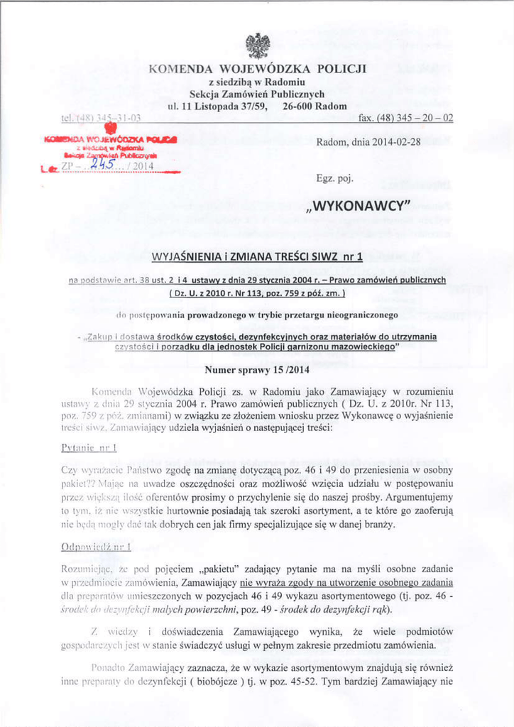 Zminan treści siwz + Wyjaśnienia nr 1 ds.15 /14