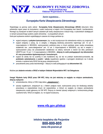 Zanim wyjedziesz… Europejska Karta Ubezpieczenia Zdrowotnego Wyjeżdżając za granicę warto zabrać Europejską Kartę Ubezpieczenia Zdrowotnego (EKUZ) dokument, który potwierdza nasze prawo do korzystania z opieki medycznej w krajach Unii Europejskiej oraz Islandii, Liechtensteinie, Norwegii czy Szwajcarii na takich samych zasadach jak osoby ubezpieczone w danym kraju, w placówkach działających w ramach powszechnego systemu opieki zdrowotnej – w przypadkach pilnych. Karta jest wydawana osobom wyjeżdżającym czasowo do innego państwa np.: wyjazd związany z pobytem tymczasowym, (np. w celu turystycznym lub odwiedzenia rodziny czy znajomych) wyjazd związany z pracą, np. w związku z delegacją służbową pracownika najemnego (art. 12 ust. 1 rozporządzenia nr 883/2004), wykonywaniem podobnej pracy w innym państwie przez osobę prowadzącą działalność tzw. „samo-delegowanie” (art. 12 ust. 2 rozporządzenia nr 883/2004), czy też w związku z wykonywaniem pracy lub prowadzeniem działalności na własny rachunek w dwóch lub kilku państwach UE/EFTA (art. 13 ust. 1 i 2 rozporządzenia nr 883/2004) - dotyczy to osób posługujących się dokumentem A1 oraz pracowników dyplomatycznych i konsularnych; wyjazd do szkoły lub na uczelnię w celu kształcenia się, lub też na praktyki studenckie/uczniowskie, na podstawie zaświadczenia z uczelni / szkoły (wypełnione zgodnie z wymogami określonym na 2 stronie wniosku o wydanie karty EKUZ dla tej grupy ubezpieczonych); poszukiwanie pracy przez bezrobotnego – dotyczy to osób posługujących się dokumentem U2; Możliwe jest złożenie wniosku o EKUZ w każdym Oddziale Wojewódzkim NFZ lub Delegaturze. Uwaga! Wydanie karty EKUZ przez OW NFZ, który nie jest właściwy ze względu na miejsce zamieszkania, dotyczy wyłącznie: wnioskodawców, którzy w CWU mają status „ubezpieczony”; sytuacji wyjątkowych, związanych np. z faktem podjęcia nauki, wykonywania pracy lub lokalizacją siedziby pracodawcy w województwie innym niż województwo, w którym ze względu na miejsce zamieszkania ubezpieczony został zgłoszony do OW NFZ. Dotyczy to również sytuacji związanych z koniecznością pilnego uzyskania karty EKUZ ze względu, np. na wyjazd turystyczny; www.nfz.gov.pl/ekuz Infolinia bezpłatna dla Pacjentów 800-800-805 www.nfz-poznan.pl Druki wniosków na karty EKUZ są dostępne w oddziałach NFZ oraz na stronie internetowej i można je składać: osobiście poprzez osobę upoważnioną (Upoważnienie powinno zawierać numer dowodu osobistego lub innego dokumentu ze zdjęciem potwierdzającego tożsamość osoby upoważnionej. Upoważnienie powinno być wydane w celu złożenia wniosku oraz odbioru karty, upoważnienie jest wymagane również od pracodawców, którzy występują z wnioskiem dla swoich pracowników) albo przesłać pocztą, faksem lub za pośrednictwem poczty e-mail (gdy na wniosku przesłanym za pośrednictwem poczty elektronicznej brak jest podpisu lub podpis jest nieczytelny, wnioskodawca ma możliwość wyłącznie odbioru osobistego karty EKUZ, jeżeli wniosek jest podpisany, zeskanowany możliwe jest odesłanie karty EKUZ na adres wskazany we wniosku lub jej odbiór przez osobę upoważnioną). Karta EKUZ wystawiana jest na okres uzależniony od uprawnień ubezpieczonego. Osoby ubezpieczone będą mogły otrzymać kartę EKUZ ważną na 6 miesięcy, np.: osoby zatrudnione, osoby prowadzące pozarolniczą oraz rolniczą działalność gospodarczą, dzieci do 18 r.ż. (okres ważności karty kończy się z dniem ukończenia przez te osoby 18 roku życia)., dzieci i młodzież powyżej 18 r.ż. na okres maksymalnie 6 miesięcy, ale nie dłużej niż ważność legitymacji szkolnej / studenckiej. W trosce o Państwa czas prosimy mieć z sobą dokumenty potwierdzające zgłoszenie do ubezpieczenia zdrowotnego oraz potwierdzenie opłacenia składek na ubezpieczenie zdrowotne za ostatni miesiąc, do przedłożenia w sytuacji braku potwierdzenia w/w faktu zgłoszenia w systemie. Osoby pobierające świadczenie emerytalne – będą mogły otrzymać kartę EKUZ ważną na 5 lat. Osoby pobierające rentę – będą mogły otrzymać kartę EKUZ ważną maksymalnie na 5 lat przy świadczeniu otrzymanym bezterminowo, w każdym innym przypadku maksymalnie na okres wynikający z dokumentu, należy mieć z sobą legitymację rencisty. Kartę EKUZ ważną 2 miesiące będą mogły otrzymać: osoby bezrobotne zarejestrowane w Urzędzie Pracy, należy posiadać ze sobą zaświadczenie z PUP, według wytycznych na 2 stronie wniosku o wydanie EKUZ, inne osoby ubezpieczone, np. osoby zgłoszone do ubezpieczenia dobrowolnego, osoby pobierające świadczenie przedemerytalne, osoby uprawnione na podstawie art. 67 ust. i 7 ustawy, należy mieć z sobą właściwy dokument, według wytycznych na 2 stronie wniosku o wydanie EKUZ. Okres ważności karty liczony jest od dnia złożenia wniosku o wydanie Europejskiej Karty Ubezpieczenia Zdrowotnego w Narodowym Funduszu Zdrowia. Infolinia bezpłatna dla Pacjentów 800-800-805 www.nfz-poznan.pl Europejska Karta Ubezpieczenia Zdrowotnego Od poniedziałku do piątku w godzinach 8:00 - 16:00 Oddział WOW NFZ Poznań, ul. Piekary 14/15, pok.703-704 tel. 61 850 63 84, 61 850 63 94, fax. 61 850 60 68 Delegatury WOW NFZ 62-800 Kalisz, ul. Kolegialna 4 tel. 62 501 89 75 [email protected] 62-500 Konin, ul. Szpitalna 43 EKUZ - tel. 63 240 29 18 [email protected] 64-100 Leszno, Pl. Kościuszki 4 Poznań, ul. Grunwaldzka 158, pok. 31 tel. 61 850 61 37 fax. 61 850 61 35 EKUZ - tel. 65 528 61 79 64-920 [email protected] Piła, ul. Wojska Polskiego 43 EKUZ - tel. 67 351 28 91, 67 351 28 92 [email protected] [email protected] Punkty Obsługi Ubezpieczonych 62-400 Słupca, ul. Wojska Polskiego 13 tel. 63 275 12 03 [email protected] 63-900 Rawicz, ul. Ignacego Buszy 5 tel. 65 545 51 49 Infolinia bezpłatna dla Pacjentów 800-800-805 www.nfz-poznan.pl [email protected]