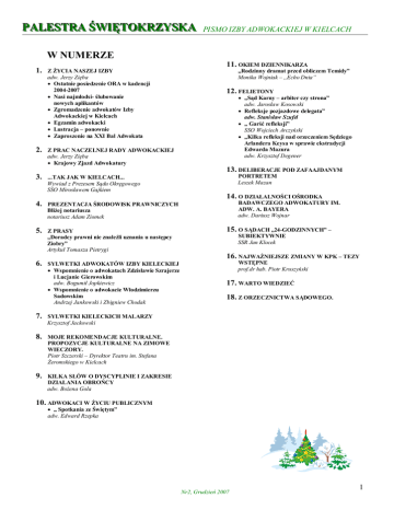 P PA AL LE ESST TR RA A ŚŚW WIIĘ ĘT TO OK KR RZ ZY YSSK KA A PISMO IZBY ADWOKACKIEJ W KIELCACH W NUMERZE 1. 11. OKIEM DZIENNIKARZA Z ŻYCIA NASZEJ IZBY adw. Jerzy Zięba Ostatnie posiedzenie ORA w kadencji 2004-2007 Nasi najmłodsi- ślubowanie nowych aplikantów Zgromadzenie adwokatów Izby Adwokackiej w Kielcach Egzamin adwokacki Lustracja – ponownie Zaproszenie na XXI Bal Adwokata 2. Z PRAC NACZELNEJ RADY ADWOKACKIEJ adw. Jerzy Zięba Krajowy Zjazd Adwokatury 3. ...TAK JAK W KIELCACH... Wywiad z Prezesem Sądu Okręgowego SSO Mirosławem Gajkiem „Rodzinny dramat przed obliczem Temidy” Monika Wojniak – „Echo Dnia” 12. FELIETONY „Sąd Karny – arbiter czy strona” adw. Jarosław Kosowski Refleksje pozjazdowe delegata” adw. Stanisław Szufel „ Garść refleksji” SSO Wojciech Arczyński „Kilka refleksji nad orzeczeniem Sędziego Arlandera Keysa w sprawie ekstradycji Edwarda Mazura adw. Krzysztof Degener 13. DELIBERACJE POD ZAFAAJDANYM PORTRETEM Leszek Mazan 14. O DZIAŁALNOŚCI OŚRODKA 4. PREZENTACJA ŚRODOWISK PRAWNICZYCH Bliżej notariusza notariusz Adam Ziomek 5. Z PRASY „Doradcy prawni nie znaleźli uznania u następcy Ziobry” Artykuł Tomasza Pietrygi 6. SYLWETKI ADWOKATÓW IZBY KIELECKIEJ Wspomnienie o adwokatach Zdzisławie Szrajerze i Lucjanie Gierowskim adw. Bogumił Jopkiewicz Wspomnienie o adwokacie Włodzimierzu Sadowskim Andrzej Jankowski i Zbigniew Chodak BADAWCZEGO ADWOKATURY IM. ADW. A. BAYERA adw. Dariusz Wojnar 15. O SĄDACH „24-GODZINNYCH” – SUBIEKTYWNIE SSR Jan Klocek 16. NAJWAŻNIEJSZE ZMIANY W KPK – TEZY 7. SYLWETKI KIELECKICH MALARZY Krzysztof Jackowski 8. MOJE REKOMENDACJE KULTURALNE. PROPOZYCJE KULTURALNE NA ZIMOWE WIECZORY. Piotr Szczerski – Dyrektor Teatru im. Stefana Żeromskiego w Kielcach 9. KILKA SŁÓW O DYSCYPLINIE I ZAKRESIE DZIAŁANIA OBROŃCY adw. Bożena Gola WSTĘPNE prof.dr hab. Piotr Kruszyński 17. WARTO WIEDZIEĆ 18. Z ORZECZNICTWA SĄDOWEGO. 10. ADWOKACI W ŻYCIU PUBLICZNYM „ Spotkania ze Świętym” adw. Edward Rzepka Nr2, Grudzień 2007 1 P PA AL LE ESST TR RA A ŚŚW WIIĘ ĘT TO OK KR RZ ZY YSSK KA A PISMO IZBY ADWOKACKIEJ W KIELCACH Z ŻYCIA NASZEJ IZBY Ostatnie w kadencji 2004-2007 posiedzenie Okręgowej Rady Adwokackiej W dniu 10 października 2007 roku w lokalu Rady odbyło się ostatnie, uroczyste posiedzenie Okręgowej Rady Adwokackiej działającej w kadencji 2004-2007. Zebranych serdecznie przywitał ustępujący Dziekan ORA adw. Stanisław Szufel, który pełnił tę funkcję przez ostatnie dwie kadencje. Czas swojej działalności na rzecz Samorządu Kieleckiego wspomina jako jeden z piękniejszych okresów swojego życia zawodowego. Pamiątkowe zdjęcie z ostatniego posiedzenia Rady w kadencji 2004-2007: Od lewej: Siedzący: adw. Monika Kot – Sekretarz ORA, adw. Stanisław Szufel – Dziekan ORA, adw. Bożena Gola – Wicedziekan ORA, adw. Tomasz Czernic – Członek ORA, Stojący: adw. Krzysztof Grabowski – Prezes Sądu Dyscyplinarnego Izby Kieleckiej, adw. Jarosław Kosowski – Skarbnik ORA, adw. Jerzy Zięba – Wicedziekan ORA, adw. Jerzy Samek – Członek ORA, adw. Krzysztof Degener – Kierownik Szkolenia Aplikantów Adwokackich i adw. Marek Porzonny – Członek ORA. Nr2, Grudzień 2007 2 P PA AL LE ESST TR RA A ŚŚW WIIĘ ĘT TO OK KR RZ ZY YSSK KA A PISMO IZBY ADWOKACKIEJ W KIELCACH Nasi najmłodsi – ślubowanie nowych aplikantów 16 października 2007 roku w siedzibie Okręgowej Rady Adwokackiej w Kielcach odbyło się uroczyste ślubowanie najmłodszej grupy aplikantów adwokackich. Zebranych gości w imieniu Prezydium Rady i całego kieleckiego samorządu adwokackiego powitał Dziekan ORA w Kielcach adw. Stanisław Szufel. Obecny był również Wicedziekan ORA adw. Jerzy Zięba oraz Kierownik Szkolenia Aplikantów Adwokackich adw. Krzysztof Degener. Aplikanci zgodnie z tradycją złożyli rotę ślubowania: „ Ślubuję uroczyście w swojej pracy aplikanta adwokackiego przyczyniać się ze wszystkich sił do ochrony praw i wolności obywatelskich oraz umacniania porządku prawnego Rzeczpospolitej Polskiej. Obowiązki swe wypełniać gorliwie, sumiennie i zgodnie z przepisami prawa zachować tajemnicę zawodową, a w postępowaniu swoim kierować się zasadami godności, uczciwości, słuszności i sprawiedliwości społecznej” Pamiątkowe zdjęcie z uroczystości ślubowania aplikantów adwokackich Od czasu ślubowania skład najmłodszej grupy aplikantów adwokackich uległ zmianie z uwagi na fakt, że trzy osoby przeniosły się do nas z innych Izb a dwie zrezygnowały z odbywania aplikacji. Do najmłodszej grupy aplikantów adwokackich obecnie należą: Natalia Augustyniak, Stanisław Białek, Milena Cedro, Iwona Gruszka, Katarzyna Kaszowicz, Jakub Kilarski, Katarzyna Kita, Anna Labarzewska, Bożena Nowak-Chrząszczyk. Katarzyna Tarnowska, Grzegorz Tworzewski, Wojciech Wojtaszek oraz Małgorzata Zaczkowska. Nr2, Grudzień 2007 3 P PA AL LE ESST TR RA A ŚŚW WIIĘ ĘT TO OK KR RZ ZY YSSK KA A PISMO IZBY ADWOKACKIEJ W KIELCACH Zgromadzenie adwokatów Izby Adwokackiej w Kielcach W dniu 20 października 2007 roku odbyło się Zgromadzenie adwokatów Izby Adwokackiej w Kielcach. Dokonano wybory władz samorządowych na kadencję 2007-2010. Na stanowisko Dziekana Okręgowej Rady Adwokackiej został wybrany adw. Jerzy Zięba. Prezesem Sądu Dyscyplinarnego został ponownie wybrany adw. Krzysztof Grabowski, natomiast Przewodniczącym Komisji Rewizyjnej został wybrany adw. Krzysztof Król. W dniu 30 października 2007 roku odbyło się pierwsze posiedzenie nowo-wybranej Rady Adwokackiej, która ukonstytuowała się w następującym składzie: DZIEKAN Wicedziekan Wicedziekan Sekretarz Skarbnik Rzecznik Dyscyplinarny Członkowie Zastępca Rzecznika Dyscyplinarnego adw. Jerzy Zięba adw. Bożena Gola adw. Monika Kot adw. Marcin Staniak adw. Mariusz Błaszkiewicz adw. Elżbieta Mazurek adw. Bogumił Rup adw. Stanisław Wójcik adw. Wiesław Musiał Zgromadzenie dokonało
