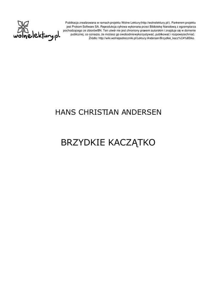 Publikacja zrealizowana w ramach projektu Wolne Lektury (http://wolnelektury.pl/). Partnerem projektu jest Prokom Software SA. Reprodukcja cyfrowa wykonana przez Bibliotekę Narodową z egzemplarza pochodzącego ze zbiorów BN. Ten utwór nie jest chroniony prawem autorskim i znajduje się w domenie publicznej, co oznacza, że możesz go swobodnie wykorzystywać, publikować i rozpowszechniać. Źródło: http://wiki.wolnepodreczniki.pl/Lektury:Andersen/Brzydkie_kacz%C4%85tko. HANS CHRISTIAN ANDERSEN BRZYDKIE KACZĄTKO Prześlicznie było na wsi. Lato gorące, pogodne, żółte zboże na polach, owies jeszcze zielony, na łąkach wielkie stogi pachnącego siana, a bociany przechadzają się powoli, na wysokich, czerwonych nogach i klekoczą po egipsku, bo takim językiem nauczyły się mówić od matek. Dokoła wielkie lasy, cieniste, szumiące, a w nich głębokie i ciche jeziora. Prześlicznie i cudownie było na wsi. Na pochyłości wzgórza jasne słońce oświetlało stary zamek z wieżycami i gankami, otoczony murem i szeroką wstęgą wolno płynącej wody. Z muru zwieszały się pnące rośliny, a wielkie liście łopianu schylały się aż do wody. I było pod nimi cicho i ciemno, jak w cienistym lesie. Pod jednym z takich liści młoda kaczka usłała sobie gniazdo i siedziała na jajach. Nudziło jej się bardzo, bo żadna z sąsiadek nie miała chęci w tak piękną pogodę rozmawiać z nią o tym, co słychać na świecie. Każda wolała pływać po przejrzystej wodzie, pluskać się i osuszać na ciepłym słoneczku, a ona tylko jedna, jak przykuta, siedzi w cieniu na gnieździe. Skończyło się wreszcie jej udręczenie, jajka zaczęły pękać i główka pisklęcia co chwila wysuwała się z innej skorupki, oznajmiając cienkim głosikiem, że żyje. — Pip, pip! — wołały wszystkie. — Kwa, kwa! — odpowiedziała im poważnie matka, a maleństwa zaczęły jej głos naśladować, opowiadając sobie, co widzą dookoła, i rozglądając się na wszystkie strony. Matka pozwalała im mówić i patrzeć, ile im się podoba, bo kolor zielony bardzo zdrowy na oczy. — Ach, jaki ten świat duży! — wołały kaczęta, dobywając się z ciasnej skorupy i prostując z przyjemnością nóżki i skrzydełka. — Nie myślcie, że to cały świat widać z tego gniazda — rzekła matka — ho, ho! ciągnie on się ogromnie daleko, jeszcze za tym ogrodem, za łąką proboszcza, het, het! Ale nigdy tam nie byłam. — Czyście już wszystkie wyszły ze skorupek? — dodała, wstając. — Jeszcze nie! Największe ani myśli pęknąć. Ciekawam bardzo, jak długo będę na nim tu pokutowała! Przyznam się, że mam tego już zupełnie dosyć. I usiadła z gniewem na upartym jajku. — A cóż tam słychać u was, kochana sąsiadko? — spytała stara kaczka, która wybrała się wreszcie w odwiedziny do młodej matki. — Z jednym jajkiem mam kłopot: ani myśli pęknąć. A tak jestem zmęczona! A inne dzieci ślicznie się wykluły, zdrowe, żwawe, żółciutkie, aż przyjemnie patrzeć. Ładniejszych kacząt w życiu nie widziałam. — Pokaż-no mi to jajko, które pęknąć nie chce — rzekła sąsiadka. — Ho, ho! takie duże! To indycze jajko. Znam się na tym, bo mi się niegdyś zdarzyło wysiedzieć takie. Nie ma z tego pociechy; wody się obawia, pływać nie umie. Namęczyłam się i namartwiłam nad nim. Wszystko na próżno: niczego nauczyć nie można. Pokaż-no jeszcze jajko. Tak, tak, to indycze. Zostaw je i zajmij się lepiej swoimi. Czas puścić dzieciaki na wodę. — Nie — odparła kaczka — posiedzę jeszcze; tak długo siedziałam, wytrwam parę dni dłużej. — Jak chcesz, moja kochana. I siedziała kaczka cierpliwie, aż pękło i wielkie jajo. — Pip, Pip! — odezwało się pisklę i prędko wydostawać się zaczęło ze skorupki. Było bardzo duże i brzydkie! Kaczka patrzyła na nie z ciekawością i uwagą. — Ogromne pisklę — rzekła wreszcie — i do żadnego z moich niepodobne. Czyżby to rzeczywiście było indycze jajko? No, o tym się przekonamy: musi iść do wody, choćbym je miała wciągnąć za łeb własnym dziobem! Nazajutrz była prześliczna pogoda. Gładka powierzchnia wody błyszczała jak lustro i prawie zapraszała do pływania. Kaczka z całą rodziną wybrała się do kąpieli i na dalszą wycieczkę. Plusk! … i skoczyła w wodę. — Kwa, kwa! — zawołała, i dzieci zaczęły skakać za nią jedno po drugim; na chwilę kryły się w wodzie z łebkami, lecz zaraz wypływały, poruszały zgrabnie i szybko nóżkami i radziły sobie tak dobrze, że przyjemnie było patrzeć. Brzydkie kaczątko pływało z innymi. — To nie indycze — rzekła do siebie kaczka — umie pływać i jak jeszcze! Może najlepiej ze wszystkich. Jak prosto się trzyma, a jak doskonale przebiera nogami. To moje własne dziecko. Nie jest ono nawet tak brzydkie, jeśli się dobrze przypatrzyć, tylko za duże trochę, — no, bardzo duże. — Kwa, kwa! — odezwała się znów głośno — za mną, dzieci! Muszę was w świat wprowadzić, przedstawić na dworze kaczym; tylko trzymajcie się koło mnie blisko, żeby was kto nie zdeptał; a najbardziej strzeżcie się kota. Przepłynąwszy kawałek drogi, kaczki wyszły znów na ląd i dostały się na kacze podwórze. Hałas tu był niesłychany, gdyż dwie rodziny kłóciły się zapamiętale o główkę węgorza, którą tymczasem w zamieszaniu kot rozbójnik pochwycił. — Tak to bywa na świecie — rzekła kaczka i obtarła dziób o piasek, gdyż sama miała apetyt na główkę. — A teraz naprzód! Równo poruszać nogami, a tej pięknej kaczce ukłońcie się grzecznie, tak, głową; to bardzo znakomita osoba; jest Hiszpanką i dlatego taka tłusta. Widzicie na jej nodze ten czerwony znaczek? To największe odznaczenie, jakie kaczkę od ludzi spotkać może: oznacza ono, że nie wolno jej wyrządzić żadnej krzywdy, więc też wszyscy ją szanują. No, dalej, dalej, nogi rozstawia
