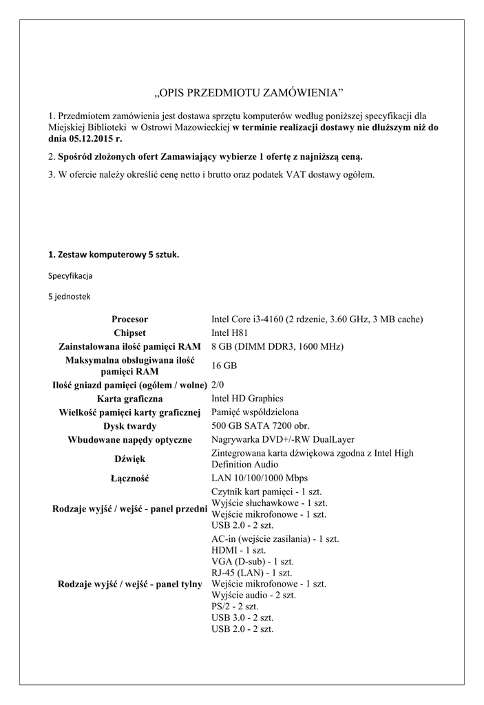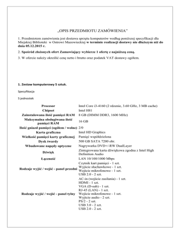 „OPIS PRZEDMIOTU ZAMÓWIENIA” 1. Przedmiotem zamówienia jest dostawa sprzętu komputerów według poniższej specyfikacji dla Miejskiej Biblioteki w Ostrowi Mazowieckiej w terminie realizacji dostawy nie dłuższym niż do dnia 05.12.2015 r. 2. Spośród złożonych ofert Zamawiający wybierze 1 ofertę z najniższą ceną. 3. W ofercie należy określić cenę netto i brutto oraz podatek VAT dostawy ogółem. 1. Zestaw komputerowy 5 sztuk. Specyfikacja 5 jednostek Procesor Chipset Zainstalowana ilość pamięci RAM Maksymalna obsługiwana ilość pamięci RAM Ilość gniazd pamięci (ogółem / wolne) Karta graficzna Wielkość pamięci karty graficznej Dysk twardy Wbudowane napędy optyczne Intel Core i3-4160 (2 rdzenie, 3.60 GHz, 3 MB cache) Intel H81 8 GB (DIMM DDR3, 1600 MHz) 16 GB 2/0 Intel HD Graphics Pamięć współdzielona 500 GB SATA 7200 obr. Nagrywarka DVD+/-RW DualLayer Zintegrowana karta dźwiękowa zgodna z Intel High Dźwięk Definition Audio LAN 10/100/1000 Mbps Łączność Czytnik kart pamięci - 1 szt. Wyjście słuchawkowe - 1 szt. Rodzaje wyjść / wejść - panel przedni Wejście mikrofonowe - 1 szt. USB 2.0 - 2 szt. AC-in (wejście zasilania) - 1 szt. HDMI - 1 szt. VGA (D-sub) - 1 szt. RJ-45 (LAN) - 1 szt. Rodzaje wyjść / wejść - panel tylny Wejście mikrofonowe - 1 szt. Wyjście audio - 2 szt. PS/2 - 2 szt. USB 3.0 - 2 szt. USB 2.0 - 2 szt. Porty wewnętrzne (wolne) Zasilacz Zainstalowany system operacyjny Dołączone oprogramowanie Wysokość Szerokość Głębokość Waga Dodatkowe informacje Dołączone akcesoria Gwarancja PCI-e x16 - 1 szt. Kieszeń wewnętrzna 2,5" - 1 szt. SATA III - 2 szt. PCI - 1 szt. PCI-e x1 - 2 szt. 250 W Microsoft Windows 7 Professional PL + Windows 8 PRO PL (DVD/licencja) Płyta Recovery (możliwość odzyskania systemu operacyjnego) Partycja recovery (opcja przywrócenia systemu z HDD) 360 mm 102 mm 433 mm 7 kg Możliwość zabezpieczenia linką (port Kensington Lock) Kabel zasilający, klawiatura, mysz 3 lata Monitory – 5 sztuk LED, PLS Typ matrycy 21,5" Przekątna ekranu 16:9 Format ekranu 1920 x 1080 Nominalna rozdzielczość Częstotliwość (pionowa/pozioma) 60 Hz / 60 Hz 0.248 mm Wielkość plamki 250 cd/m2 Jasność 1 000:1 Kontrast dynamiczny 178 stopni Kąt widzenia w poziome 178 stopni Kąt widzenia w pionie 4 ms Czas reakcji Liczba wyświetlanych kolorów 16,7 mln VGA (D-sub) - 1 szt. HDMI - 1 szt. Rodzaje wyjść / wejść Wyjście słuchawkowe - 1 szt. Brak Tuner TV 22 W Pobór mocy podczas pracy Pobór mocy podczas spoczynku < 0,3 W 518 mm Szerokość 391 mm Wysokość (z podstawą) 165 mm Głębokość (z podstawą) Waga Dodatkowe informacje Dołączone akcesoria Gwarancja 3,1 kg Regulacja pochylenia Kabel VGA Kabel zasilający 2 lata Oprogramowanie- 5 sztuk Microsoft Office 2013 Home and Business 32-bit 64-bit PL 2. Laptop Laptop LENOVO E50-80 80J200K6PB i7-5500U/15,6FHD/4GB/1TB/HD4400/FP/Win7Professional & W8.1 PRO Producent Kod producenta LENOVO 80J200K6PB Biznes Klasa Na co dzień Przekątna ekranu 15,6 Matowa Typ matrycy Podświetlenie LED Rozdzielczość 1920 x 1080 (Full HD) Model procesora Intel® Core™ i7-5500U (4M Cache, 2.40 / 3.00 GHz) Intel w urządzeniu Laptop klasyczny Liczba rdzeni procesora 2-rdzeniowy, 4-wątkowy Ilość pamięci RAM 4 GB Technologia pamięci RAM DDR3 SO-DIMM Maksymalna ilość pamięci RAM 16 GB Pojemność dysku HDD 1 TB Technologia dysku HDD - magnetyczny Dysk - prędkość obrotowa 5400 obr/min Model karty graficznej Intel® HD Graphics 5500 Pamięć karty graficznej Współdzielona Napęd optyczny Nagrywarka DVD Komunikacja Bluetooth Bluetooth - wersja Interfejsy Wyjścia/wejścia obrazu Wyjścia/wejścia dźwięku Porty USB Złącze karty pamięci Wyposażenie/funkcje Kamera internetowa Pojemność baterii Czas pracy na baterii Dodatkowe informacje System operacyjny Kolor Waga Wymiary Materiał wykonania Kolor główny Gwarancja LAN (RJ-45) WiFi 4.0 Ethernet (LAN) SATA USB USB 3.0 D-Sub / VGA HDMI Line In Line Out USB 3x, USB 3.0 2x MicroSD Czytnik kart pamięci Czytnik linii papilarnych Kamera internetowa Kensington Lock Wbudowane głośniki stereo Wbudowany mikrofon Wbudowana 32 Wh 6h Licencja dodatkowa na Windows 8.1 Pro Windows 7 Professional Windows 8.x Professional Czarny 2,36 kg (z baterią) 30 mm x 384 mm x 265 mm Tworzywo sztuczne Czarny 24 miesięcy Oprogramowanie- 1 sztuk Microsoft Office 2013 Home and Business 32-bit 64-bit PL Oprogramowanie: 1 sztuka CorelDRAW Graphics Suite X5 Special Edition PL BOX