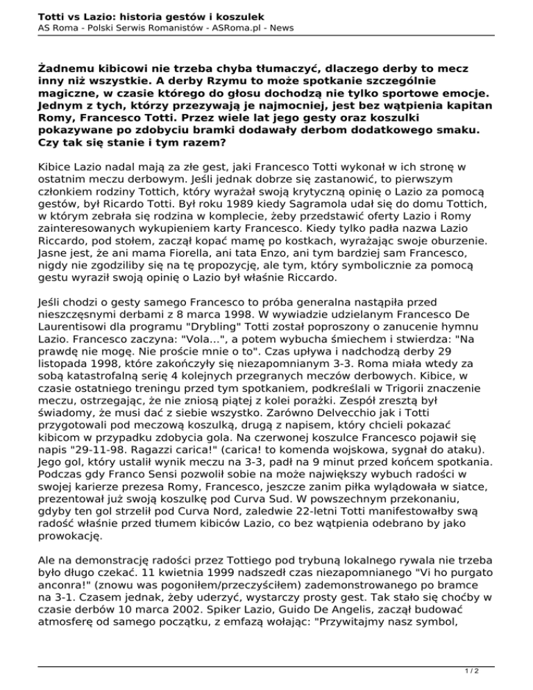 Totti vs Lazio: historia gestów i koszulek AS Roma - Polski Serwis Romanistów - ASRoma.pl - News Żadnemu kibicowi nie trzeba chyba tłumaczyć, dlaczego derby to mecz inny niż wszystkie. A derby Rzymu to może spotkanie szczególnie magiczne, w czasie którego do głosu dochodzą nie tylko sportowe emocje. Jednym z tych, którzy przezywają je najmocniej, jest bez wątpienia kapitan Romy, Francesco Totti. Przez wiele lat jego gesty oraz koszulki pokazywane po zdobyciu bramki dodawały derbom dodatkowego smaku. Czy tak się stanie i tym razem? Kibice Lazio nadal mają za złe gest, jaki Francesco Totti wykonał w ich stronę w ostatnim meczu derbowym. Jeśli jednak dobrze się zastanowić, to pierwszym członkiem rodziny Tottich, który wyrażał swoją krytyczną opinię o Lazio za pomocą gestów, był Ricardo Totti. Był roku 1989 kiedy Sagramola udał się do domu Tottich, w którym zebrała się rodzina w komplecie, żeby przedstawić oferty Lazio i Romy zainteresowanych wykupieniem karty Francesco. Kiedy tylko padła nazwa Lazio Riccardo, pod stołem, zaczął kopać mamę po kostkach, wyrażając swoje oburzenie. Jasne jest, że ani mama Fiorella, ani tata Enzo, ani tym bardziej sam Francesco, nigdy nie zgodziliby się na tę propozycję, ale tym, który symbolicznie za pomocą gestu wyraził swoją opinię o Lazio był właśnie Riccardo. Jeśli chodzi o gesty samego Francesco to próba generalna nastąpiła przed nieszczęsnymi derbami z 8 marca 1998. W wywiadzie udzielanym Francesco De Laurentisowi dla programu "Drybling" Totti został poproszony o zanucenie hymnu Lazio. Francesco zaczyna: "Vola...", a potem wybucha śmiechem i stwierdza: "Na prawdę nie mogę. Nie proście mnie o to". Czas upływa i nadchodzą derby 29 listopada 1998, które zakończyły się niezapomnianym 3-3. Roma miała wtedy za sobą katastrofalną serię 4 kolejnych przegranych meczów derbowych. Kibice, w czasie ostatniego treningu przed tym spotkaniem, podkreślali w Trigorii znaczenie meczu, ostrzegając, że nie zniosą piątej z kolei porażki. Zespół zresztą był świadomy, że musi dać z siebie wszystko. Zarówno Delvecchio jak i Totti przygotowali pod meczową koszulką, drugą z napisem, który chcieli pokazać kibicom w przypadku zdobycia gola. Na czerwonej koszulce Francesco pojawił się napis "29-11-98. Ragazzi carica!" (carica! to komenda wojskowa, sygnał do ataku). Jego gol, który ustalił wynik meczu na 3-3, padł na 9 minut przed końcem spotkania. Podczas gdy Franco Sensi pozwolił sobie na może największy wybuch radości w swojej karierze prezesa Romy, Francesco, jeszcze zanim piłka wylądowała w siatce, prezentował już swoją koszulkę pod Curva Sud. W powszechnym przekonaniu, gdyby ten gol strzelił pod Curva Nord, zaledwie 22-letni Totti manifestowałby swą radość właśnie przed tłumem kibiców Lazio, co bez wątpienia odebrano by jako prowokację. Ale na demonstrację radości przez Tottiego pod trybuną lokalnego rywala nie trzeba było długo czekać. 11 kwietnia 1999 nadszedł czas niezapomnianego "Vi ho purgato anconra!" (znowu was pogoniłem/przeczyściłem) zademonstrowanego po bramce na 3-1. Czasem jednak, żeby uderzyć, wystarczy prosty gest. Tak stało się choćby w czasie derbów 10 marca 2002. Spiker Lazio, Guido De Angelis, zaczął budować atmosferę od samego początku, z emfazą wołając: "Przywitajmy nasz symbol, 1/2 Totti vs Lazio: historia gestów i koszulek AS Roma - Polski Serwis Romanistów - ASRoma.pl - News symbol imperium rzymskiego, dumę kibiców Lazio, oddajmy hołd Historii i wspierajmy Lazio, drużynę, która sprowadziła piłkę do Rzymu. A teraz na boisko wchodzi w biało-błękitnej koszulce pierwszej drużyny ze stolicy, Angelo Peruzzi..." Tak rozpoczęło się magiczne spotkanie zakończone wynikiem 5-1, w czasie którego Totti popisał się koszulką "6 unica" (jesteś jedyna, wyjątkowa). Totti dla Lazio staje się powoli obsesją. 30 października 2007 nie ma go nawet na boisku, ale po wygranej 3-2 deklaruje: "Scudetto zdobywa się pokonując małe drużyny, więc...". Po tych słowach wybucha wśród laziali wielkie oburzenie. Zresztą Lazio protestowało też przeciw temu, że Tottiemu pozwolono pojawić się na boisku w derbach 26 lutego 2006. Twierdzili, że dekoncentrował on ich graczy. W najbliższą niedzielę kolejne rzymskie derby. Kibicom wystarczy po prostu, żeby Totti pokazał zespołowi Lazio swoją koszulkę z numerem 10. Na nich już ten znak robi wrażenie. Jak Z wycinane przez Zorro. Autor: kaisa 2/2 Powered by TCPDF (www.tcpdf.org)