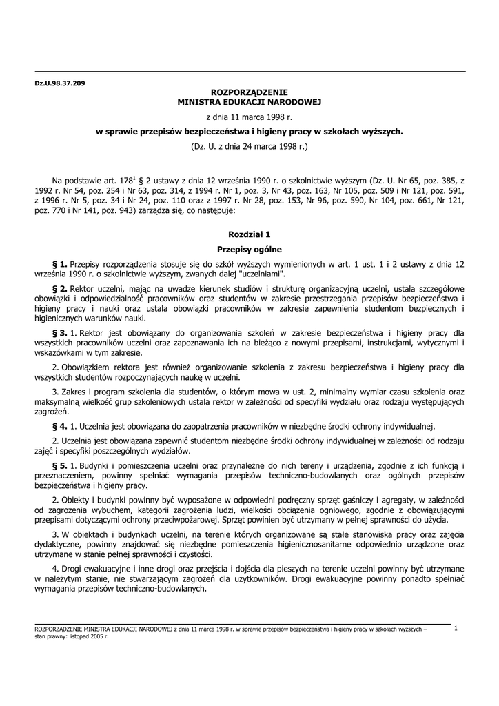 Dz.U.98.37.209 ROZPORZĄDZENIE MINISTRA EDUKACJI NARODOWEJ z dnia 11 marca 1998 r. w sprawie przepisów bezpieczeństwa i higieny pracy w szkołach wyższych. (Dz. U. z dnia 24 marca 1998 r.) Na podstawie art. 1781 § 2 ustawy z dnia 12 września 1990 r. o szkolnictwie wyższym (Dz. U. Nr 65, poz. 385, z 1992 r. Nr 54, poz. 254 i Nr 63, poz. 314, z 1994 r. Nr 1, poz. 3, Nr 43, poz. 163, Nr 105, poz. 509 i Nr 121, poz. 591, z 1996 r. Nr 5, poz. 34 i Nr 24, poz. 110 oraz z 1997 r. Nr 28, poz. 153, Nr 96, poz. 590, Nr 104, poz. 661, Nr 121, poz. 770 i Nr 141, poz. 943) zarządza się, co następuje: Rozdział 1 Przepisy ogólne § 1. Przepisy rozporządzenia stosuje się do szkół wyższych wymienionych w art. 1 ust. 1 i 2 ustawy z dnia 12 września 1990 r. o szkolnictwie wyższym, zwanych dalej "uczelniami". § 2. Rektor uczelni, mając na uwadze kierunek studiów i strukturę organizacyjną uczelni, ustala szczegółowe obowiązki i odpowiedzialność pracowników oraz studentów w zakresie przestrzegania przepisów bezpieczeństwa i higieny pracy i nauki oraz ustala obowiązki pracowników w zakresie zapewnienia studentom bezpiecznych i higienicznych warunków nauki. § 3. 1. Rektor jest obowiązany do organizowania szkoleń w zakresie bezpieczeństwa i higieny pracy dla wszystkich pracowników uczelni oraz zapoznawania ich na bieżąco z nowymi przepisami, instrukcjami, wytycznymi i wskazówkami w tym zakresie. 2. Obowiązkiem rektora jest również organizowanie szkolenia z zakresu bezpieczeństwa i higieny pracy dla wszystkich studentów rozpoczynających naukę w uczelni. 3. Zakres i program szkolenia dla studentów, o którym mowa w ust. 2, minimalny wymiar czasu szkolenia oraz maksymalną wielkość grup szkoleniowych ustala rektor w zależności od specyfiki wydziału oraz rodzaju występujących zagrożeń. § 4. 1. Uczelnia jest obowiązana do zaopatrzenia pracowników w niezbędne środki ochrony indywidualnej. 2. Uczelnia jest obowiązana zapewnić studentom niezbędne środki ochrony indywidualnej w zależności od rodzaju zajęć i specyfiki poszczególnych wydziałów. § 5. 1. Budynki i pomieszczenia uczelni oraz przynależne do nich tereny i urządzenia, zgodnie z ich funkcją i przeznaczeniem, powinny spełniać wymagania przepisów techniczno-budowlanych oraz ogólnych przepisów bezpieczeństwa i higieny pracy. 2. Obiekty i budynki powinny być wyposażone w odpowiedni podręczny sprzęt gaśniczy i agregaty, w zależności od zagrożenia wybuchem, kategorii zagrożenia ludzi, wielkości obciążenia ogniowego, zgodnie z obowiązującymi przepisami dotyczącymi ochrony przeciwpożarowej. Sprzęt powinien być utrzymany w pełnej sprawności do użycia. 3. W obiektach i budynkach uczelni, na terenie których organizowane są stałe stanowiska pracy oraz zajęcia dydaktyczne, powinny znajdować się niezbędne pomieszczenia higienicznosanitarne odpowiednio urządzone oraz utrzymane w stanie pełnej sprawności i czystości. 4. Drogi ewakuacyjne i inne drogi oraz przejścia i dojścia dla pieszych na terenie uczelni powinny być utrzymane w należytym stanie, nie stwarzającym zagrożeń dla użytkowników. Drogi ewakuacyjne powinny ponadto spełniać wymagania przepisów techniczno-budowlanych. ROZPORZĄDZENIE MINISTRA EDUKACJI NARODOWEJ z dnia 11 marca 1998 r. w sprawie przepisów bezpieczeństwa i higieny pracy w szkołach wyższych – stan prawny: listopad 2005 r. 1 5. W pomieszczeniach uczelni powinny być spełnione warunki dotyczące oświetlenia, wentylacji, ogrzewania i powierzchni użytkowej zgodnie z przepisami odrębnymi, a także z uwzględnieniem potrzeb użytkowych i funkcji poszczególnych pomieszczeń. 6. Stan wyposażenia pomieszczeń uczelni (mebli, sprzętu, urządzeń i instalacji) nie może stanowić zagrożeń dla osób korzystających z tych pomieszczeń. 7. W budynkach i pomieszczeniach uczelni, w których wykonywane są badania pilotażowe, eksperymenty chemiczne, fizyczne lub inne mogące stanowić zagrożenie dla życia i zdrowia przebywających w nich ludzi, obowiązuje zachowanie szczególnych środków ostrożności. W uczelniach, które prowadzą badania eksperymentalne, szczegółowe instrukcje prowadzenia tych badań powinny zawierać postanowienia dotyczące zapobiegania zagrożeniu dla zdrowia i życia ludzkiego. Instrukcje te opracowuje kierownik jednostki organizacyjnej prowadzącej badania w porozumieniu z pracownikiem służby bezpieczeństwa i higieny pracy. § 6. Uczelnia jest obowiązana do utrzymywania w stanie zapewniającym bezpieczne i higieniczne użytkowanie posiadanych przez siebie obiektów, urządzeń i terenów sportowych, a także do zapewnienia nadzoru osób do tego upoważnionych w czasie realizacji zajęć z wychowania fizycznego oraz wszelkiego rodzaju zawodów sportowych organizowanych przez uczelnię, na zasadach określonych w przepisach odrębnych. § 7. Miejsca pracy oraz pomieszczenia, do których wzbroniony jest dostęp osobom nie zatrudnionym lub studentom, powinny być odpowiednio oznakowane i zabezpieczone przed swobodnym dostępem osób nieuprawnionych. § 8. 1. Rektor może czasowo zawiesić zajęcia w uczelni, jeżeli w salach temperatura wynosi poniżej 15°C. 2. Rektor może również czasowo zawiesić zajęcia w uczelni albo zarządzić czasowe zamknięcie uczelni lub jej jednostki organizacyjnej w przypadku wystąpienia na danym terenie klęski żywiołowej, epidemii bądź innych zdarzeń zagrażających życiu lub zdrowiu pracowników i studentów. § 9. 1. Jeżeli miejsce, w którym mają być prowadzone zajęcia, lub stan znajdujących się w nim urządzeń może stwarzać zagrożenie dla bezpieczeństwa studentów, prowadzący zajęcia jest obowiązany nie dopuścić do zajęć lub przerwać je, powiadamiając o tym niezwłocznie bezpośredniego przełożonego, podając motywy swojej decyzji. 2. Prowadzący zajęcia w warsztatach, pracowniach specjalistycznych, laboratoriach oraz zajęcia wy