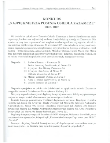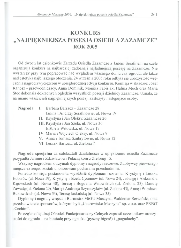 Almanach M uszyny 2006. ״Najpiękniejsza posesja osiedla Zazam cze” 261 KONKURS ״NAJPIĘKNIEJSZA POSESJA OSIEDLA ZAZAMCZE” ROK 2005 Od dwóch lat członkowie Zarządu Osiedla Zazamcze z Janem Serafinem na czele organizują konkurs na najbardziej zadbaną i najładniejszą posesję na Zazamczu. Nie wystarczy przy tym popracować nad wyglądem własnego domu czy ogrodu, ale także nad estetyką najbliższego otoczenia. 24 września 2005 roku odbyła się uroczystość wręczenia nagród zwycięzcom w ubiegłorocznej edycji konkursu. Komisja w składzie: Józef Ranosz - przewodniczący, Anna Dominik, Monika Fabisiak, Halina Moch oraz Maria Stec dokonała dokładnych oględzin wszystkich posesji dzielnicy Zazamcze. Uznała, że na miano właścicieli najpiękniejszych posesji zasłużyły następujące osoby: Nagroda I . Barbara Barszcz - Zazamcze 28 Janina i Andrzej Serafinowie, ul. Nowa 19 II. Krystyna i Jan Oleksy, Zazamcze 26 III. Krystyna i Jan Szela, ul. Nowa 36 Elżbieta Witowska, ul. Nowa 17 IV. Maria i Wojciech Oleksy, ul. Nowa 9 V. Anna i Tomasz Szubrytowie, ul. Nowa 12 VI. Leszek Barszcz, ul. Zielona 7 Nagroda specjalna za całokształt działalności w upiększaniu osiedla Zazamcze przypadła Janinie i Zdzisławowi Pelaczykom z Zielonej 15. Wszyscy nagrodzeni otrzymali dyplomy i nagrody rzeczowe. Zdobywcy pierwszego miejsca ex aequo zostali uhonorowani pucharami przechodnimi. Ponadto komisja postanowiła wyróżnić dyplomami uznania: Krystynę i Leszka Hoborów (ul. Nowa 59), Krystynę i Józefa Cyconiów (ul. Nowa 24), Jadwigę i Aleksandra Kijowskich (ul. Nowa 40), Teresę i Bogdana W itowskich (ul. Zielona 23), Danutę Zawadę (ul. Zielona 29), Marię i Andrzeja Szymczyków (ul. Zielona 43), Annę i Wiesława Bukowskich (ul. Nowa 53), Teresę Jaskulską (ul. Nowa 35). Dyplomy i nagrody wręczali Burmistrz MiGU Muszyna, Waldemar Serwiński, oraz przedstawiciele sponsorów, którymi byli ״Uzdrowisko Muszyna” sp. z 0 .0 . oraz PRBiT ״Cechini”. Po części oficjalnej Ośrodek Funkcjonariuszy Celnych zaprosił uczestników uroczystości do ogrodu - na biesiadę przy ognisku (pyszny bigos!) i ״pogaduchy”. 262 Konkurs