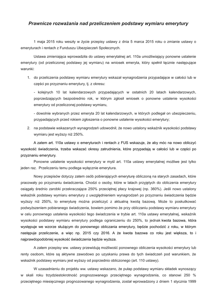 Prawnicze rozważania nad przeliczeniem podstawy wymiaru emerytury 1 maja 2015 roku weszły w życie przepisy ustawy z dnia 5 marca 2015 roku o zmianie ustawy o emeryturach i rentach z Funduszu Ubezpieczeń Społecznych. Ustawa zmieniająca wprowadziła do ustawy emerytalnej art. 110a umożliwiający ponowne ustalenie emerytury (od przeliczonej podstawy jej wymiaru) na wniosek emeryta, który spełnił łącznie następujące warunki: 1. do przeliczenia podstawy wymiaru emerytury wskazał wynagrodzenia przypadające w całości lub w części po przyznaniu emerytury, tj. z okresu: - kolejnych 10 lat kalendarzowych przypadających w ostatnich 20 latach kalendarzowych, poprzedzających bezpośrednio rok, w którym zgłosił wniosek o ponowne ustalenie wysokości emerytury od przeliczonej podstawy wymiaru, - dowolnie wybranych przez emeryta 20 lat kalendarzowych, w których podlegał on ubezpieczeniu, przypadających przed rokiem zgłoszenia o ponowne ustalenie wysokości emerytury; 2. na podstawie wskazanych wynagrodzeń udowodnił, że nowo ustalony wskaźnik wysokości podstawy wymiaru jest wyższy niż 250%. A zatem art. 110a ustawy o emeryturach i rentach z FUS wskazuje, że aby móc na nowo obliczyć wysokość świadczenia, trzeba wskazać okresy zatrudnienia, które przypadają w całości lub w części po przyznaniu emerytury. Ponowne ustalenie wysokości emerytury w myśl art. 110a ustawy emerytalnej możliwe jest tylko jeden raz. Przeliczeniu temu podlega wyłącznie emerytura. Nowy przepisów dotyczy zatem osób pobierających emeryturę obliczoną na starych zasadach, które pracowały po przyznaniu świadczenia. Chodzi o osoby, które w latach przyjętych do obliczenia emerytury osiągały średnio zarobki przekraczające 250% przeciętnej płacy krajowej (np. 360%). Jeśli nowo ustalony wskaźnik podstawy wymiaru emerytury z uwzględnieniem wynagrodzeń po przyznaniu świadczenia będzie wyższy niż 250%, to emeryturę można przeliczyć z aktualną kwotą bazową. Może to poskutkować podwyższeniem pobieranego świadczenia, bowiem pomimo że przy obliczaniu podstawy wymiaru emerytury w celu ponownego ustalenia wysokości tego świadczenia w trybie art. 110a ustawy emerytalnej, wskaźnik wysokości podstawy wymiaru emerytury podlega ograniczeniu do 250%, to jednak kwota bazowa, która występuje we wzorze służącym do ponownego obliczania emerytury, będzie pochodzić z roku, w którym następuje przeliczenie, a więc np. 2015 czy 2016. A że kwota bazowa co roku jest większa, to i najprawdopodobniej wysokość świadczenia będzie wyższa. A zatem przepisy ww. ustawy przewidują możliwość ponownego obliczenia wysokości emerytury lub renty osobom, które są aktywne zawodowo po uzyskaniu prawa do tych świadczeń pod warunkiem, że wskaźnik podstawy wymiaru jest wyższy od poprzednio obliczonego (art. 110 ustawy). W uzasadnieniu do projektu ww. ustawy wskazano, że pułap podstawy wymiaru składek wynoszący w skali roku trzydziestokrotność prognozowanego przeciętnego wynagrodzenia, co stanowi 250 % przeciętnego miesięcznego prognozowanego wynagrodzenia, został wprowadzony z dniem 1 stycznia 1999 r. Przed tą datą zarobki, od których pobierana była składka na ubezpieczenia społeczne nie były ograniczane. Osoby, których zarobki przed 1999 r. kształtowały się nawet na poziomie 400% czy 500% przeciętnego wynagrodzenia opłacały przed 1 stycznia 1999 r. składki od pełnego osiąganego wynagrodzenia, czyli składki pobierane od tych osób były wielokrotnie wyższe od przeciętnych składek. Jednak do obliczenia emerytury jest stosowane – także w przypadku tych osób – generalne ograniczenie, zgodnie z którym podstawa wymiaru emerytury nie może być wyższa niż 250% przeciętnego wynagrodzenia. A zatem ww. ustawa daje możliwość jednorazowe przeliczenie emerytury osobom, które osiągały stosunkowo wysokie zarobki (wskaźnik podstawy wymiaru na poziomie ponad 250%) i odprowadzały przed 1 stycznia 1999 r. wysokie składki emerytalne. Zebrał i skonsultował Andy Herzog