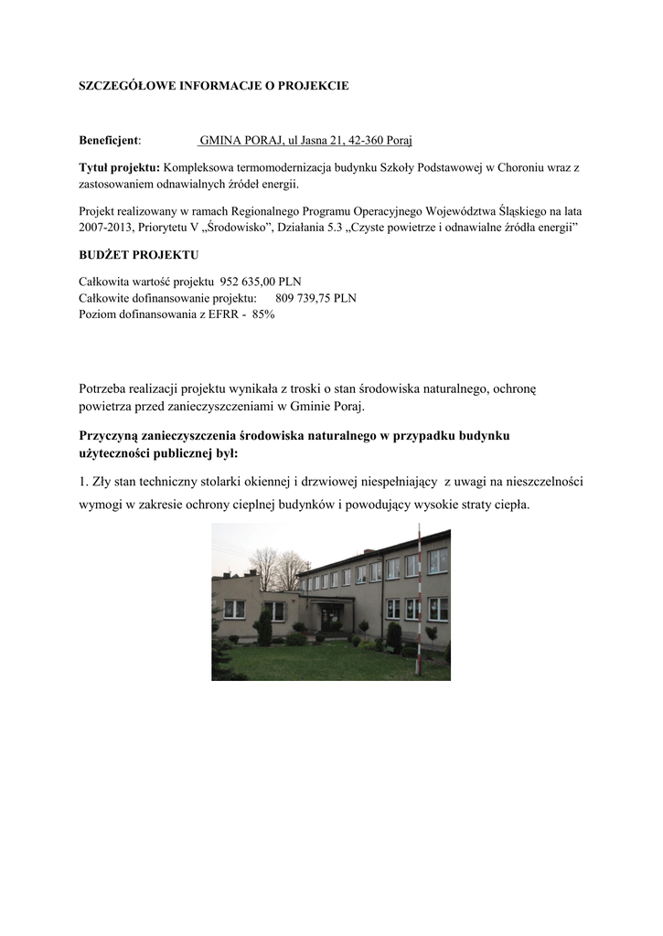SZCZEGÓŁOWE INFORMACJE O PROJEKCIE Beneficjent: GMINA PORAJ, ul Jasna 21, 42-360 Poraj Tytuł projektu: Kompleksowa termomodernizacja budynku Szkoły Podstawowej w Choroniu wraz z zastosowaniem odnawialnych źródeł energii. Projekt realizowany w ramach Regionalnego Programu Operacyjnego Województwa Śląskiego na lata 2007-2013, Priorytetu V „Środowisko”, Działania 5.3 „Czyste powietrze i odnawialne źródła energii” BUDŻET PROJEKTU Całkowita wartość projektu 952 635,00 PLN Całkowite dofinansowanie projektu: 809 739,75 PLN Poziom dofinansowania z EFRR - 85% Potrzeba realizacji projektu wynikała z troski o stan środowiska naturalnego, ochronę powietrza przed zanieczyszczeniami w Gminie Poraj. Przyczyną zanieczyszczenia środowiska naturalnego w przypadku budynku użyteczności publicznej był: 1. Zły stan techniczny stolarki okiennej i drzwiowej niespełniający z uwagi na nieszczelności wymogi w zakresie ochrony cieplnej budynków i powodujący wysokie straty ciepła. 2. Nieszczelny stropodach, posiadający niedostateczne współczynniki przenikania ciepła. 3. Zły stan techniczny instalacji c.o. ( na grzejnikach z rur stalowych ożebrowanych zaobserwowano widoczne wżery korozyjne, zawory grzejnikowe w złym stanie technicznym) uniemożliwiający regulację temperatury w pomieszczeniach. 4. Brak izolacji termicznej na głównych przewodach rozdzielczych. 5. Brak zaworów grzejnikowych termostatycznych uniemożliwiający regulację żądanej temperatury w pomieszczeniach. 6. Brak możliwości regulacji hydraulicznej instalacji co powoduje nie tylko niedogrzanie ale i w niektórych przypadkach przegrzanie pomieszczeń, które doprowadza do złego samopoczucia uczniów oraz trudności w skupieniu się w trakcie nauki (wietrzenie sal możliwe jest tylko i wyłącznie w trakcie przerw międzylekcyjnych). 7. Widoczne tzw. wykwity świadczące o przemarzaniu ścian w okresach zimowych. 8. Zakamienienie całości instalacji co bezpośrednio przekłada się na trudność w uzyskaniu odpowiednich wymaganych przepisami temperatur. 9. Zły stan techniczny istniejących kotłów węglowo- miałowych – kotły wyeksploatowane i skorodowane, grożące awarią. Skutkami takiego przedstawionego stanu budynku Szkoły Podstawowej w Choroniu była: 1. Degradacja środowiskowo-gospodarcza Gminy Poraj na tle innych powiatów województwa śląskiego. 2. Wysoki poziom zanieczyszczeń emitowanych do atmosfery na terenie miejscowości Choroń. 3. Nieodpowiednia pod względem cieplnym infrastruktura Szkoły Podstawowej im. Marii Konopnickiej w Choroniu. 4. Wysokie koszty eksploatacji obiektu w okresie zimowym. 5. Zachorowalność mieszkańców Gminy Poraj na choroby układu krążenia, oddechowego i nowotwory. Przedmiotem projektu była kompleksowa modernizacja budynku Szkoły Podstawowej w Choroniu wraz z zastosowaniem odnawialnych źródeł energii która obejmowała: 1. Wymianę stolarki okienno-drzwiowej, 2. Docieplenie ścian zewnętrznych budynku oraz stropodachu- termomodernizacji poddano 2948 m³ łącznej kubatury budynku 3. Wykonano i zamontowano instalację c.o. wraz z demontażem starej instalacji. 4. Zmodernizowano źródła ciepła w tym: zdemontowano kotłownie węglową, zamontowano 5 sztuk kolektorów słonecznych, zamontowano pompę ciepła wraz zdolnym źródłem ciepła na potrzeby c. o. i kotłownią gazową. W wyniku realizacji projektu korzyści odnieśli uczniowie i pracownicy Szkoły Podstawowej im. Marii Konopnickiej w Choroniu, mieszkańcy Choronia oraz Gmina Poraj. Korzyści dla uczniów i pracowników Szkoły Podstawowej im. Marii Konopnickiej w Choroniu 1. Możliwość nauki i pracy w odpowiednio dogrzanych, szczelnych pomieszczeniach, o odpowiedniej wilgotności oraz właściwej krotności wymiany powietrza. 2. Wzrost poczucia bezpieczeństwa zdrowotno-sanitarnego w zakresie zapewnienia optymalnych warunków temperaturowych w celu optymalizacji procesu nauczania poprawy jakości powietrza w okolicy Szkoły itp. Korzyści dla mieszkańców Choronia 1. Poprawa jakości nauczania na terenie miejscowości. 2. Poprawa jakości powietrza. 3. Zmodernizowany budynek Szkoły, poprawiający estetykę architektoniczną w okolicy. 4. Wzrost poczucia bezpieczeństwa zdrowotnego uczniów, ich rodzin oraz pracowników w zakresie jakości powietrza i warunków zdrowotno-sanitarnych w Szkole Podstawowej im. Marii Konopnickiej w Choroniu. 5. Dostęp do odpowiednio utrzymanych obiektów użyteczności publicznej w regionie. Korzyści dla Gminy Poraj 1. Poprawa bazy edukacyjnej w gminie poprzez podniesienie jakości budynku Szkoły. 2. Poprawa wizerunku Gminy Poraj, jako regionu, na terenie którego funkcjonuje zmodernizowany obiekt. 3. Poprawa wizerunku Gminy Poraj, jako regionu, na terenie którego sprawnie funkcjonuje program ograniczania emisji zanieczyszczeń do atmosfery, w szczególności w formie tzw. niskiej emisji. 4. Poprawa wizerunku Gminy Poraj, jako regionu, na terenie którego wykorzystywane są odnawialne źródła energii w obiektach użyteczności publicznej. 5. Podniesienie atrakcyjności inwestycyjnej, gospodarczej i turystycznej regionu w oczach inwestorów. 6. Inicjowanie rozwoju Gminy Poraj w zakresie popularyzowana działań proekologicznych. 7. Podniesienie poziomu absorpcji funduszy UE przez jednostki ulokowane na terenie Powiatu Myszkowskiego. 8. Utrzymanie budynku Szkoły w odpowiednim stanie technicznym a także wizualnym.