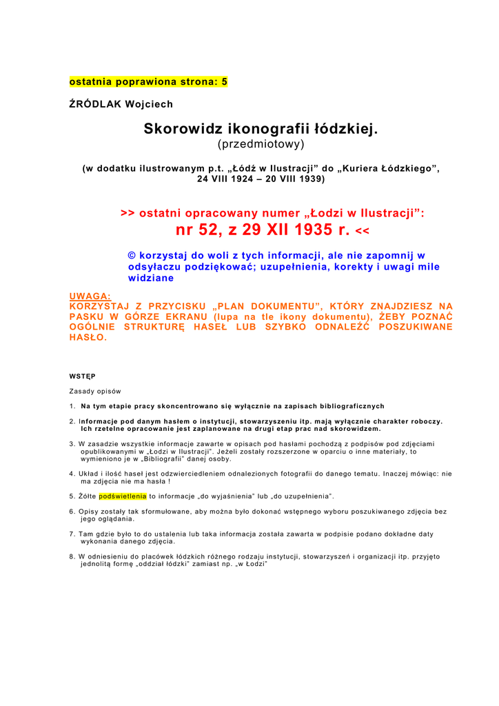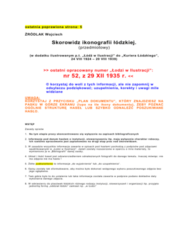 ostatnia poprawiona strona: 5 ŹRÓDLAK Wojciech Skorowidz ikonografii łódzkiej. (przedmiotowy) (w dodatku ilustrowanym p.t. „Łódź w Ilustracji” do „Kuriera Łódzkiego”, 24 VIII 1924 – 20 VIII 1939) >> ostatni opracowany numer „Łodzi w Ilustracji”: nr 52, z 29 XII 1935 r. << © korzystaj do woli z tych informacji, ale nie zapomnij w odsyłaczu podziękować; uzupełnienia, korekty i uwagi mile widziane UWAGA: KORZYSTAJ Z PRZYCISKU „PLAN DOKUMENTU”, KTÓRY ZNAJDZIESZ NA PASKU W GÓRZE EKRANU (lupa na tle ikony dokumentu), ŻEBY POZNAĆ OGÓLNIE STRUKTURĘ HASEŁ LUB SZYBKO ODNALEŹĆ POSZUKIWANE HASŁO. WS T ĘP Z as ad y op is ów 1 . N a t ym et ap ie pr a c y s k o nce nt ro wa no s ię w ył ą cz n ie na z ap is a ch b ib liog r af icz n ych 2 . In fo rma c je p od dan ym ha s łem o inst yt u cji, s t owa rz ys ze n iu it p . m ają wył ąc znie c h a ra kt er r obocz y. Ic h rz et e ln e o pr a cow ani e je st za p lano wan e na dr ug i et a p pr ac n ad s kor ow idz em . 3 . W za sa dzie ws zys t kie inf or m acj e za w ar te w o p is ac h p o d h as łam i p och o d zą z p o d p is ó w pod zdj ęc iam i o p ub lik o wa n ym i w „ Ło d zi w I lu s tr ac j i” . J e żeli zos t ały r o zs ze r zo n e w o parc iu o inn e m a ter ia ły, t o w ym ie n io n o j e w „ Bib liog r a f ii” d a n ej os ob y. 4 . Uk ła d i ilo ś ć h as e ł j est o dzwie r c ie d le n iem o dna l ezio n yc h f o to gr a fii d o d a n e go t em a tu . In ac zej m ó w iąc : n ie m a zd j ęcia n ie m a has ła ! 5 . Żó łte p o dś wie t le n ia t o in fo rm acj e „ do w yj a śn ie n ia” lu b „ do u zu p e łn ie n ia” . 6 . Op is y zo s t ały ta k s f orm u ło w a ne , a b y m o żn a b yło d o ko n ać ws tę p ne g o wyb or u p oszu k iw an e g o zd j ęc ia be z j e g o og lą d a n ia . 7 . Tam g dzie b yło t o d o u s ta le n ia lu b ta k a inf orm ac ja zo s ta ła za war t a w p odp is ie po da n o dok ła d n e d a ty w yk o n a n ia d an e go zdj ęc ia . 8 . W od n ies ie n iu d o p lacó we k łó d zk ic h r óżn e g o r o d za ju in s tytu c j i, s t owar zys ze ń i or ga n izac j i itp . p r zyj ę to j e d no litą fo rm ę „ o d d zia ł łó d zk i” zam ias t np . „ w Ło dzi” LITERA „W” 1. WESOŁE MIASTECZKA pa t r z: L U NAP ARK I 2. WIADUKTY – ul. Tramwajowa O d da n y d o u żytk u j e s ien ią 1 9 3 7 r . ( Pa wlak W ., W r ytm ie fa b r yc znyc h syr en) . 3. WIECE p or ó w na j : M AN IF E ST AC J E 4. WIEŚ, ogólne 5. WIĘZIENIA i ARESZTY w Łodzi p or ó wna j : TOWARZ Y ST WA – d o br oc zynn o śc i i op iek i – T o w. Op ieki n a d W ięźn i am i, Z wo ln io nym i z W ię zie ń i ic h Ro d zin a m i „ P a tr o n a t” w Ło d zi – więzienia – ogólnie p or ó w na j : O SO BY – CIE Ś LIŃS K I K a zim ier z ( asp ir an t) , R OM AN J a n ( po dk om isar z słu żb y wię zie nn e j , n ac z. w ię zie n ia p r zy u l. M. K op e r n ika) , WO Ś J a n ( as pir an t) Ma zos t a ć wyb u d ow a ne n owe w ię zie n ie n a o b r ze ża c h Łod zi, n a k tór e m ias to d a p la c . W zam ian otr zym a w swo j ą a dm in is tr acj ę w ię zie n ie p r zy u l. D ług ie j (G dań sk iej ) , k tór ym tera z zar zą d za Z a r zą d W ię zie n n ic tw a. Mia s to m a zam iar pom ieśc ić t u m iej sk i ar es zt p o licyj n y [1 ] . F r agm ent y in f orm a c ji p .t. „ N owe wi ęz ieni e w Łodz i n ie będz ie w ybu do wan e z p ow odu b r ak u kr edyt ów” [ 2] . (o b ie in fo rm acj e d okła dnie te j s am ej tr eśc i) : „ Łó d ź ju ż o d dłu żs zeg o c za su cier p i d o tk liw ie n a br ak o d pow ied n ich p om ies zc ze ń w ię zie n n ych . Z w y ją tk iem w ię zie n ia w o jsk ow e g o pr zy u l. K r as ze wsk ie g o , k tór e w zn ies io ne zo s ta ło s p ec j a ln ie n a p om ieszc ze n ia d la a res zta n tó w , w ię zie nia p r zy Ko p ern ik a , Tar g owe j i G da ńsk ie j u tw or zo n e zo s ta ły z d o m ów za w ie ra jących n orm a lne m ies zk a nia . ( . ..) . Ws zy s tk ie t e w zg lę d y sk ło niły m in is ters tw o s praw ie dliw o śc i d o n abyc ia jes zc ze w 1 9 3 0 r . u w y lo tu u l. P om orsk ie j , w p ob liżu p r oc h ow n i, ob sze r n e go p lac u o pr ze s tr ze n i 78 .1 3 7 h ( ok . 14 m órg) d la w zn ie s ie n ia o dp ow ie d nie g o gm ac h u. ( . ..) ” . B IBL I OGR AFI A: [ 1] „Ro zw ó j” , 1 2 X /2 5 XI 1 9 1 0, n r 24 4 , s . 3 ( „No w e wię zie n ie ”) [ 2] „Re p ub lik a” 2 5 X 1 932 , n r 29 5 , s. 7 i „ K ur ier Ł ód zk i”, 2 5 X 1 9 3 2 , nr 2 95 , s . 5 („ No we w ię zie n ie w Ło d zi n ie b ęd zie w yb u d o wa n e ... .”) [ 3] Ks ię ga j u b ileus zo wa więzie nn ic twa po lsk ie g o, 1 91 8–1 9 2 8 . P o d r e d . G G ... ... ., W a rs zaw a 1 92 9. [ 4] PAW LA K Ka ro l, W ię zie n nic tw o p o lsk ie w la ta c h 1 918 – 1 9 39 . K alis z 1 9 9 5 .. [ 5] PAW LA K Ka ro l, Z a kr a tam i w ię zień i d r u tam i ob o zó w. Z ar ys d zie j ó w w ię zie n n ic tw a w P olsc e . K a lisz 1 99 9 ( ss . 1 52 , b ib lio g r .) [ 6] Ks ię ga j u b ileus zo wa więzie nn ic twa po lsk ie g o, 1 91 8–1 9 8 8 . P o d r e d . A . Ma rk a . W a rs za wa 1 99 0 . [ 7] Dekr e t w pr ze dm ioc ie or ga n iza c j i okr ę go wyc h d yrekcj i, [ w:] „D zie n nik P r aw Po lskie g o” , 7 I I 1 9 19 , nr 1 4, po z. 1 7 3. 1935 – nr 15, z 14 IV, s. 2: akademia z okazji .......... w więzieniu przy ul. S. Sterlinga 16; grupa naczelników łódzkich więzień = ul. Gdańska 13 p or ó w na j : O SO BY – BARG I E L Hila r y ( nac ze ln ik wię zie n ia ; 1 92 . ..– 1 9 3. .) , M O DZ E LEWS KI An d r ze j ( nacze ln ik w ię zie n ia ; 1 8 ... .– 1 92 . .) W d n iu 2 X II 1 8 8 1 r . R ad a M ie j sk a m . Ł o dzi po d j ę ła u c h wa łę o bu d o wie p ie rws ze g o w ię zien ia z p ra w dziwe g o zda r ze n ia, pr ze zn a c za j ąc na t e n ce l p la c ( nr hip . 32 0