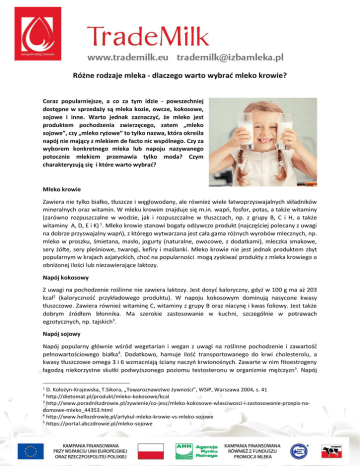 Różne rodzaje mleka - dlaczego warto wybrać mleko krowie? Coraz popularniejsze, a co za tym idzie - powszechniej dostępne w sprzedaży są mleka kozie, owcze, kokosowe, sojowe i inne. Warto jednak zaznaczyć, że mleko jest produktem pochodzenia zwierzęcego, zatem „mleko sojowe”, czy „mleko ryżowe” to tylko nazwa, która określa napój nie mający z mlekiem de facto nic wspólnego. Czy za wyborem konkretnego mleka lub napoju nazywanego potocznie mlekiem przemawia tylko moda? Czym charakteryzują się i które warto wybrać? Mleko krowie Zawiera nie tylko białko, tłuszcze i węglowodany, ale również wiele łatwoprzyswajalnych składników mineralnych oraz witamin. W mleku krowim znajduje się m.in. wapń, fosfor, potas, a także witaminy (zarówno rozpuszczalne w wodzie, jak i rozpuszczalne w tłuszczach, np. z grupy B, C i H, a także witaminy A, D, E i K) 1. Mleko krowie stanowi bogaty odżywczo produkt (najczęściej polecany z uwagi na dobrze przyswajalny wapń), z którego wytwarzana jest cała gama różnych wyrobów mlecznych, np. mleko w proszku, śmietana, masło, jogurty (naturalne, owocowe, z dodatkami), mleczka smakowe, sery żółte, sery pleśniowe, twarogi, kefiry i maślanki. Mleko krowie nie jest jednak produktem zbyt popularnym w krajach azjatyckich, choć na popularności mogą zyskiwać produkty z mleka krowiego o obniżonej ilości lub niezawierające laktozy. Napój kokosowy Z uwagi na pochodzenie roślinne nie zawiera laktozy. Jest dosyć kaloryczny, gdyż w 100 g ma aż 203 kcal2 (kaloryczność przykładowego produktu). W napoju kokosowym dominują nasycone kwasy tłuszczowe. Zawiera również witaminę C, witaminy z grupy B oraz niacynę i kwas foliowy. Jest także dobrym źródłem błonnika. Ma szerokie zastosowanie w kuchni, szczególnie w potrawach egzotycznych, np. tajskich3. Napój sojowy Napój popularny głównie wśród wegetarian i wegan z uwagi na roślinne pochodzenie i zawartość pełnowartościowego białka4. Dodatkowo, hamuje ilość transportowanego do krwi cholesterolu, a kwasy tłuszczowe omega 3 i 6 wzmacniają ściany naczyń krwionośnych. Zawarte w nim fitoestrogeny łagodzą niekorzystne skutki podwyższonego poziomu testosteronu w organizmie mężczyzn5. Napój 1 D. Kołożyn-Krajewska, T.Sikora, „Towaroznawstwo żywności”, WSiP, Warszawa 2004, s. 41 http://dietomat.pl/produkt/mleko-kokosowe/kcal 3 http://www.poradnikzdrowie.pl/zywienie/co-jesz/mleko-kokosowe-wlasciwosci-i-zastosowanie-przepis-nadomowe-mleko_44353.html 4 http://www.hellozdrowie.pl/artykul-mleko-krowie-vs-mleko-sojowe 5 https://portal.abczdrowie.pl/mleko-sojowe 2 sojowy jest jednak uboższy w wapń i witaminę B w porównaniu do mleka krowiego6. Często powoduje również alergie pokarmowe. Sama soja jest ciężkostrawna, więc napój ten nie jest zalecany osobom mającym problemy z jelitami i/lub trawieniem. Mleko kozie Zawiera mniej witaminy B2 oraz kwasu foliowego w porównaniu do mleka krowiego7. Posiada również mniejszą ilość kazeiny oraz β-laktoglubuliny (białko, uznawane za jedno z wywołujących alergie pokarmowe wieku dziecięcego)8. Należy zaznaczyć, że nabiał z mleka koziego jest nabiałem tłustym (mleko kozie jest tłustsze od krowiego), ale nie wywierającym złego wpływu na poziom cholesterolu. Mleko kozie stosowane jest głównie do produkcji sera. Ma charakterystyczny zapach oraz smak. Mleko owcze Najpopularniejsze jest w Hiszpanii, szczególnie jako produkt do wyrobu sera, np. znanych serów dojrzewających Manchego. W porównaniu do mleka krowiego i koziego jest ponad dwukrotnie tłustsze, ale ma więcej białka, węglowodanów, witaminy C, niektórych witamin z grupy B oraz wapnia i fosforu. W przeciwieństwie do mleka krowiego nie zawiera jednak kwasu foliowego i witaminy B69. Napój ryżowy Napój ryżowy to kolejna alternatywa pochodzenia roślinnego. Jego zaletą jest to, że może być spożywany przez osoby z nietolerancją laktozy, czy uczulone na kazeinę lub soję. Uważany jest za produkt hipoalergiczny. Jest bogaty w węglowodany, ale zawiera mniej witamin i minerałów w porównaniu do mleka krowiego, np. w oryginalnej postaci nie zawiera wapnia ani błonnika. Po napój ryżowy nie powinni sięgać cukrzycy, gdyż jego spożywanie może być przyczyną wysokiego indeksu glikemicznego (z powodu zawartości skrobi)10. Pomimo, iż na rynku dostępne jest wiele rodzajów mleka, jak i napojów, często mylnie traktowanych jako mleko, nie warto szukać zamienników mleka krowiego. Bogactwo znajdujących się w nim składników odżywczych, a także witamin i minerałów jest niezaprzeczalna i tym aspektem znacznie zyskuje względem innych, wymienionych powyżej produktów. Sięgając zatem po inne produkty, należy pamiętać, że nie stanowią one idealnego zamiennika. Nie oznacza to jednak, że nie mogą znaleźć się w naszej diecie. Po produkty roślinne wykluczając mleko krowie najczęściej sięgają osoby z nietolerancją laktozy. Nie jest to więc moda, ale nie jest to również potrzeba, gdyż producenci wyrobów mlecznych wychodząc naprzeciw ich potrzebom oferują mleko i jego produkty o obniżonej zawartości lub bez laktozy. Warto zatem pozostawić mleko w swojej diecie, wybierając spośród dostępnych na rynku najlepsze dla swojego organizmu. 6 http://dietetycy.org.pl/mleko-krowie-czy-mleko-sojowe/ http://www.kozy.edu.pl/?sklad-i-wartosc-odzywcza-mleka-koziego-w-porownaniu-z-mlekiem-krowimowczym-i-kobiecym.,78 8 D. Kołożyn-Krajewska, T. Sikora, M. Skrzypek, „Towaroznawstw”, WSiP, Warszawa 1999, s.46 9 http://www.kozy.edu.pl/?sklad-i-wartosc-odzywcza-mleka-koziego-w-porownaniu-z-mlekiem-krowimowczym-i-kobiecym.,78 10 http://www.hellozdrowie.pl/artykul-mleko-krowie-vs-mleko-ryzowe 7