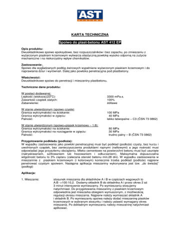 KARTA TECHNICZNA Spoiwo do plast-betonu AST 412 EP Opis produktu: Dwuskładnikowe spoiwo epoksydowe, bez rozpuszczalników i bez zapachu, po zmieszaniu z wyżarzonym piaskiem krzemowym wytwarza elastyczną powłokę wysoko odporną na zużycie mechaniczne i na niekorzystny wpływ chemikaliów. Zastosowanie:˛ Spoiwo dla wygładzanych podłóg żwirowych wypełniane wyżarzonym piaskiem krzemowym i do naprawiania dziur i wyrównań. Dalej jako powłoka penetracyjna pod plastbetony. Właściwości: Dwuskładnikowe spoiwo do penetracji i mieszaniny plastbetonu. Techniczne dane produktu: W postaci dodawanej: o Lepkość (wiskoza)(23 C): Zawartość cząstek stałych: Zabarwienie: 3300 mPa.s. 100% żółtawe W stanie utwierdzonym (spoiwo czyste) Granica wytrzymałości na ściskanie: Granica wytrzymałości w zgięciu: Palność: 100 MPa 40 MPa lekko łatwopalne – C3 (ČSN 73 0862) W stanie utwierdzonym (spoiwo+piasek krzemowy – 1:8): Granica wytrzymałości na ściskanie: Granica wytrzymałości na rozciąganie w zgięciu: Palność: 80 MPa 30 MPa trudno palny – B (ČSN 73 0862) Przygotowanie podkładu (podłoża): W wypadku zastosowania jako powłoki penetracyjnej musi być podkład (podłoże) czysty, bez kurzu i uwolnionych cząstek, bez zanieczyszczenia produktami ropnymi (naftowymi) a jego nośność musi odpowiadać jego przyszłemu obciążeniu. Mleko cementowe na powierzchni betonu musi być usunięte (natryskiwaniem, szlifowaniem lub frezowaniem i odkurzaniem). Maksymalna dopuszczalna wilgotność betonu to 3% ciężaru (zalecana starość betonu min.28 dni). W wypadku zastosowania w mieszaninie z piaskiem krzemowym (i kolorowym) koniecznie trzeba podkład (podłoże) najpierw penetrować czystym spoiwem. Następna aplikacja mieszaniny wykonywana jest tzw. „do świeżej” (podłogi) Aplikacja: 1. Mieszanie: stosunek mieszania dla składników A i B w częściach wagowych to A:B ->100:10,2. Dodamy składnik B do składnika A i przez okres 2 aż 3 minut intensywnie wymieszamy. Po wymieszaniu stosujemy natychmiast. Do przygotowania mieszaniny z piaskiem krzemowym odpowiednia jest mieszarka obiegiem wymuszonym, z możliwością regulacji okresu mieszania. Najpierw należy wymieszać składnik A i składnik B. Po wymieszaniu spoiwa należy dodać mieszaninę piasków krzemowych w wybranym stosunku i należy ustawić wymagany okres mieszania. Po dokładnym wymieszaniu należy mieszaninę natychmiast aplikować. 2. Nakładanie: powłoka penetracyjna: wałkiem malarskim, pędzlem naprawa dziur: rozgarnąć i zagęścić listwą i wygładzić ręcznie szpachlą położenie warstwy: nakładać za pomocą wózka aplikacyjnego w wymaganej grubości i zagładzić gładzikiem wirnikowym 3. Zużycie: Powłoka penetracyjna: ca 0,3 kg kg/m Mieszanina z piaskiem: przy stosunku wypełniania 1:8 (spoiwo: piasek) Jest zużycie spoiwa ca 1 kg/m2/5 mm grubości warstwy. 4. Utwardzanie: Reakcja chemiczna między składnikiem A i B: 2 o Obciążenie na chodzenie Lekkie obciążenie mechaniczne Całkowite utwardzanie o 10 C po 2 dniach po 7 dniach po 14 dniach 20 C po 16 godz. po 3 dniach po 7 dniach o Minimalna temperatura podkładu (podłoża) do aplikację wynosi 10 C. Z powodu lepszego oczyszczania i wyższej odporności polecamy wykonać zamknięcie powierzchni podłogi powłoką zamykającą AST 412 thixo i następnie wyposażyć powłoką poliuretanową (np. AST 200 lub AST 202). Koniecznie trzeba obserwować temperaturę „punktu rosy”, by przy aplikacji powłoki nie doszło do niepożądanych kondensacji wody na podłodze. Czyszczenie Narzędzia trzeba koniecznie oczyścić „na świeżo” rozcieńczalnikiem. Po uschnięciu można urządzenia oczyścić tylko mechanicznie. Pakowanie Zbiorniki 15 i 200 kg. Magazynowanie 6 miesięcy od daty produkcji w zamkniętym oryginalnym opakowaniu w chłodnym i suchym miejscu. Nie zużyte oryginalne opakowanie trzeba koniecznie wodoszczelnie zamknąć i zużyć jak najszybciej. Chronić przed mrozem! Dane bezpieczeństwa Substancja powłokowa zawiera organiczne rozpuszczalniki, drażni oczy i skórę. Nie jest przeznaczona do opracowania przychodzącego do bezpośredniego styku z wodą do picia, żywnością, karmą, powłokami mebli dziecięcych i zabawek dla dzieci. Podczas jej zastosowania koniecznie trzeba dotrzymywać odpowiednie przepisy ustawowe (rozporządzenie o niebezpiecznych substancjach) i instrukcje producenta podane w karcie technicznej i karcie bezpieczeństwa. Zasady higieny pracy Przy pracy należy zapewnić skuteczną wentylację, by nie doszło do wdychania szkodliwych oparów, które drażnią nie tylko organy oddechowe, ale także oczy i skórę. Dlatego koniecznie trzeba chronić się przy pracy odzieżą roboczą, okularami ochronnymi, rękawicami, pół-maską z filtrem dla rozpuszczalników organicznych. Podczas aplikacji nie wolno jeść, pić i palić papierosy. Zasady pierwszej pomocy Przy przedostaniu się do oczu natychmiast przepłukać wodą i potem wyszukać lekarza-specjalistę. W wypadku zanieczyszczenia skóry zdjąć ubranie a skórę dobrze omyć wodą z mydłem i opatrzyć odpowiednim kremem (Indulona). Przy wdychaniu oparów wyprowadzić poszkodowanego na świeże powietrze, zapewnić mu spokój i zabronić przeziębieniu ciepłą kołdrą. W wypadku spożycia natychmiast wypłukać usta wodą, wywołać wymiotowanie i jeszcze wypić w przybliżeniu pół litra wody do picia. Potem natychmiast wyszukać lekarza-specjalistę.