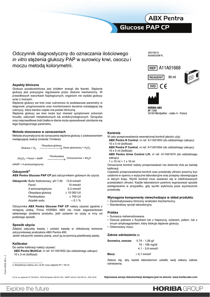ABX Pentra Glucose PAP CP ABX Pentra Glucose PAP CP Nr ref.: A11A01668 Objętość: 90 ml Odczynnik diagnostyczny do oznaczania ilościowego in vitro stężenia glukozy PAP w surowicy krwi, osoczu i moczu metodą kolorymetrii. 2007/09/10 A93A00202M PL A11A01668 90 ml Aspekty kliniczne Glukoza pozakomórkowa jest źródłem energii dla tkanek. Stężenie glukozy jest precyzyjne regulowane przez złożone mechanizmy. W prawidłowych warunkach fizjologicznych, organizm nie wydala glukozy wraz z moczem. Stężenie glukozy we krwi oraz cukromocz to podstawowe parametry w diagnozie, prognozowaniu oraz monitorowaniu leczenia rozwijającej się cukrzycy, która bardzo często ma postać kliniczną. Stężenie glukozy we krwi może być również symptomem schorzeń trzustki, zaburzeń metabolicznych lub endokrynologicznych. Gorączka oraz nieprawidłowa ilość białka w diecie może spowodować obniżenie się tego fizjologicznego parametru. Metoda stosowana w oznaczeniach Metoda enzymatyczna do oznaczania stężenia glukozy z zastosowaniem następującej reakcji (metoda Trindera): Glukoza + O2 Oksydaza glukozy 2H2O2 + Fenol + 4AAP Kwas glukozowy + H2O2 Peroksydaza Chinonoimina + 4H2O (4AAP = 4-aminoantypiryna) Odczynnika ABX Pentra Glucose PAP CP jest odczynnikiem gotowym do użycia. Odczynnik: Bufor fosforanowy, pH 7,40 Fenol 4-aminoantypiryna Oksydaza glukozy Peroksydaza Azydek sodu 13,8 mmol/l 10 mmol/l 0,3 mmol/l ≥ 10 000 U/l ≥ 700 U/l < 0.1 % Odczynnika ABX Pentra Glucose PAP CP należy używać zgodnie z niniejszą ulotką. Firma HORIBA ABX nie może zagwarantować właściwego działania produktu, jeśli zostanie on użyty w inny od podanego sposób. Sposób użycia Zdejmij zatyczkę kasety i umieść kasetę w chłodzonej komorze odczynnikowej analizatora ABX Pentra 400. Jeżeli odczynnik zawiera pianę, usuń ją za pomocą plastikowej pipety. Form-0846 Rev. 2 Kalibrator HORIBA ABX BP 7290 34184 Montpellier - cedex 4 - France Kontrola W celu przeprowadzenia wewnętrznej kontroli jakości użyj: ABX Pentra N Control, nr ref. A11A01653 (do oddzielnego zakupu) 10 x 5 ml (liofilizat) ABX Pentra P Control, nr ref. A11A01654 (do oddzielnego zakupu) 10 x 5 ml (liofilizat) ABX Pentra Urine Control L/H, nr ref. A11A01674 (do oddzielnego zakupu) 1 x 10 ml + 1 x 10 ml Oznaczenie kontroli należy przeprowadzać raz dziennie i/lub po każdej kalibracji. Częstość przeprowadzania kontroli oraz przedziały ufności powinny być ustalone w oparciu o wytyczne laboratoryjne oraz przepisy obowiązujące w danym kraju. Wynik kontroli musi zawierać się w zdefiniowanych przedziałach ufności. Każde laboratorium powinno wypracować sposób postępowania w przypadku, gdy wyniki wykroczą poza wyznaczone przedziały. Wymagane komponenty niewchodzące w skład produktu • Zautomatyzowany kliniczny analizator biochemiczny. • Standardowy sprzęt laboratoryjny. Próbka • Surowica niehemolizowana. • Osocze pobrane z fluorkiem lub z heparyną, octanem, jodem, lub z innym antykoagulantem, który blokuje stężenie glukozy. • Odwirowany mocz. Zakres odniesienia (9) Surowica, osocze: 0.74 - 1,06 g/l 74 - 106 mg/dl 4.1 - 5,9 mmol/l Do celów kalibracji należy używać: ABX Pentra MultiCal, nr ref. A11A01652 (do oddzielnego zakupu) 10 x 3 ml (liofilizat) Mocz: a. Modyfikacja indeksu od L do M: nowy objętość R1 = 90 ml. Zaleca się, aby każde laboratorium ustaliło swój własny zakres odniesienia. S.A.S. au capital de 41.700.000 € - RCS Montpellier 328 031 042 - SIRET 328 031 042 000 42 - APE 332 B < 0,1 mmol/l Najnowsza wersja dokumentacji dostępna jest na stronie: www.horiba-abx.com ABX Pentra Glucose PAP CP Przechowywanie i stabilność W nieotwieranych kasetach odczynniki zachowują stabilność do upływu terminu podanego na etykiecie, o ile są przechowywane w temperaturze 2-8°C oraz chronione przed światłem. Stabilność po otwarciu: patrz sekcja „Wydajność przy użyciu w analizatorze ABX Pentra 400”. Sposób przeprowadzania pomiaru Opis sposobu przeprowadzania pomiarów przy użyciu urządzeń innych niż analizator ABX Pentra 400 jest dostępny na życzenie klienta. Postępowanie z odpadami 1. Należy postępować zgodnie z lokalnie obowiązującymi przepisami. 2. Opisywany odczynnik jest konserwowany azydkiem sodu, obecnym w stężeniu poniżej 0,1%. Ponieważ azydek sodu może wchodzić w reakcje z ołowiem lub miedzią, tworząc wybuchowe azydki metali, odczynnik należy wylewać do odpływu kanalizacyjnego spłukując obficie wodą. Ogólne środki ostrożności • Odtwarzalność (precyzja powtarzania oznaczeń) Urządzenie przez 20 dni (2 serie na dzień) przeprowadza po dwa oznaczenia dla 2 próbek o niskim i wysokim stężeniu oraz dla 2 kontroli, zgodnie z zaleceniami NCCLS, procedura EP5-A (6). Kontrola normalna Kontrola patologiczna Próbka 1 Próbka 2 Wydajność przy użyciu w analizatorze ABX Pentra 400 Triglicerydy: Liczba oznaczeńa: 295 Stabilność robocza odczynników: Po otwarciu, kaseta z odczynnikiem umieszczona w chłodzonej komorze analizatora ABX Pentra 400 zachowuje stabilność przez 83 dni. Objętość próbki: 4 μl/oznaczenie Wykrywalność: Wykrywalność ustalono zgodnie z zaleceniami procedury Valtec (5) i wynosi ona 0,1 mmol/l. Dokładność i precyzja: • Powtarzalność (precyzja w trakcie pracy urządzenia) Urządzenie przeprowadza 20 razy oznaczenia dla 3 próbek o niskim, średnim oraz wysokim stężeniu oraz dla 2 kontroli, zgodnie z zaleceniami procedury Valtec (5). Kontrola normalna Kontrola patologiczna Próbka 1 Próbka 2 Próbka 3 Wartość średnia mmol/l 4.96 12.81 2.38 6.19 16.46 1.23 1.12 1.44 1.05 Korelacja: 100 próbek pobranych od pacjentów koreluje się z komercyjnie dostępnym odczynnikiem, służącym jako wzorzec, zgodnie z zaleceniami NCCLS, procedura EP9-A2 (8). Równanie dla otrzymanej linii allometrycznej wygląda następująco: Y = 1,01 x - 0,06 przy współczynniku korelacji r = 0,999. Hemoglobina: Surowica, oso