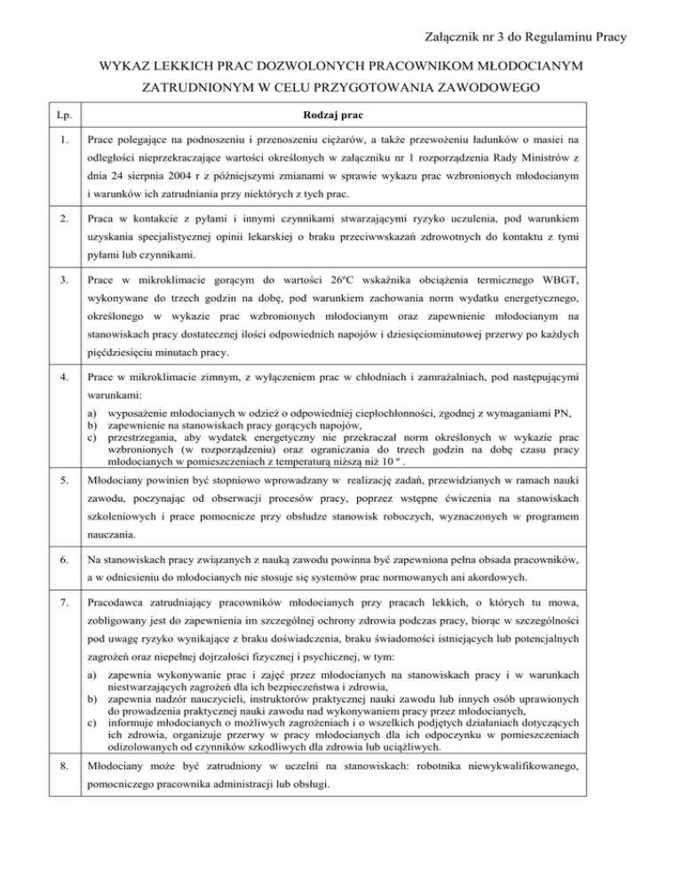 Załącznik nr 3 do Regulaminu Pracy WYKAZ LEKKICH PRAC DOZWOLONYCH PRACOWNIKOM MŁODOCIANYM ZATRUDNIONYM W CELU PRZYGOTOWANIA ZAWODOWEGO Lp. Rodzaj prac 1. Prace polegające na podnoszeniu i przenoszeniu ciężarów, a także przewożeniu ładunków o masiei na odległości nieprzekraczające wartości określonych w załączniku nr 1 rozporządzenia Rady Ministrów z dnia 24 sierpnia 2004 r z późniejszymi zmianami w sprawie wykazu prac wzbronionych młodocianym i warunków ich zatrudniania przy niektórych z tych prac. 2. Praca w kontakcie z pyłami i innymi czynnikami stwarzającymi ryzyko uczulenia, pod warunkiem uzyskania specjalistycznej opinii lekarskiej o braku przeciwwskazań zdrowotnych do kontaktu z tymi pyłami lub czynnikami. 3. Prace w mikroklimacie gorącym do wartości 26ºC wskaźnika obciążenia termicznego WBGT, wykonywane do trzech godzin na dobę, pod warunkiem zachowania norm wydatku energetycznego, określonego w wykazie prac wzbronionych młodocianym oraz zapewnienie młodocianym na stanowiskach pracy dostatecznej ilości odpowiednich napojów i dziesięciominutowej przerwy po każdych pięćdziesięciu minutach pracy. 4. Prace w mikroklimacie zimnym, z wyłączeniem prac w chłodniach i zamrażalniach, pod następującymi warunkami: a) wyposażenie młodocianych w odzież o odpowiedniej ciepłochłonności, zgodnej z wymaganiami PN, b) zapewnienie na stanowiskach pracy gorących napojów, c) przestrzegania, aby wydatek energetyczny nie przekraczał norm określonych w wykazie prac wzbronionych (w rozporządzeniu) oraz ograniczania do trzech godzin na dobę czasu pracy młodocianych w pomieszczeniach z temperaturą niższą niż 10 º . 5. Młodociany powinien być stopniowo wprowadzany w realizację zadań, przewidzianych w ramach nauki zawodu, poczynając od obserwacji procesów pracy, poprzez wstępne ćwiczenia na stanowiskach szkoleniowych i prace pomocnicze przy obsłudze stanowisk roboczych, wyznaczonych w programem nauczania. 6. Na stanowiskach pracy związanych z nauką zawodu powinna być zapewniona pełna obsada pracowników, a w odniesieniu do młodocianych nie stosuje się systemów prac normowanych ani akordowych. 7. Pracodawca zatrudniający pracowników młodocianych przy pracach lekkich, o których tu mowa, zobligowany jest do zapewnienia im szczególnej ochrony zdrowia podczas pracy, biorąc w szczególności pod uwagę ryzyko wynikające z braku doświadczenia, braku świadomości istniejących lub potencjalnych zagrożeń oraz niepełnej dojrzałości fizycznej i psychicznej, w tym: a) zapewnia wykonywanie prac i zajęć przez młodocianych na stanowiskach pracy i w warunkach niestwarzających zagrożeń dla ich bezpieczeństwa i zdrowia, b) zapewnia nadzór nauczycieli, instruktorów praktycznej nauki zawodu lub innych osób uprawionych do prowadzenia praktycznej nauki zawodu nad wykonywaniem pracy przez młodocianych, c) informuje młodocianych o możliwych zagrożeniach i o wszelkich podjętych działaniach dotyczących ich zdrowia, organizuje przerwy w pracy młodocianych dla ich odpoczynku w pomieszczeniach odizolowanych od czynników szkodliwych dla zdrowia lub uciążliwych. 8. Młodociany może być zatrudniony w uczelni na stanowiskach: robotnika niewykwalifikowanego, pomocniczego pracownika administracji lub obsługi.