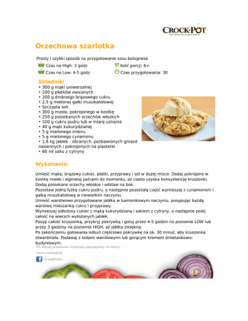 Orzechowa szarlotka Prosty i szybki sposób na przygotowanie sosu bolognese Czas na High: 3 godz Ilość porcji: 6+ Czas na Low: 4-5 godz Czas przygotowania: 30 Składniki • 300 g mąki uniwersalnej • 100 g płatków owsianych • 200 g drobnego brązowego cukru • 2,5 g mielonej gałki muszkatołowej • Szczypta soli • 300 g masła, pokrojonego w kostkę • 250 g posiekanych orzechów włoskich • 100 g cukru pudru lub w miarę uznania • 40 g mąki kukurydzianej • 5 g mielonego imbiru • 5 g mielonego cynamonu • 1,6 kg jabłek - obranych, pozbawionych gniazd nasiennych i pokrojonych na plasterki • 60 ml soku z cytryny Wykonanie: Umieść mąkę, brązowy cukier, płatki, przyprawy i sól w dużej misce. Dodaj pokrojone w kostkę masło i wgniataj palcami do momentu, aż ciasto uzyska konsystencję kruszonki. Dodaj posiekane orzechy włoskie i odstaw na bok. Pozostaw jedną łyżkę cukru pudru, a następnie pozostałą część wymieszaj z cynamonem i gałką muszkatołową w niewielkim naczyniu. Umieść warstwowo przygotowane jabłka w kamionkowym naczyniu, posypując każdą warstwę mieszanką cukru i przyprawy. Wymieszaj odłożony cukier z mąką kukurydzianą i sokiem z cytryny, a następnie polej całość na wierzch wyłożonych jabłek. Posyp całość kruszonką, przykryj pokrywką i gotuj przez 4-5 godzin na poziomie LOW lub przez 3 godziny na poziomie HIGH, aż jabłka zmiękną. Po zakończeniu gotowania odsuń częściowo pokrywkę na ok. 30 minut, aby kruszonka stwardniała. Podawaj z lodami waniliowymi lub gorącym kremem śmietankowobudyniowym.