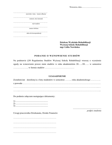 Podanie o wznowienie studiów - Wyższa Szkoła Rehabilitacji