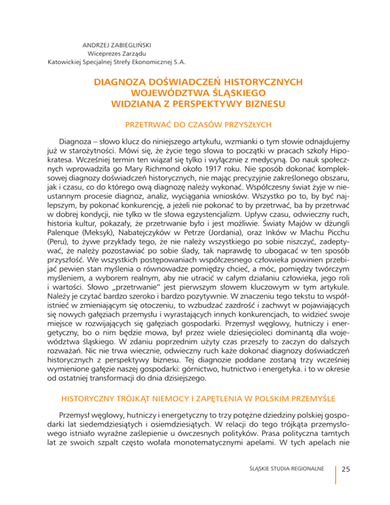Andrzej Zabiegliński Wiceprezes Zarządu Katowickiej Specjalnej Strefy Ekonomicznej S.A. DIAGNOZA DOŚWIADCZEŃ HISTORYCZNYCH WOJEWÓDZTWA ŚLĄSKIEGO WIDZIANA Z PERSPEKTYWY BIZNESU PRZETRWAĆ DO CZASÓW PRZYSZŁYCH Diagnoza – słowo klucz do niniejszego artykułu, wzmianki o tym słowie odnajdujemy już w starożytności. Mówi się, że życie tego słowa to początki w pracach szkoły Hipokratesa. Wcześniej termin ten wiązał się tylko i wyłącznie z medycyną. Do nauk społecznych wprowadziła go Mary Richmond około 1917 roku. Nie sposób dokonać kompleksowej diagnozy doświadczeń historycznych, nie mając precyzyjnie zakreślonego obszaru, jak i czasu, co do którego ową diagnozę należy wykonać. Współczesny świat żyje w nieustannym procesie diagnoz, analiz, wyciągania wniosków. Wszystko po to, by być najlepszym, by pokonać konkurencję, a jeżeli nie pokonać to by przetrwać, ba by przetrwać w dobrej kondycji, nie tylko w tle słowa egzystencjalizm. Upływ czasu, odwieczny ruch, historia kultur, pokazały, że przetrwanie było i jest możliwie. Światy Majów w dżungli Palenque (Meksyk), Nabatejczyków w Petrze (Jordania), oraz Inków w Machu Picchu (Peru), to żywe przykłady tego, że nie należy wszystkiego po sobie niszczyć, zadeptywać, że należy pozostawiać po sobie ślady, tak naprawdę to ubogacać w ten sposób przyszłość. We wszystkich postępowaniach współczesnego człowieka powinien przebijać pewien stan myślenia o równowadze pomiędzy chcieć, a móc, pomiędzy twórczym myśleniem, a wyborem realnym, aby nie utracić w całym działaniu człowieka, jego roli i wartości. Słowo „przetrwanie” jest pierwszym słowem kluczowym w tym artykule. Należy je czytać bardzo szeroko i bardzo pozytywnie. W znaczeniu tego tekstu to współistnieć w zmieniającym się otoczeniu, to wzbudzać zazdrość i zachwyt w pojawiających się nowych gałęziach przemysłu i wyrastających innych konkurencjach, to widzieć swoje miejsce w rozwijających się gałęziach gospodarki. Przemysł węglowy, hutniczy i energetyczny, bo o nim będzie mowa, był przez wiele dziesięcioleci dominantą dla województwa śląskiego. W zdaniu poprzednim użyty czas przeszły to zaczyn do dalszych rozważań. Nic nie trwa wiecznie, odwieczny ruch każe dokonać diagnozy doświadczeń historycznych z perspektywy biznesu. Tej diagnozie poddane zostaną trzy wcześniej wymienione gałęzie naszej gospodarki: górnictwo, hutnictwo i energetyka. i to w okresie od ostatniej transformacji do dnia dzisiejszego. HISTORYCZNY TRÓJKĄT NIEMOCY I ZAPĘTLENIA W POLSKIM PRZEMYŚLE Przemysł węglowy, hutniczy i energetyczny to trzy potężne dziedziny polskiej gospodarki lat siedemdziesiątych i osiemdziesiątych. W relacji do tego trójkąta przemysłowego istniało wyraźne zaślepienie u ówczesnych polityków. Prasa polityczna tamtych lat ze swoich szpalt często wołała monotematycznymi apelami. W tych apelach nie Śląskie Studia Regionalne 25 chodziło o nic więcej, jak tylko o to by owych ton węgla i stali oraz terawatogodzin energii było, jak najwięcej, a stosowany system nie był już w stanie więcej z siebie dać. Szpalty często wołały: do górników – „Trzeba nam więcej węgla dla rozwijających się hut i elektrowni”, do hutników – „Trzeba nam więcej stali dla rozwijających się kopalń i elektrowni”, do energetyków – „Trzeba nam więcej energii dla rozwijających się kopalń i hut”. Tu też w największym zakresie rozdawane były firmowe przywileje. Pozostałe przemysły tak naprawdę rozwijały się pod potrzeby tych trzech wówczas kluczowych branż polskiej gospodarki. Przebić się z innowacjami w innych dziedzinach było bardzo trudno, czasami wręcz niemożliwe. By cokolwiek osiągnąć należało zawsze pamiętać, jak swoje dobre intencje podciągnąć pod opisywane branże. By mieć więcej, też trzeba było posiadać status powiązania z tymi branżami. Jako lapidarny przykład zacytuję branżę budowlaną. Dwa państwowe przedsiębiorstwa zajmujące się tym samym - budową mieszkań, tzw. wielkiej płyty. Jedno z nich miało nazwę Przedsiębiorstwo Budownictwa Mieszkaniowego i było zwykłym polskim przedsiębiorstwem z małą ilością przywilejów. Druga nazwa brzmiała o wiele dumniej - Przedsiębiorstwo Budownictwa Mieszkaniowego Przemysłu Węglowego. W bardzo prosty sposób można było zyskać o wiele więcej przywilejów, oczywiście tych o pochodzeniu materialnym. W tej nietypowej sytuacji dla gospodarki rynkowej przyszła końcówka lat osiemdziesiątych. Kryzys w kraju był nieunikniony, fala strajków, gospodarka zwalniała, ba wręcz hamowała. W wielu przedsiębiorstwach wyczuwało się brak płynnego przekazywania obciążeń na wał korbowy polskiej gospodarki, w celu dalszego dynamicznego kontynuowania ruchu dla szybszego rozwoju Polski. Zwrot „wał korbowy” jest drugim kluczowym zestawem słów dla tego artykułu. Tłoki o nazwie górnictwo, hutnictwo i energetyka zaczęły nierytmicznie przekazywać swój ruch na wał korbowy polskiej gospodarki. Cała gospodarka zwalniała, rosło niezadowolenie społeczne, handel zamieniał się w zmorę kartkową, a o dobrach podstawowych społeczeństwo powoli zaczynało jedynie marzyć, by je posiadać, a nie mieć. Wszystko trzeba było zdobywać. Zwyciężał z wszystkimi innymi zawodami niezastąpiony handlowiec. Był on w tym czasie najważniejszym dobrem posiadanym w polskiej, a więc i w śląskiej rodzinie. PLECAK, Z JAKIM ŚLĄSK WKROCZYŁ W LATA 1989–2011 Dla Śląska ów plecak z zapakowanym trójkątem niemocy i zapętlenia okazał się bardzo pokaźnych gabarytów, a w związku z tym strasznie trudnym do dalszego uniesienia przez panującą partię, administrację rządową, jak i same wymienione branże przemysłowe. Szelki w owym plecaku okazały się dosyć mocno zużyte, a szwy zaczynały szybko puszczać. Budowany z tak wielką troską 
