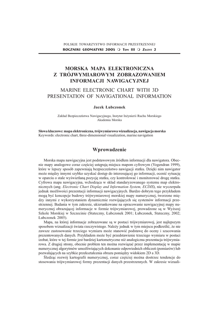 TOWARZYSTWO INFORMACJI PRZESTRZENNEJ Morska mapa POLSKIE elektroniczna z trójwymiarowym zobrazowaniem informacji nawigacyjnej ROCZNIKI GEOMATYKI 2005 m TOM III m Z ESZYT 2 107 MORSKA MAPA ELEKTRONICZNA Z TRÓJWYMIAROWYM ZOBRAZOWANIEM INFORMACJI NAWIGACYJNEJ MARINE ELECTRONIC CHART WITH 3D PRESENTATION OF NAVIGATIONAL INFORMATION Jacek £ubczonek Zak³ad Bezpieczeñstwa Nawigacyjnego, Instytut In¿ynierii Ruchu Morskiego Akademia Morska S³owa kluczowe: mapa elektroniczna, trójwymiarowa wizualizacja, nawigacja morska Keywords: electronic chart, three-dimensional visualization, marine navigation Wprowadzenie Morska mapa nawigacyjna jest podstawowym ród³em informacji dla nawigatora. Obecnie mapy analogowe coraz czêciej ustêpuj¹ miejsca mapom cyfrowym (Yogendran 1999), które w lepszy sposób zapewniaj¹ bezpieczeñstwo nawigacji statku. Dziêki nim nawigator mo¿e miêdzy innymi szybko uzyskaæ dostêp do interesuj¹cej go informacji, oceniæ sytuacjê w oparciu o stale wywietlan¹ pozycjê statku, czy kontrolowaæ i monitorowaæ drogê statku. Cyfrowa mapa nawigacyjna, wchodz¹ca w sk³ad standaryzowanego systemu map elektronicznych (ang. Electronic Chart Display and Information System, ECDIS), nie wyczerpa³a jednak mo¿liwoci prezentacji informacji nawigacyjnych. Bardzo dobrym tego przyk³adem mog¹ byæ koncepcje budowy trójwymiarowej morskiej mapy numerycznej, tworzone miêdzy innymi z wykorzystaniem dynamicznie rozwijaj¹cych siê systemów informacji przestrzennej. Badania w tym zakresie, ukierunkowane na opracowanie nawigacyjnej mapy numerycznej obrazuj¹cej informacje w formie trójwymiarowej, prowadzone s¹ w Wy¿szej Szkole Morskiej w Szczecinie (Stateczny, £ubczonek 2001; £ubczonek, Stateczny, 2002; £ubczonek 2005). Mapa, na której informacje zobrazowane s¹ w postaci trójwymiarowej, jest najlepszym sposobem wizualizacji wiata rzeczywistego. Nale¿y jednak w tym miejscu podkreliæ, ¿e nie zawsze zastosowanie trzeciego wymiaru mo¿e stanowiæ podstawê do oceny i szacowania prezentowanych danych. Przyk³adem mo¿e byæ przedstawienie trzeciego wymiaru w postaci izobat, które w tej formie jest bardziej kartometryczne ni¿ analogiczna prezentacja trójwymiarowa. Z drugiej strony, obecnie problem ten mo¿na rozwi¹zaæ przez implementacjê w mapie numerycznej algorytmów umo¿liwiaj¹cych dokonanie odpowiednich obliczeñ (pomiarów) lub pozwalaj¹cych na szybkie przekszta³cenia obrazu pomiêdzy widokiem 2D a 3D. ledz¹c rozwój kartografii numerycznej, coraz czêciej mo¿na dostrzec tendencje do stosowania trójwymiarowej formy prezentacji danych przestrzennych. W zakresie wizuali- 108 Jacek £ubczonek zacji informacji staje siê to coraz bardziej powszechne, czego dowodem jest poszerzanie oprogramowania kartograficznego o modu³y umo¿liwiaj¹ce trójwymiarow¹ wizualizacjê. Dotyczy to równie¿ map nawigacyjnych. Chocia¿ trójwymiarow¹ wizualizacjê informacji nawigacyjnej na obecnym etapie nale¿y traktowaæ jako koncepcyjn¹, na chwilê obecn¹ z pewnoci¹ nale¿y poszukaæ odpowiedzi na pytanie, czy taka forma przedstawienia informacji nawigacyjnej zwiêkszy funkcjonalnoæ map nawigacyjnych i czy przyczyni siê do zwiêkszenia bezpieczeñstwa nawigacji. Próbê znalezienia odpowiedzi na takie pytania podjêto miêdzy innymi w niniejszej pracy. Nowe rozwi¹zania w systemach morskich map elektronicznych W nawigacji morskiej mo¿na korzystaæ ze standaryzowanych opracowañ map elektronicznych oraz niestandaryzowanych. W pierwszym przypadku s¹ one elementem systemu zobrazowania informacji nawigacyjnej (ECDIS), natomiast w drugim pozosta³ych systemów map elektronicznych (ECS). Powy¿szy podzia³ warunkuje tak¿e kierunki rozwoju map elektronicznych. Dla standaryzowanych systemów map elektronicznych wyznacza go Miêdzynarodowa Organizacja Hydrograficzna, koordynuj¹ca dzia³ania ró¿nych grup roboczych powi¹zanych z odpowiednimi cia³ami administracji morskiej. Owocem tej pracy jest opracowanie wytycznych nastêpnego standardu map elektronicznych S-57 ver. 4.0 (IHO 2005), który bêdzie przystosowany do nowych wymagañ, technologii, odbiorców gotowych produktów i stanu techniki. Jego wdro¿enie planowane jest w 2006 roku, z zachowaniem jeszcze poprzedniej wersji standardu. Docelowo nowa wersja standardu ma zapewniæ obs³ugê wiêkszej liczby róde³ danych, produktów oraz klientów powi¹zanych z hydrografi¹. Jak wynika z za³o¿eñ nowego standardu, system zwiêkszy swoj¹ funkcjonalnoæ miêdzy innymi dziêki wprowadzeniu danych trójwymiarowych (3D), danych z czwart¹ zmienn¹ czasow¹ (x,y,z,t), nowych aplikacji wykraczaj¹cych poza zakres tradycyjnej hydrografii (np. batymetria wysokogêstociowa, morski GIS czy klasyfikacja dna morskiego). W powy¿szych rozwi¹zaniach planuje siê równie¿ wykorzystanie internetu do odkrywania, przegl¹dania, analizy oraz transferu danych. W przypadku systemów niestandaryzowanych, rozwój map zwi¹zany jest z obecnymi trendami w kartografii numerycznej. W zastosowaniach nawigacyjnych dotyczy to przede wszystkim wprowadzenia trójwymiarowej wizualizacji dna morskiego, implementacji informacji z systemów precyzyjnego okrelania pozycji statku w systemach manewrowo-pilotowych (np. dalmierze laserowe), do³¹czania informacji dostêpnej w publikacjach nautycznych (locje, tablice p³ywów) oraz innych informacji opisowych. W mapach morskich mo¿na równie¿ zaobserwowaæ uzupe³nianie podstawowej informacji o zdjêcia lotnicze czy satelitarne. W niektórych rozwi¹zaniach funkcje systemowe umo¿liwiaj¹ przedstawienie dynamicznej zmiany g³êbokoci na akwenie, bie¿¹cych informacji meteorologicznych, dostêpne s¹ równie¿ aplikacje do optymalizacji podró¿y statku. Sama mapa elektroniczna jest obecnie nieodzownym sk³adnikiem systemów zarz¹dzania portami, drogami wodnymi czy stref¹ brzegow¹ morza (zakres morskiego GIS). Bior¹c pod uwagê ró¿norodnoæ produktów, mo¿na stwierdziæ, ¿e mapy nawigacyjne niest