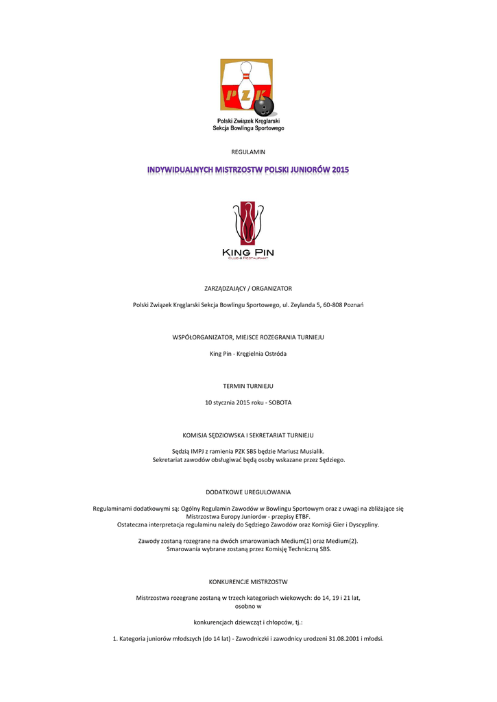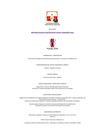 REGULAMIN ZARZĄDZAJĄCY / ORGANIZATOR Polski Związek Kręglarski Sekcja Bowlingu Sportowego, ul. Zeylanda 5, 60-808 Poznań WSPÓŁORGANIZATOR, MIEJSCE ROZEGRANIA TURNIEJU King Pin - Kręgielnia Ostróda TERMIN TURNIEJU 10 stycznia 2015 roku - SOBOTA KOMISJA SĘDZIOWSKA I SEKRETARIAT TURNIEJU Sędzią IMPJ z ramienia PZK SBS będzie Mariusz Musialik. Sekretariat zawodów obsługiwać będą osoby wskazane przez Sędziego. DODATKOWE UREGULOWANIA Regulaminami dodatkowymi są: Ogólny Regulamin Zawodów w Bowlingu Sportowym oraz z uwagi na zbliżające się Mistrzostwa Europy Juniorów - przepisy ETBF. Ostateczna interpretacja regulaminu należy do Sędziego Zawodów oraz Komisji Gier i Dyscypliny. Zawody zostaną rozegrane na dwóch smarowaniach Medium(1) oraz Medium(2). Smarowania wybrane zostaną przez Komisję Techniczną SBS. KONKURENCJE MISTRZOSTW Mistrzostwa rozegrane zostaną w trzech kategoriach wiekowych: do 14, 19 i 21 lat, osobno w konkurencjach dziewcząt i chłopców, tj.: 1. Kategoria juniorów młodszych (do 14 lat) - Zawodniczki i zawodnicy urodzeni 31.08.2001 i młodsi. 2. Kategoria juniorów dziewcząt i chłopców (do lat 19) - Zawodniczki i zawodnicy urodzeni w terminie: 31.08.1996 - 30.08.2001. 3. Kategoria juniorów starszych dziewcząt i chłopców (do 21 lat) - Zawodniczki i zawodnicy urodzeni w terminie: 01.09.1996 - 31.12.1993. WARUNKI UCZESTNICTWA Aby móc uczestniczyć w zawodach, zawodnik musi posiadać polskie obywatelstwo. Każdy ze startujących musi być zarejestrowany poprzez swój klub jako zawodnik PZK SBS oraz posiadać przy sobie dowód tożsamości (dowód osobisty lub legitymacja szkolna), oraz ważne badanie lekarskie wydane przez lekarza sportowego lub lekarza z uprawnieniami do wydawania takich zaświadczeń. Brak ważnych badań lekarskich uniemożliwia start w zawodach. Zgłoszenia do turnieju należy dokonać drogą on-line poprzez stronę internetową: www.pzksbs.pl, w przypadku problemów również e-mailem [email protected] z podaniem nr licencji, imienia i nazwiska oraz kategorii wiekowej. Nie przewiduje się organizacji dodatkowych składów. Listy startowe uruchomione zostaną 10.12.2013 o godz.12.00, natomiast zamknięte 08.01.2014 o godz.18.00. Start w zawodach dla wszystkich juniorów jest BEZPŁATNY, koszty związane z wynajęciem kręgielni pokrywa PZK SBS przy współpracy z kręgielnią KING PIN w Ostródzie Sprawdzanie dokumentów zawodniczych, badań lekarskich, losowanie torów i odebranie formularzy ewidencji wyników nastąpi najpóźniej na 30 minut przed rozpoczęciem gier. Wszystkich zawodników prosimy o punktualne przybycie. Zawody zostaną rozegrane systemem amerykańskim tzw. zmiennych torów ze zmianą torów co każdą grę (z torów parzystych o dwa tory w prawo, z torów nieparzystych o dwa tory w lewo) Przed każdym składem eliminacyjnym zostanie załączona 10-cio minutowa rozgrzewka. Natomiast przed pojedynkami 5-cio minutowa rozgrzewka. W przypadku remisu o miejscu decyduje ostatnia rozegrana gra, następnie przedostatnia, itd. W pojedynkach remisy będą rozstrzygane na zasadach ‘rzutu jednej kuli' PROGRAM TURNIEJU ELIMINACJE 10.01.2014 Sobota godz. 9:00 JUNIORZY i JUNIORZY STARSI - 4 gry eliminacyjne na smarowaniu medium (1) godz. 11.30 JUNIORZY MŁODSI - 4 gry eliminacyjne na smarowaniu medium (1) godz. 13.30 JUNIORZY MŁODSI - FINAL - awansuje 4-ch najlepszych zawodników po eliminacjach. Zagrają pojedynki według schematu: tory 3-4- chłopcy, 5-6- dziewczyny - Pojedynek nr 1 zawodnik z miejsca 1. z zawodnikiem z miejsca 4. (1 gra) - Pojedynek nr 2 zawodnik z miejsca 2. z zawodnikiem z miejsca 3. (1 gra) - Pojedynek nr 3 zwycięzca pojedynku nr 1 ze zwycięzcą pojedynku nr 2. (1 gra) Zwycięzca pojedynku nr 3 zdobywa tytuł Indywidualnego Mistrza Polski Juniorów Młodszych 2015, przegrany zaś tytuł Indywidualnego Vice Mistrza Polski Juniorów Młodszych 2015, przegrani pojedynków 1 i 2 uhonorowani zostaną brązowymi medalami Indywidualnych Mistrzostw Polski Juniorów Młodszych godz. 15.00 JUNIORZY i JUNIORZY STARSI - 4 gry eliminacyjne na smarowaniu medium (2) godz. 18.30 FINAŁ - JUNIORZY i JUNIORZY STARSI - awansuje 4-ch najlepszych zawodników po eliminacjach. Zagrają pojedynki według schematu: tory 1-2- dziewczyny J tory 3-4 dziewczyny JS tory 5-6 chłopcy J, tory 7-8 chłopcy JS Do finału awansuje 4 najlepszych zawodników po 8 grach eliminacyjnych (MEDIUM(1) + MEDIUM(2). Zagrają pojedynki według schematu: - Pojedynek nr 1 zawodnik z miejsca 1. z zawodnikiem z miejsca 4. (1 gra) - Pojedynek nr 2 zawodnik z miejsca 2. z zawodnikiem z miejsca 3. (1 gra) - Pojedynek nr 3 zwycięzca pojedynku nr 1 ze zwycięzcą pojedynku nr 2. (1 gra) Zwycięzca pojedynku nr 3 zdobywa tytuł Indywidualnego Mistrza Polski Juniorów 2015, przegrany zaś tytuł Indywidualnego Vice Mistrza Polski Juniorów 2015, przegrani pojedynków 1 i 2 uhonorowani zostaną brązowymi medalami Indywidualnych Mistrzostw Polski Juniorów godz. 19.15 FINAŁ MASTERS - 6 zawodników najwyżej sklasyfikowanych po 8 grach eliminacyjnych zagra Round Robin (suma 5 gier wraz z bonusami liczona od zera, za zwycięstwo w pojedynku dodatkowo 20pkt, za remis w pojedynku 10pkt). W przypadku remisu w eliminacjach o miejscu decyduje ostatnia rozegrana gra, następnie przedostatnia, itd. W pojedynkach remisy będą rozstrzygane na zasadach ‘rzutu jednej kuli' W round robin remis po między pierwszymi dwoma zawodnikami rozstrzygnie "rzut jednej kuli" HARMONOGRAM Sobota, 4.01.2014: 8:15-9:00 - SMAROWANIE TORÓW 9.00 - Skład nr 1: 4 gry - juniorzy, smarowanie MEDIUM(1) (max 24 zawodników ) 10:45-11:30 - PRZERWA NA SMAROWANIE TORÓW 11.30 - Skład nr 2: 4 gry - juniorzy młodsi, smarowanie MEDIUM(1) (max 24 zawodników) 13.30 - JUNIORZY MŁODSI pojedynek nr 1 i 2 - 1 gra 14.00 - JUNIORZY MŁODSI pojedynek nr 3 - 1 gra 14.30 - Ceremonia dekoracji zwycięzców kategorii juniorów młodszych 14:15-15:00 - PRZERWA NA SMAROWANIE TORÓW 15:00 - S