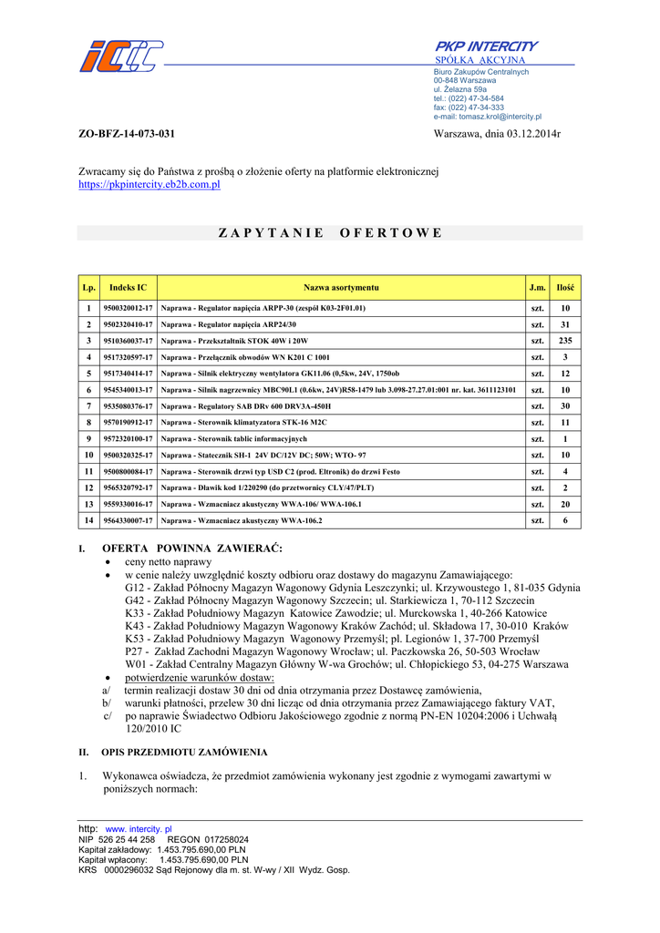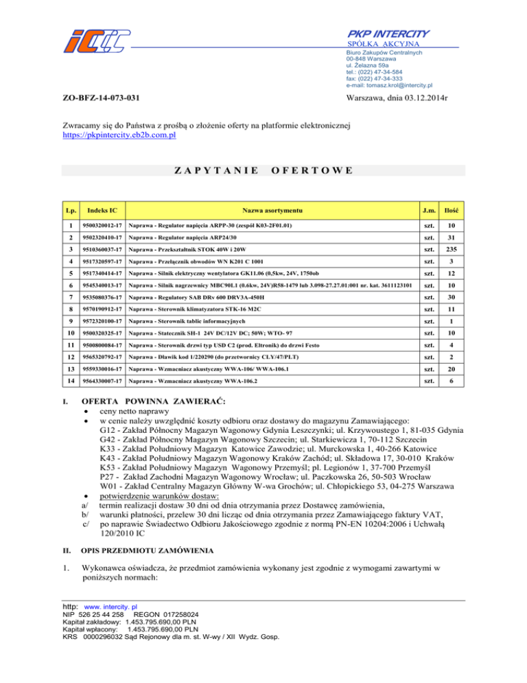SPÓŁKA AKCYJNA Biuro Zakupów Centralnych 00-848 Warszawa ul. Żelazna 59a tel.: (022) 47-34-584 fax: (022) 47-34-333 e-mail: [email protected] ZO-BFZ-14-073-031 Warszawa, dnia 03.12.2014r Zwracamy się do Państwa z prośbą o złożenie oferty na platformie elektronicznej https://pkpintercity.eb2b.com.pl ZAPYTANIE OFERTOWE J.m. Ilość Naprawa - Regulator napięcia ARPP-30 (zespół K03-2F01.01) szt. 10 Naprawa - Regulator napięcia ARP24/30 szt. 31 9510360037-17 Naprawa - Przekształtnik STOK 40W i 20W szt. 235 4 9517320597-17 Naprawa - Przełącznik obwodów WN K201 C 1001 szt. 3 5 9517340414-17 Naprawa - Silnik elektryczny wentylatora GK11.06 (0,5kw, 24V, 1750ob szt. 12 6 9545340013-17 Naprawa - Silnik nagrzewnicy MBC90L1 (0.6kw, 24V)R58-1479 lub 3.098-27.27.01:001 nr. kat. 3611123101 szt. 10 7 9535080376-17 Naprawa - Regulatory SAB DRv 600 DRV3A-450H szt. 30 8 9570190912-17 Naprawa - Sterownik klimatyzatora STK-16 M2C szt. 11 9 9572320100-17 Naprawa - Sterownik tablic informacyjnych szt. 1 10 9500320325-17 Naprawa - Statecznik SH-1 24V DC/12V DC; 50W; WTO- 97 szt. 10 11 9500800084-17 Naprawa - Sterownik drzwi typ USD C2 (prod. Eltronik) do drzwi Festo szt. 4 12 9565320792-17 Naprawa - Dławik kod 1/220290 (do przetwornicy CLY/47/PLT) szt. 2 13 9559330016-17 Naprawa - Wzmacniacz akustyczny WWA-106/ WWA-106.1 szt. 20 14 9564330007-17 Naprawa - Wzmacniacz akustyczny WWA-106.2 szt. 6 Lp. Indeks IC 1 9500320012-17 2 9502320410-17 3 Nazwa asortymentu I. OFERTA POWINNA ZAWIERAĆ: ceny netto naprawy w cenie należy uwzględnić koszty odbioru oraz dostawy do magazynu Zamawiającego: G12 - Zakład Północny Magazyn Wagonowy Gdynia Leszczynki; ul. Krzywoustego 1, 81-035 Gdynia G42 - Zakład Północny Magazyn Wagonowy Szczecin; ul. Starkiewicza 1, 70-112 Szczecin K33 - Zakład Południowy Magazyn Katowice Zawodzie; ul. Murckowska 1, 40-266 Katowice K43 - Zakład Południowy Magazyn Wagonowy Kraków Zachód; ul. Składowa 17, 30-010 Kraków K53 - Zakład Południowy Magazyn Wagonowy Przemyśl; pl. Legionów 1, 37-700 Przemyśl P27 - Zakład Zachodni Magazyn Wagonowy Wrocław; ul. Paczkowska 26, 50-503 Wrocław W01 - Zakład Centralny Magazyn Główny W-wa Grochów; ul. Chłopickiego 53, 04-275 Warszawa potwierdzenie warunków dostaw: a/ termin realizacji dostaw 30 dni od dnia otrzymania przez Dostawcę zamówienia, b/ warunki płatności, przelew 30 dni licząc od dnia otrzymania przez Zamawiającego faktury VAT, c/ po naprawie Świadectwo Odbioru Jakościowego zgodnie z normą PN-EN 10204:2006 i Uchwałą 120/2010 IC II. OPIS PRZEDMIOTU ZAMÓWIENIA 1. Wykonawca oświadcza, że przedmiot zamówienia wykonany jest zgodnie z wymogami zawartymi w poniższych normach: http: www. intercity. pl NIP 526 25 44 258 REGON 017258024 Kapitał zakładowy: 1.453.795.690,00 PLN Kapitał wpłacony: 1.453.795.690,00 PLN KRS 0000296032 Sąd Rejonowy dla m. st. W-wy / XII Wydz. Gosp. SPÓŁKA AKCYJNA Biuro Zakupów Centralnych 00-848 Warszawa ul. Żelazna 59a tel.: (022) 47-34-584 fax: (022) 47-34-333 e-mail: [email protected] Nazwa asortymentu Zamawiający wymaga, aby przedmiot zamówienia spełniał niżej wymienione warunki Lp. Indeks IC 1 9500320012-17 Regulator napięcia ARPP-30 (zespół K03-2F01.01) PN-EN 50155:2007 2 9502320410-17 Regulator napięcia ARP24/30 - do naprawy PN-EN 50155:2007 3 9510360037-17 Przekształtnik STOK 40W i 20W PN-EN 50155:2007 4 9517320597-17 Przełącznik obwodów WN K201 C 1001 - do naprawy PN-EN 50155:2007 5 9517340414-17 Silnik elektryczny wentylatora GK11.06 (0,5kw, 24V, 1750ob PN-EN 50155:2007 6 9545340013-17 Silnik nagrzewnicy MBC90L1 (0.6kw, 24V)R58-1479 lub 3.098-27.27.01:001 nr. kat. 3611123101 - do naprawy PN-EN 61377-2:2003 7 9535080376-17 Regulatory SAB DRv 600 DRV3A-450H - do naprawy PN-EN 50155:2007 8 9570190912-17 Sterownik klimatyzatora STK-16 M2C PN-EN 50155:2007 9 9572320100-17 Sterownik tablic informacyjnych PN-EN 50155:2007 10 9500320325-17 Statecznik SH-1 24V DC/12V DC; 50W; WTO- 97 PN-EN 50155:2007 11 9500800084-17 Sterownik drzwi typ USD C2 (prod. Eltronik) do drzwi Festo PN-EN 14752:2006E 12 9565320792-17 Dławik kod 1/220290 (do przetwornicy CLY/47/PLT) PN-EN 60310:2004 13 9559330016-17 Wzmacniacz akustyczny WWA-106/ WWA-106.1 WTWiO...WTO-Eltr/2001-WWA-106 i WTO-Eltr/2001-WWA106Aneks - Warunki Techniczne Wykonania i Odbioru wzmacniaczy. 14 9564330007-17 Wzmacniacz akustyczny WWA-106.2 WTWiO...WTO-Eltr/2001-WWA-106 i WTO-Eltr/2001-WWA106Aneks - Warunki Techniczne Wykonania i Odbioru wzmacniaczy. 1. 2. 3. 4. 5. 6. 7. Wykonawca zobowiązuje się, by w trakcie wykonywania naprawy, zostały wykonane wszystkie badania i próby przewidziane obowiązującymi Instrukcjami, odpowiednimi Polskimi Normami, kartami UIC itp., obowiązującymi w okresie trwania umowy. Wykonawca dołączy do oferty oświadczenie lub dokumenty stwierdzające zgodność wyrobu z normami wskazanymi w opisie przedmiotu zamówienia. Naprawiane powyżej podzespoły do taboru wagonowego stanowiące przedmiot umowy podlegają odbiorowi przez Komisarza Odbiorczego „PKP Intercity” S.A. zgodnie z Uchwałą Nr 120/2010 „PKP Intercity” S.A. z dnia 9 lutego 2010r. Wykonawca ponosi wszelkie koszty związane z dokonaniem odbiorów komisarycznych przez Komisarzy Odbiorczych „PKP Intercity” S.A. wyrobów naprawianych Zamawiającemu. Naprawa podzespołów będzie wykonywana zgodnie z dokumentacją techniczną a także odpowiednimi Europejskimi Normami, Polskimi Normami i Kartami UIC, zgodnie z dokumentacją techniczną oraz DTR, WTW i O. Przedmiot zamówienia musi posiadać Świadectwo Odbioru Jakościowego wystawione przez Wykonawcę, stwierdzające zgodność wyrobu z normami wskazanymi w ustępie dla typu i rodzaju asortymentu wymiennego w zadaniach. Zamawiający zastrzega sobie możliwość sprawdzania prawidłowości procesu technologicznego Wykonawcy, poprzez przeprowadzanie audytów u wykonawcy. III. ZAŁĄCZNIKI DO OFERTY (wymagane od wybranego oferenta przed udzieleniem zamówieni