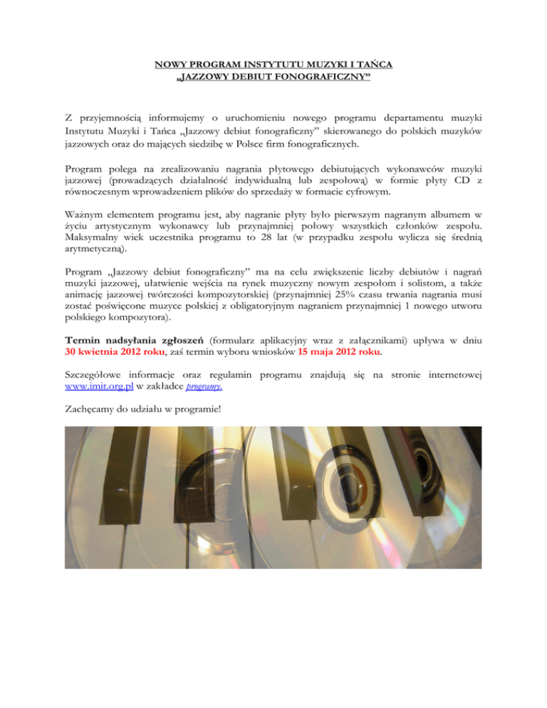 NOWY PROGRAM INSTYTUTU MUZYKI I TAŃCA „JAZZOWY DEBIUT FONOGRAFICZNY” Z przyjemnością informujemy o uruchomieniu nowego programu departamentu muzyki Instytutu Muzyki i Tańca „Jazzowy debiut fonograficzny” skierowanego do polskich muzyków jazzowych oraz do mających siedzibę w Polsce firm fonograficznych. Program polega na zrealizowaniu nagrania płytowego debiutujących wykonawców muzyki jazzowej (prowadzących działalność indywidualną lub zespołową) w formie płyty CD z równoczesnym wprowadzeniem plików do sprzedaży w formacie cyfrowym. Ważnym elementem programu jest, aby nagranie płyty było pierwszym nagranym albumem w życiu artystycznym wykonawcy lub przynajmniej połowy wszystkich członków zespołu. Maksymalny wiek uczestnika programu to 28 lat (w przypadku zespołu wylicza się średnią arytmetyczną). Program „Jazzowy debiut fonograficzny” ma na celu zwiększenie liczby debiutów i nagrań muzyki jazzowej, ułatwienie wejścia na rynek muzyczny nowym zespołom i solistom, a także animację jazzowej twórczości kompozytorskiej (przynajmniej 25% czasu trwania nagrania musi zostać poświęcone muzyce polskiej z obligatoryjnym nagraniem przynajmniej 1 nowego utworu polskiego kompozytora). Termin nadsyłania zgłoszeń (formularz aplikacyjny wraz z załącznikami) upływa w dniu 30 kwietnia 2012 roku, zaś termin wyboru wniosków 15 maja 2012 roku. Szczegółowe informacje oraz regulamin programu znajdują się na stronie internetowej www.imit.org.pl w zakładce programy. Zachęcamy do udziału w programie!