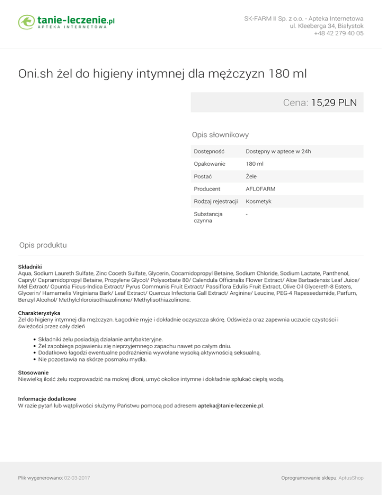 SK-FARM II Sp. z o.o. - Apteka Internetowa ul. Kleeberga 34, Białystok +48 42 279 40 05 Oni.sh żel do higieny intymnej dla mężczyzn 180 ml Cena: 15,29 PLN Opis słownikowy Dostępność Dostępny w aptece w 24h Opakowanie 180 ml Postać Żele Producent AFLOFARM Rodzaj rejestracji Kosmetyk Substancja czynna - Opis produktu Składniki Aqua, Sodium Laureth Sulfate, Zinc Coceth Sulfate, Glycerin, Cocamidopropyl Betaine, Sodium Chloride, Sodium Lactate, Panthenol, Capryl/ Capramidopropyl Betaine, Propylene Glycol/ Polysorbate 80/ Calendula Officinalis Flower Extract/ Aloe Barbadensis Leaf Juice/ Mel Extract/ Opuntia Ficus-Indica Extract/ Pyrus Communis Fruit Extract/ Passiflora Edulis Fruit Extract, Olive Oil Glycereth-8 Esters, Glycerin/ Hamamelis Virginiana Bark/ Leaf Extract/ Quercus Infectoria Gall Extract/ Arginine/ Leucine, PEG-4 Rapeseedamide, Parfum, Benzyl Alcohol/ Methylchloroisothiazolinone/ Methylisothiazolinone. Charakterystyka Żel do higieny intymnej dla mężczyzn. Łagodnie myje i dokładnie oczyszcza skórę. Odświeża oraz zapewnia uczucie czystości i świeżości przez cały dzień Składniki żelu posiadają działanie antybakteryjne. Żel zapobiega pojawieniu się nieprzyjemnego zapachu nawet po całym dniu. Dodatkowo łagodzi ewentualne podrażnienia wywołane wysoką aktywnością seksualną. Nie pozostawia na skórze posmaku mydła. Stosowanie Niewielką ilość żelu rozprowadzić na mokrej dłoni, umyć okolice intymne i dokładnie spłukać ciepłą wodą. Informacje dodatkowe W razie pytań lub wątpliwości służymy Państwu pomocą pod adresem [email protected]. Plik wygenerowano: 02-03-2017 Powered by TCPDF (www.tcpdf.org) Oprogramowanie sklepu: AptusShop