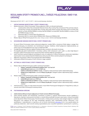 REGULAMIN OFERTY PROMOCYJNEJ „TAŃSZE POŁĄCZENIA I SMS-Y NA UKRAINĘ” Obowiązuje od 26.01.2017 r. do 31.12.2017 r. lub do wcześniejszego odwołania. I. OGÓLNE WARUNKI SKORZYSTANIA Z OFERTY PROMOCYJNEJ 1. 2. Możesz skorzystać z Oferty Promocyjnej "Tańsze połączenia i SMS-y na Ukrainę" jeżeli jesteś: 1.1. Użytkownikiem oferty Play na Kartę Rok Ważności Konta, Play na Kartę, Play na Kartę Surf, Play na Kartę Lubię to!, Formuła Play na Kartę, Formuła Mini Max na Kartę, Nowy Play Online na Kartę, Play Online 4GLTE na Kartę, Play Internet na Kartę, Red Bull MOBILE na kartę, Red Bull MOBILE na kartę MNP, Red Bull MOBILE na kartę 5 zł, Red Bull MOBILE Energy na kartę. 1.2. Abonentem MIX II w ramach oferty Play Mixtura III 1.3. Abonentem MIX III w ramach oferty FORMUŁA MIX i Elastyczna FORMUŁA MIX Możesz włączyć Ofertę Promocyjną od 26.01.2017 r. do 31.12.2017 r. lub do wcześniejszego odwołania. II. SZCZEGÓŁOWE WARUNKI KORZYSTANIA Z OFERTY PROMOCYJNEJ 3. 7. 8. W ramach Oferty Promocyjnej możesz wykonywać połączenia i wysyłać SMS-y z terytorium Polski, będąc w zasięgu Sieci Telekomunikacyjnej, do ukraińskich sieci komórkowych Kyivstar, Vodafone, Lifecell (połączenia międzynarodowe), po stawce 29 gr za minutę połączenia oraz 29 gr za wiadomość SMS. Za połączenia głosowe naliczamy opłatę za każdą sekundę w wysokości 1/60 stawki minutowej. W przypadku gdy jesteś Użytkownikiem i korzystasz z jednej z ofert wskazanych w pkt 1 ppkt. 1.1, abyś mógł włączyć i korzystać z Oferty Promocyjnej musisz utrzymywać Okres ważności połączeń wychodzących. Jeżeli Twój Okres ważności połączeń wychodzących minie, nie wyłączymy Ci Oferty Promocyjnej. Jednak abyś mógł dalej z niej korzystać musisz wykonać dowolne Doładowanie, które przywróci Okres ważności połączeń wychodzących. Włączenie i korzystanie z Oferty Promocyjnej jest dla Ciebie bezpłatne. Aktywujemy Ofertę Promocyjną na Twoim numerze w ciągu 24 godzin. III. AKTYWACJA I KORZYSTANIE Z OFERTY PROMOCYJNEJ 9. Możesz włączyć Ofertę Promocyjną w jeden z poniższych sposobów : a. wybierz i zatwierdź na klawiaturze telefonu kod: *111*201*1# b. wyślij SMS pod numer 111 o treści START.201 c. wybierz na klawiaturze telefonu *111#, a następnie w sekcji promocje wybierz odpowiednią opcję, d. zaloguj się na swoje konto w serwisie Play24 (24.play.pl) i następnie wybierz odpowiednią opcję w zakładce „Pakiety” Możesz wyłączyć Ofertę Promocyjną w jeden z poniższych sposobów: a. wybierz i zatwierdź na klawiaturze telefonu kod: *111*201*2# b. wyślij SMS pod numer 111: STOP.201 c. wybierz na klawiaturze telefonu *111#, a następnie w sekcji promocje wybrać odpowiednią opcję, d. zaloguj się na swoje konto w serwisie Play24 (24.play.pl) i następnie wybierz odpowiednią opcję w zakładce „Pakiety” Jeżeli skorzystasz z usługi, to wciąż możesz korzystać z innych Ofert Promocyjnych dostępnych w Twojej ofercie, chyba, że warunki innych Ofert Promocyjnych stanowią inaczej. 4. 5. 6. 10. 11. IV. POSTANOWIENIA KOŃCOWE 12. 13. Jeżeli zmienisz ofertę na inną to wyłączymy na Twoim numerze Ofertę Promocyjną. Jeżeli ukraiński operator sieci komórkowej, wymieniony w punkcie 3, wypowie dotychczasowe warunki współpracy z Operatorem, Operator może powrócić do stawki, w ramach której zawierałeś Umowę (a więc stawki, z których korzystałeś przed włączeniem Oferty Promocyjnej). Powrót do stawki, o której piszemy powyżej, może nastąpić wyłącznie w zakresie dotyczącym ceny połączeń do sieci tego ukraińskiego operatora, który wypowiedział warunki. Informacje o tym opublikujemy z wyprzedzeniem co najmniej 14 dni na stronie internetowej www.play.pl lub w inny sposób podany do publicznej wiadomości. Jeżeli warunki zostaną wypowiedziane przez wszystkich operatorów wymienionych w punkcie 3, P4 Sp. z o.o., ul. Taśmowa 7, 02-677 Warszawa, Sąd Rejonowy dla m. st. Warszawy w Warszawie XIII Wydział Gospodarczy Krajowego Rejestru Sądowego, KRS 0000217207, REGON 015808609, NIP 951-21-20-077, kapitał zakładowy 48 856 500 zł REGULAMIN OFERTY PROMOCYJNEJ STRONA 1 Z 2 14. 15. 16. 17. 18. 19. możemy odwołać tę Ofertę Promocyjną. Informację o odwołaniu usługi opublikujemy na stronie internetowej www.play.pl lub w inny sposób podany do wiadomości publicznej Wszystkie wyrazy lub wyrażenia jakie napisaliśmy w regulaminie dużą literą, należy rozumieć zgodnie z ich definicją w Regulaminie świadczenia Usług Telekomunikacyjnych przez P4 sp. z o.o. dla Użytkowników lub Cenniku oferty , z której korzystasz. W sprawach nieuregulowanych regulaminem, stosuje się postanowienia dokumentów wskazanych w punkcie 14. Jeżeli będą rozbieżności między regulaminem a dokumentami z punktu 14, to postanowienia tego regulaminu będą miały charakter nadrzędny. W ramach niniejszej usługi zobowiązujesz się, że: 17.1. nie będziesz kierował bez zgody Operatora, do Sieci Telekomunikacyjnej lub sieci innych przedsiębiorców telekomunikacyjnych, za pomocą jakichkolwiek urządzeń telekomunikacyjnych, przy użyciu Twojej Karty SIM/USIM ruchu pochodzącego z innych sieci telekomunikacyjnych; 17.2. nie będziesz stosował bez zgody Operatora urządzeń umożliwiających dostęp do Sieci Telekomunikacyjnej lub realizowanie połączeń za pomocą urządzeń końcowych przeznaczonych do przyłączenia do sieci stacjonarnej lub działających na podobnej zasadzie, w których wykorzystywane będą karty SIM/USIM działające w Sieci Telekomunikacyjnej; 17.3. nie będziesz generował sztucznego ruchu, który nie służy wymianie informacji; 17.4. nie będziesz używał Karty SIM/USIM w rozwiązaniach telemetrycznych; 17.5. nie będziesz używał Karty SIM/USIM do ruchu generowanego maszynowo, w szczególności ruchu typu „maszyna do maszyny” lub „maszyna do użytkownika”; 17.6. nie będziesz uż