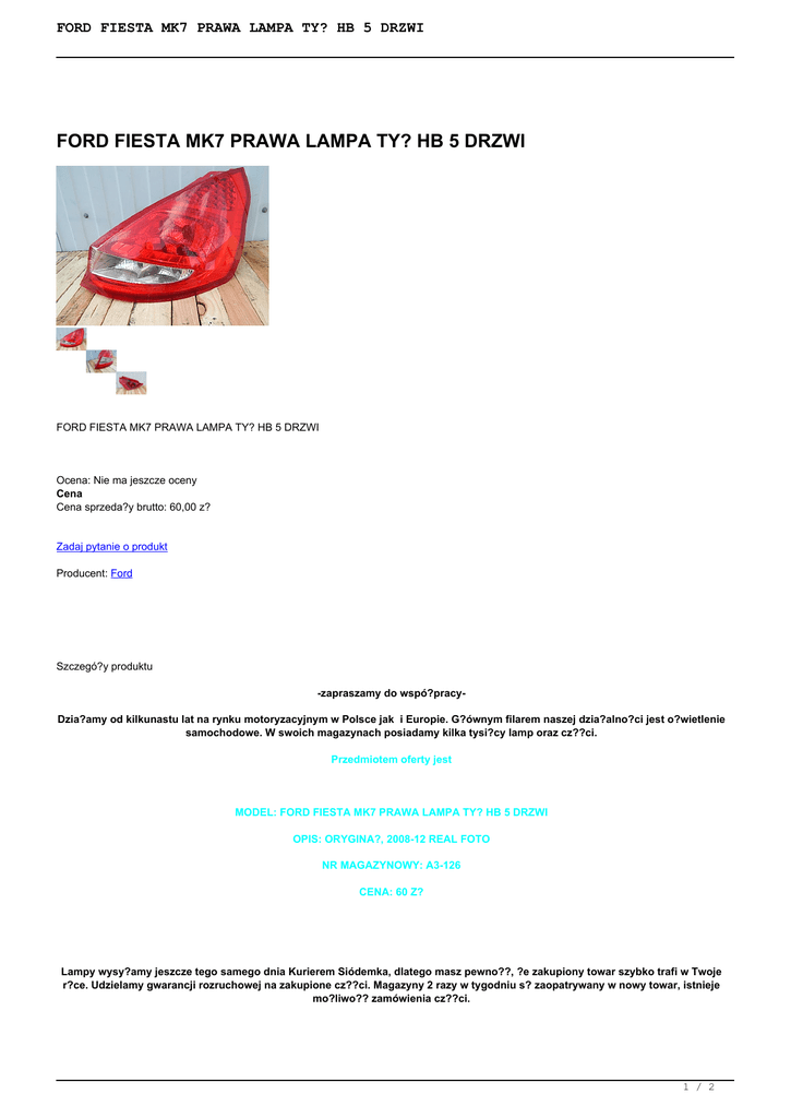 FORD FIESTA MK7 PRAWA LAMPA TY? HB 5 DRZWI FORD FIESTA MK7 PRAWA LAMPA TY? HB 5 DRZWI FORD FIESTA MK7 PRAWA LAMPA TY? HB 5 DRZWI Ocena: Nie ma jeszcze oceny Cena Cena sprzeda?y brutto: 60,00 z? Zadaj pytanie o produkt Producent: Ford Szczegó?y produktu -zapraszamy do wspó?pracyDzia?amy od kilkunastu lat na rynku motoryzacyjnym w Polsce jak i Europie. G?ównym filarem naszej dzia?alno?ci jest o?wietlenie samochodowe. W swoich magazynach posiadamy kilka tysi?cy lamp oraz cz??ci. Przedmiotem oferty jest MODEL: FORD FIESTA MK7 PRAWA LAMPA TY? HB 5 DRZWI OPIS: ORYGINA?, 2008-12 REAL FOTO NR MAGAZYNOWY: A3-126 CENA: 60 Z? Lampy wysy?amy jeszcze tego samego dnia Kurierem Siódemka, dlatego masz pewno??, ?e zakupiony towar szybko trafi w Twoje r?ce. Udzielamy gwarancji rozruchowej na zakupione cz??ci. Magazyny 2 razy w tygodniu s? zaopatrywany w nowy towar, istnieje mo?liwo?? zamówienia cz??ci. 1 / 2 FORD FIESTA MK7 PRAWA LAMPA TY? HB 5 DRZWI Zajmujemy si? równie? napraw?, regeneracj? i tuningiem reflektorów samochodowych. Siedziba firmy: Lampy Samochodowe P.Alwin Nowa 33 64-560 Ostroróg NIP: 783-160-38-97 TEL.: 739-020-099 513-531-967 [email protected] Drogi kliencie! Masz prawo zwrotu zakupionego towaru w ci?gu 14 dni bez podania przyczyny, niczym nie ryzykujesz. Jedyne koszty, których nie zwracamy to koszty wysy?ki. 2 / 2 Powered by TCPDF (www.tcpdf.org)