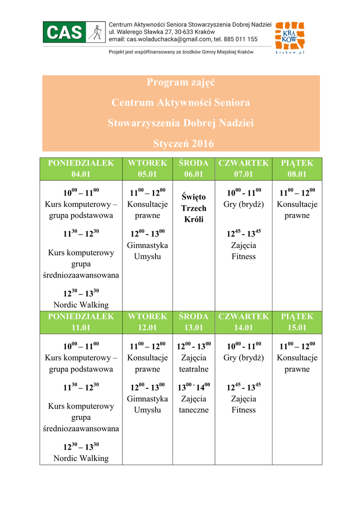 Program zajęć Centrum Aktywności Seniora Stowarzyszenia Dobrej Nadziei Styczeń 2016 PONIEDZIAŁEK 04.01 WTOREK 05.01 1000 – 1100 Kurs komputerowy – grupa podstawowa 1100 – 1200 Konsultacje prawne 1130 – 1230 1200 - 1300 Gimnastyka Umysłu Kurs komputerowy grupa średniozaawansowana ŚRODA 06.01 Święto Trzech Króli CZWARTEK 07.01 PIĄTEK 08.01 1000 - 1100 Gry (brydż) 1100 – 1200 Konsultacje prawne 1245 - 1345 Zajęcia Fitness 1230 – 1330 Nordic Walking PONIEDZIAŁEK 11.01 WTOREK 12.01 ŚRODA 13.01 CZWARTEK 14.01 PIĄTEK 15.01 1000 – 1100 Kurs komputerowy – grupa podstawowa 1100 – 1200 Konsultacje prawne 1200 - 1300 Zajęcia teatralne 1000 - 1100 Gry (brydż) 1100 – 1200 Konsultacje prawne 1130 – 1230 1200 - 1300 Gimnastyka Umysłu 1300 - 1400 Zajęcia taneczne 1245 - 1345 Zajęcia Fitness Kurs komputerowy grupa średniozaawansowana 1230 – 1330 Nordic Walking PONIEDZIAŁEK 18.01 WTOREK 19.01 ŚRODA 20.01 CZWARTEK 21.01 PIĄTEK 22.01 1000 – 1100 Kurs komputerowy – grupa podstawowa 1100 – 1200 Konsultacje prawne 1200 - 1300 Zajęcia teatralne 1000 - 1100 Gry (brydż) 1100 – 1200 Konsultacje prawne 1130 – 1230 1200 - 1300 Gimnastyka Umysłu 1300 - 1400 Zajęcia taneczne 1245 - 1345 Zajęcia Fitness 1230 – 1330 Nordic Walking PONIEDZIAŁEK 25.01 WTOREK 26.01 ŚRODA 27.01 CZWARTEK 28.01 1000 – 1100 Kurs komputerowy – grupa podstawowa 1100 – 1200 Konsultacje prawne 1200 - 1300 1000 - 1100 Zajęcia Gry (brydż) teatralne 1130 – 1230 1200 - 1300 Gimnastyka Umysłu 1300 - 1400 Zajęcia taneczne Kurs komputerowy grupa średniozaawansowana Kurs komputerowy grupa średniozaawansowana PIĄTEK 29.01 1100 – 1200 Konsultacje prawne 1245 - 1345 Zajęcia Fitness 1230 – 1330 Nordic Walking Planowane wydarzenia w styczniu: • Styczeń -przedstawienie bożonarodzeniowe studentów Animacji – Społeczno – Kulturowej UJ – termin do ustalenia • Styczeń – bal karnawałowy