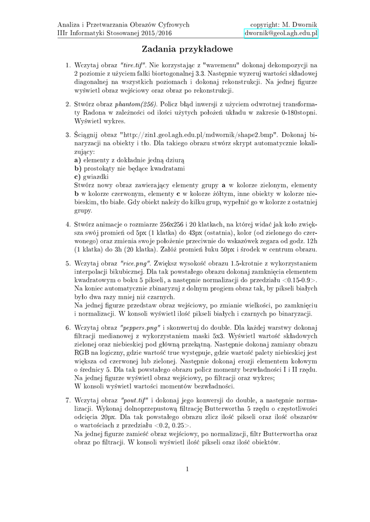 Analiza i Przetwarzania Obrazów Cyfrowych IIIr Informatyki Stosowanej 2015/2016 copyright: M. Dwornik [email protected] Zadania przykªadowe 1. Wczytaj obraz "tire.tif". Nie korzystaj¡c z "wavemenu" dokonaj dekompozycji na 2 poziomie z u»yciem falki biortogonalnej 3.3. Nast¦pnie wyzeruj warto±ci skªadowej diagonalnej na wszystkich poziomach i dokonaj rekonstrukcji. Na jednej gurze wy±wietl obraz wej±ciowy oraz obraz po rekonstrukcji. 2. Stwórz obraz phantom(256). Policz bª¡d inwersji z u»yciem odwrotnej transformaty Radona w zale»no±ci od ilo±ci u»ytych poªo»e« ukªadu w zakresie 0-180stopni. Wy±wietl wykres. 3. ci¡gnij obraz "http://zin1.geol.agh.edu.pl/mdwornik/shape2.bmp". Dokonaj binaryzacji na obiekty i tªo. Dla takiego obrazu stwórz skrypt automatycznie lokalizuj¡cy: a) elementy z dokªadnie jedn¡ dziur¡ b) prostok¡ty nie b¦d¡ce kwadratami c) gwiazdki Stwórz nowy obraz zawieraj¡cy elementy grupy a w kolorze zielonym, elementy b w kolorze czerwonym, elementy c w kolorze »óªtym, inne obiekty w kolorze niebieskim, tªo biaªe. Gdy obiekt nale»y do kilku grup, wypeªni¢ go w kolorze z ostatniej grupy. 4. Stwórz animacje o rozmiarze 256x256 i 20 klatkach, na której wida¢ jak koªo zwi¦ksza swój promie« od 5px (1 klatka) do 43px (ostatnia), kolor (od zielonego do czerwonego) oraz zmienia swoje poªo»enie przeciwnie do wskazówek zegara od godz. 12h (1 klatka) do 3h (20 klatka). Zaªó» promie« ªuku 50px i ±rodek w centrum obrazu. 5. Wczytaj obraz "rice.png". Zwi¦ksz wysoko±¢ obrazu 1.5-krotnie z wykorzystaniem interpolacji bikubicznej. Dla tak powstaªego obrazu dokonaj zamkni¦cia elementem kwadratowym o boku 5 pikseli, a nast¦pnie normalizacji do przedziaªu <0.15-0.9>. Na koniec automatycznie zbinaryzuj z dolnym progiem obraz tak, by pikseli biaªych byªo dwa razy mniej ni» czarnych. Na jednej gurze przedstaw obraz wej±ciowy, po zmianie wielko±ci, po zamkni¦ciu i normalizacji. W konsoli wy±wietl ilo±¢ pikseli biaªych i czarnych po binaryzacji. 6. Wczytaj obraz "peppers.png" i skonwertuj do double. Dla ka»dej warstwy dokonaj ltracji medianowej z wykorzystaniem maski 5x3. Wy±wietl warto±¢ skªadowych zielonej oraz niebieskiej pod gªówn¡ przek¡tn¡. Nast¦pnie dokonaj zamiany obrazu RGB na logiczny, gdzie warto±¢ true wyst¦puje, gdzie warto±¢ palety niebieskiej jest wi¦ksza od czerwonej lub zielonej. Nast¦pnie dokonaj erozji elementem koªowym o ±rednicy 5. Dla tak powstaªego obrazu policz momenty bezwªadno±ci I i II rz¦du. Na jednej gurze wy±wietl obraz wej±ciowy, po ltracji oraz wykres; W konsoli wy±wietl warto±ci momentów bezwªadno±ci. 7. Wczytaj obraz "pout.tif" i dokonaj jego konwersji do double, a nast¦pnie normalizacji. Wykonaj dolnoprzepustow¡ ltracj¦ Butterwortha 5 rz¦du o cz¦stotliwo±ci odci¦cia 20px. Dla tak powstaªego obrazu zlicz ilo±¢ pikseli oraz ilo±¢ obszarów o warto±ciach z przedziaªu <0.2, 0.25>. Na jednej gurze zamie±¢ obraz wej±ciowy, po normalizacji, ltr Butterwortha oraz obraz po ltracji. W konsoli wy±wietl ilo±¢ pikseli oraz ilo±¢ obiektów. 1