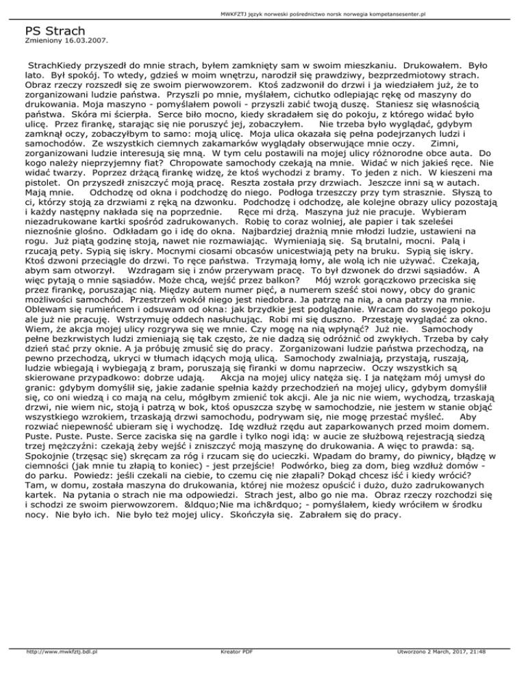 MWKFZTJ język norweski pośrednictwo norsk norwegia kompetansesenter.pl PS Strach Zmieniony 16.03.2007. StrachKiedy przyszedł do mnie strach, byłem zamknięty sam w swoim mieszkaniu. Drukowałem. Było lato. Był spokój. To wtedy, gdzieś w moim wnętrzu, narodził się prawdziwy, bezprzedmiotowy strach. Obraz rzeczy rozszedł się ze swoim pierwowzorem. Ktoś zadzwonił do drzwi i ja wiedziałem już, że to zorganizowani ludzie państwa. Przyszli po mnie, myślałem, cichutko odlepiając rękę od maszyny do drukowania. Moja maszyno - pomyślałem powoli - przyszli zabić twoją duszę. Staniesz się własnością państwa. Skóra mi ścierpła. Serce biło mocno, kiedy skradałem się do pokoju, z którego widać było ulicę. Przez firankę, starając się nie poruszyć jej, zobaczyłem. Nie trzeba było wyglądać, gdybym zamknął oczy, zobaczyłbym to samo: moją ulicę. Moja ulica okazała się pełna podejrzanych ludzi i samochodów. Ze wszystkich ciemnych zakamarków wyglądały obserwujące mnie oczy. Zimni, zorganizowani ludzie interesują się mną. W tym celu postawili na mojej ulicy różnorodne obce auta. Do kogo należy nieprzyjemny fiat? Chropowate samochody czekają na mnie. Widać w nich jakieś ręce. Nie widać twarzy. Poprzez drżącą firankę widzę, że ktoś wychodzi z bramy. To jeden z nich. W kieszeni ma pistolet. On przyszedł zniszczyć moją pracę. Reszta została przy drzwiach. Jeszcze inni są w autach. Mają mnie. Odchodzę od okna i podchodzę do niego. Podłoga trzeszczy przy tym strasznie. Słyszą to ci, którzy stoją za drzwiami z ręką na dzwonku. Podchodzę i odchodzę, ale kolejne obrazy ulicy pozostają i każdy następny nakłada się na poprzednie. Ręce mi drżą. Maszyna już nie pracuje. Wybieram niezadrukowane kartki spośród zadrukowanych. Robię to coraz wolniej, ale papier i tak szeleśei nieznośnie glośno. Odkładam go i idę do okna. Najbardziej drażnią mnie młodzi ludzie, ustawieni na rogu. Już piątą godzinę stoją, nawet nie rozmawiając. Wymieniają się. Są brutalni, mocni. Palą i rzucają pety. Sypią się iskry. Mocnymi ciosami obcasów unicestwiają pety na bruku. Sypią się iskry. Ktoś dzwoni przeciągle do drzwi. To ręce państwa. Trzymają łomy, ale wolą ich nie używać. Czekają, abym sam otworzył. Wzdragam się i znów przerywam pracę. To był dzwonek do drzwi sąsiadów. A więc pytają o mnie sąsiadów. Może chcą, wejść przez balkon? Mój wzrok gorączkowo przeciska się przez firankę, poruszając nią. Między autem numer pięć, a numerem sześć stoi nowy, obcy do granic możliwości samochód. Przestrzeń wokół niego jest niedobra. Ja patrzę na nią, a ona patrzy na mnie. Oblewam się rumieńcem i odsuwam od okna: jak brzydkie jest podglądanie. Wracam do swojego pokoju ale już nie pracuję. Wstrzymuję oddech nasłuchując. Robi mi się duszno. Przestaję wyglądać za okno. Wiem, że akcja mojej ulicy rozgrywa się we mnie. Czy mogę na nią wpłynąć? Już nie. Samochody pełne bezkrwistych ludzi zmieniają się tak często, że nie dadzą się odróżnić od zwykłych. Trzeba by cały dzień stać przy oknie. A ja próbuję zmusić się do pracy. Zorganizowani ludzie państwa przechodzą, na pewno przechodzą, ukryci w tłumach idących moją ulicą. Samochody zwalniają, przystają, ruszają, ludzie wbiegają i wybiegają z bram, poruszają się firanki w domu naprzeciw. Oczy wszystkich są skierowane przypadkowo: dobrze udają. Akcja na mojej ulicy natęża się. I ja natężam mój umysł do granic: gdybym domyślił się, jakie zadanie spełnia każdy przechodzień na mojej ulicy, gdybym domyślił się, co oni wiedzą i co mają na celu, mógłbym zmienić tok akcji. Ale ja nic nie wiem, wychodzą, trzaskają drzwi, nie wiem nic, stoją i patrzą w bok, ktoś opuszcza szybę w samochodzie, nie jestem w stanie objąć wszystkiego wzrokiem, trzaskają drzwi samochodu, podrywam się, nie mogę przestać myśleć. Aby rozwiać niepewność ubieram się i wychodzę. Idę wzdłuż rzędu aut zaparkowanych przed moim domem. Puste. Puste. Puste. Serce zaciska się na gardle i tylko nogi idą: w aucie ze służbową rejestracją siedzą trzej mężczyźni: czekają żeby wejść i zniszczyć moją maszynę do drukowania. A więc to prawda: są. Spokojnie (trzęsąc się) skręcam za róg i rzucam się do ucieczki. Wpadam do bramy, do piwnicy, błądzę w ciemności (jak mnie tu złapią to koniec) - jest przejście! Podwórko, bieg za dom, bieg wzdłuż domów do parku. Powiedz: jeśli czekali na ciebie, to czemu cię nie złapali? Dokąd chcesz iść i kiedy wrócić? Tam, w domu, została maszyna do drukowania, której nie możesz opuścić i dużo, dużo zadrukowanych kartek. Na pytania o strach nie ma odpowiedzi. Strach jest, albo go nie ma. Obraz rzeczy rozchodzi się i schodzi ze swoim pierwowzorem. “Nie ma ich” - pomyślałem, kiedy wróciłem w środku nocy. Nie było ich. Nie było też mojej ulicy. Skończyła się. Zabrałem się do pracy. http://www.mwkfztj.bdl.pl Kreator PDF Utworzono 2 March, 2017, 21:48
